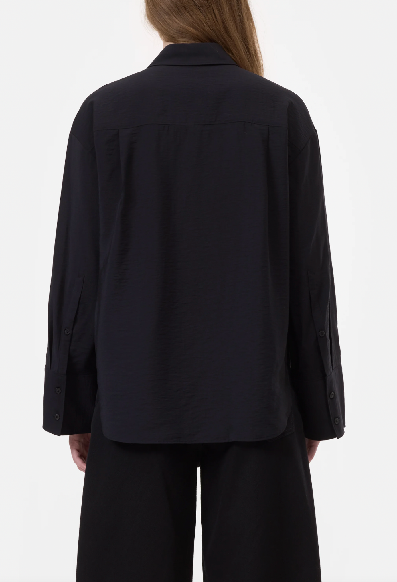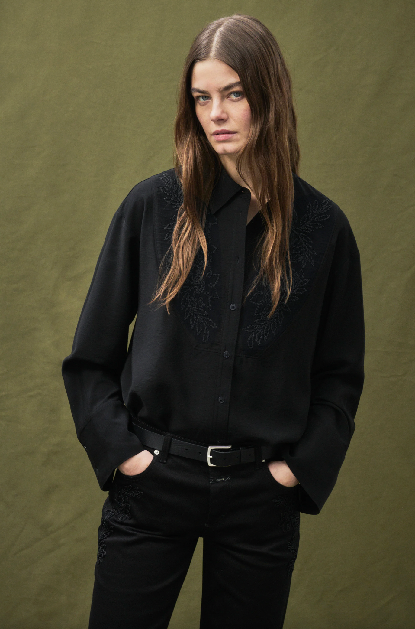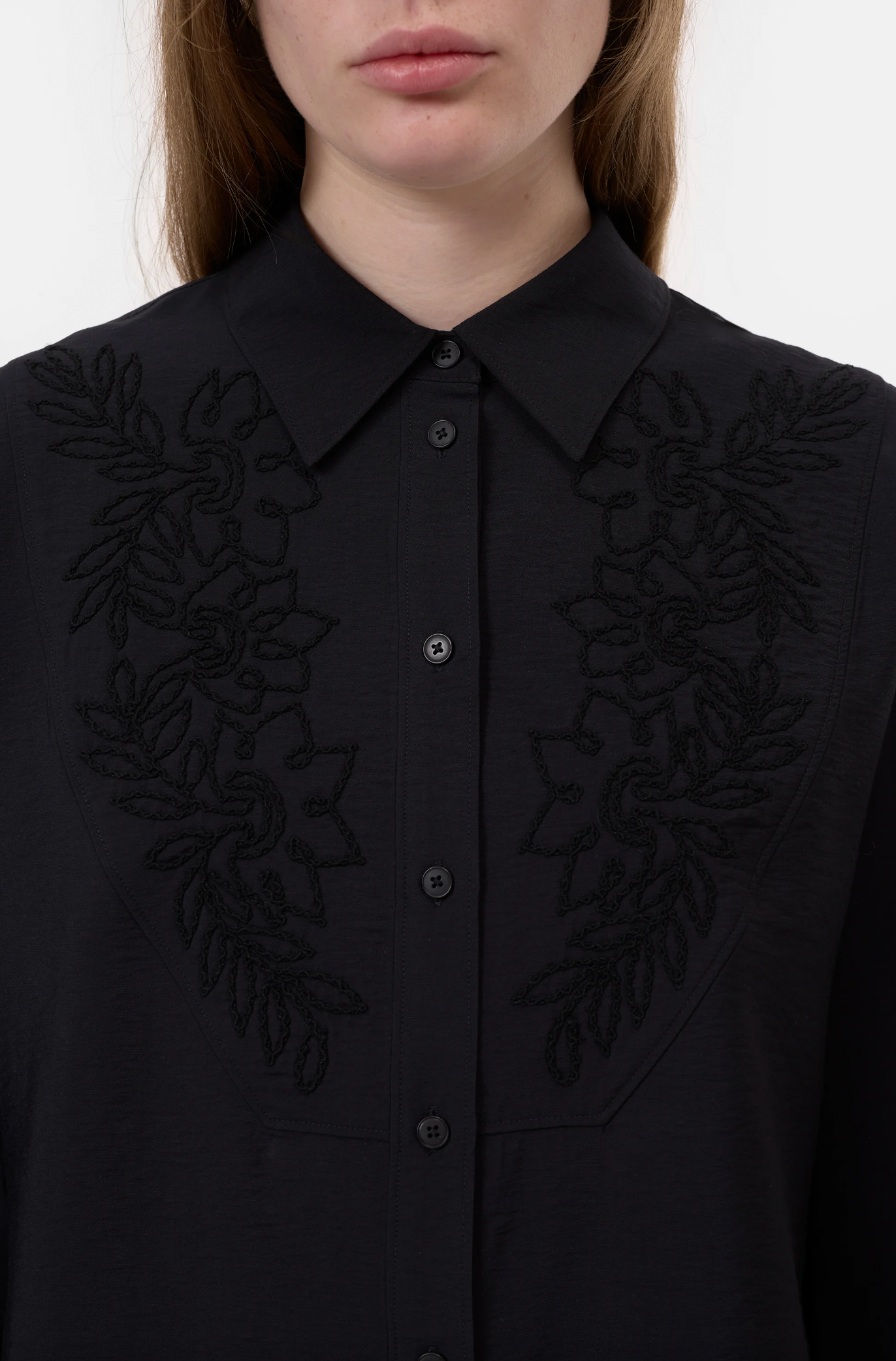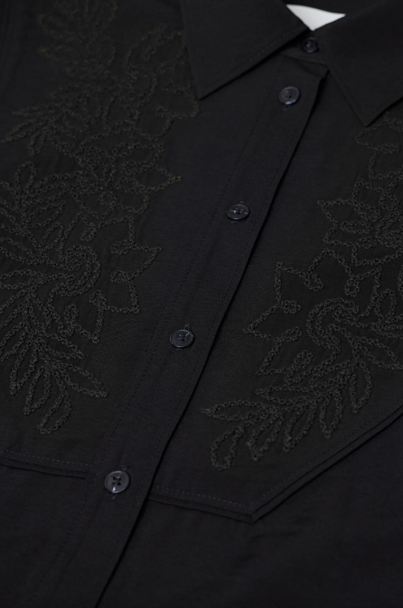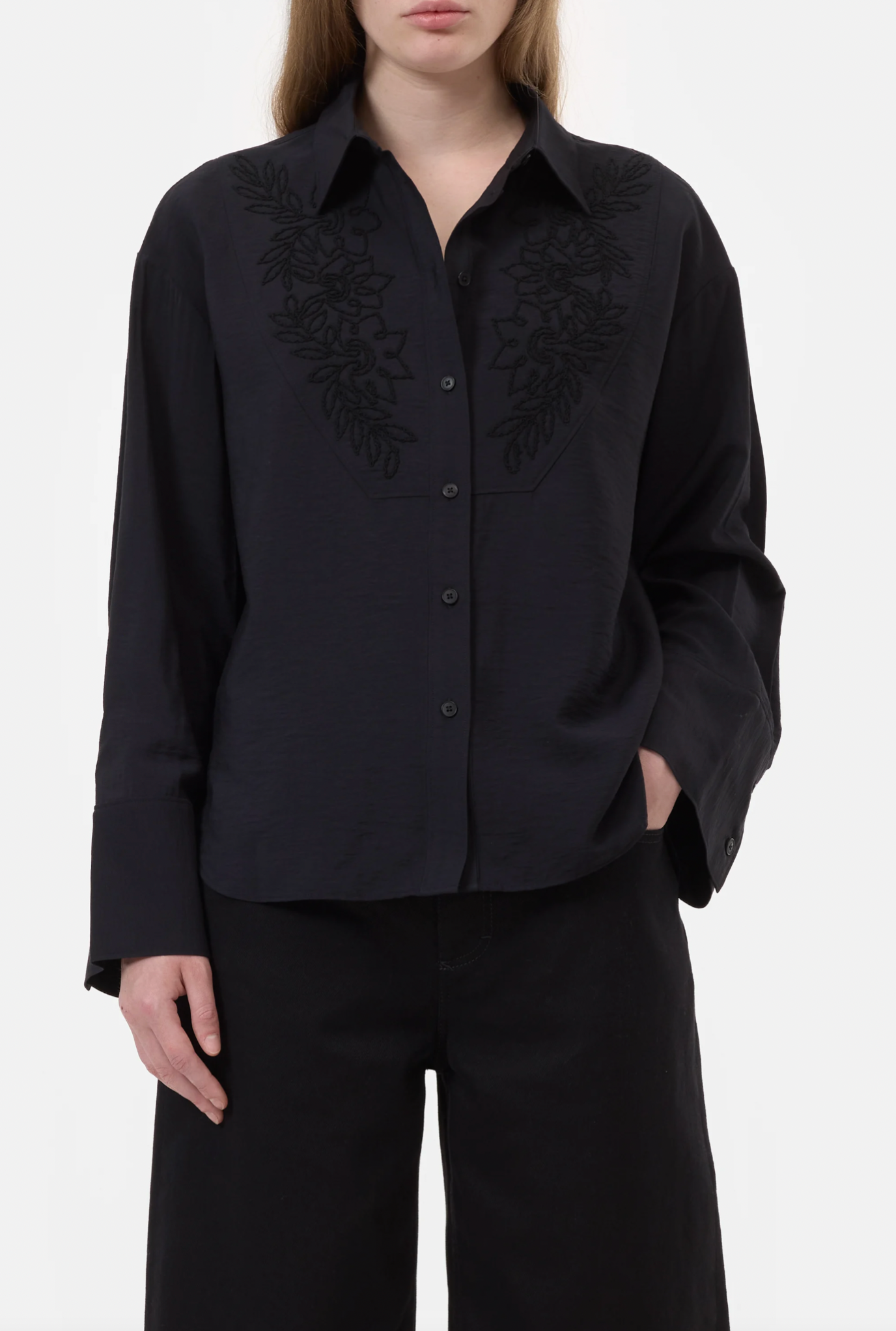 This shirt with an elaborate flower embroidery in shiny yarn features a relaxed silhouette. Crafted from a soft rayon blend. Finished with a front bib seam, our signature angled sleeve plackets, and a curved hem.