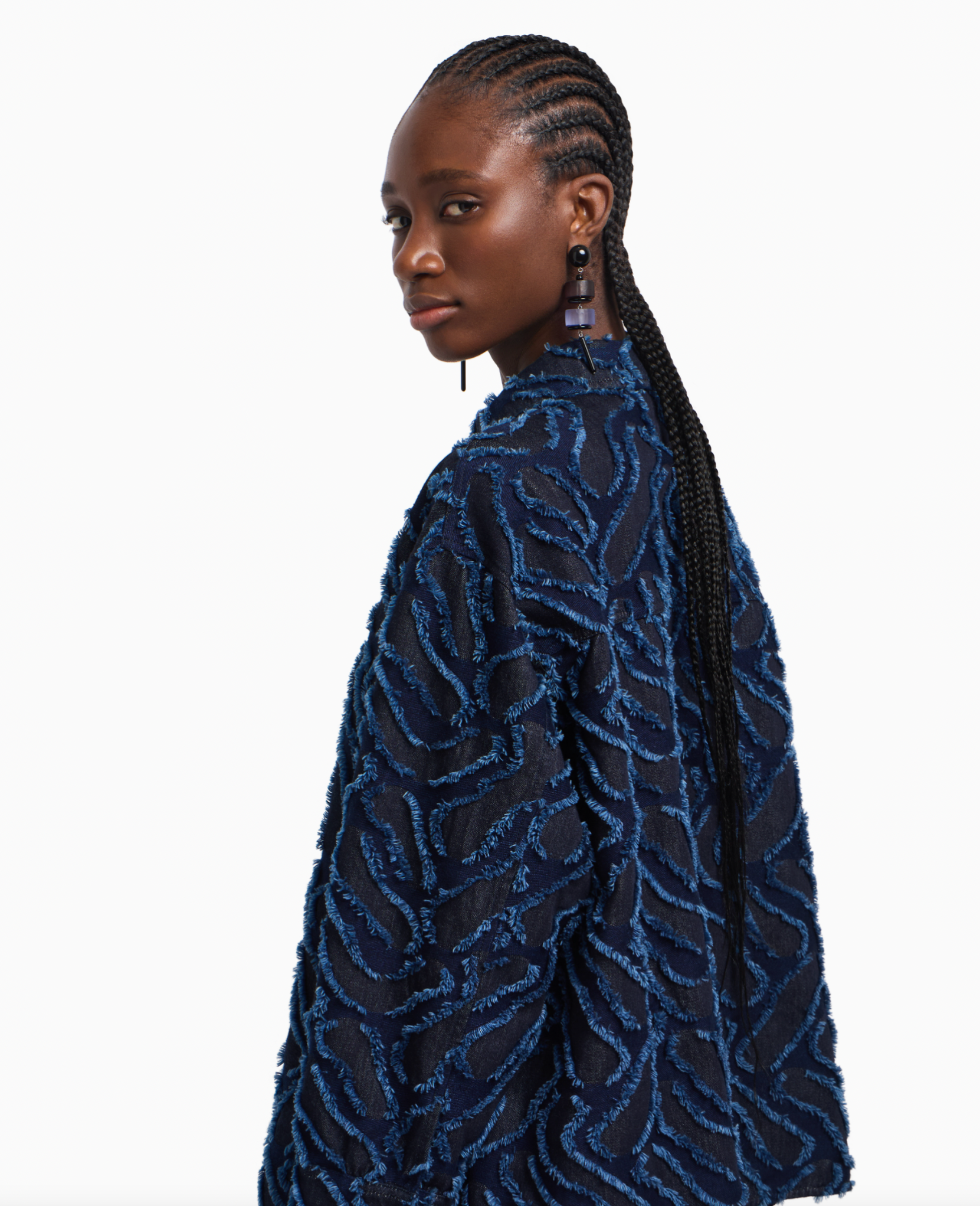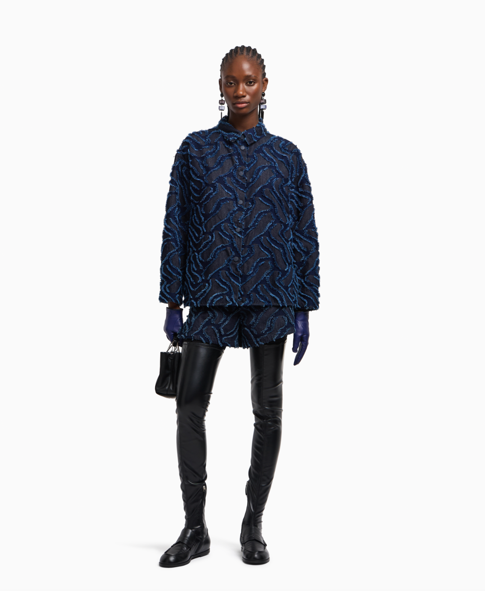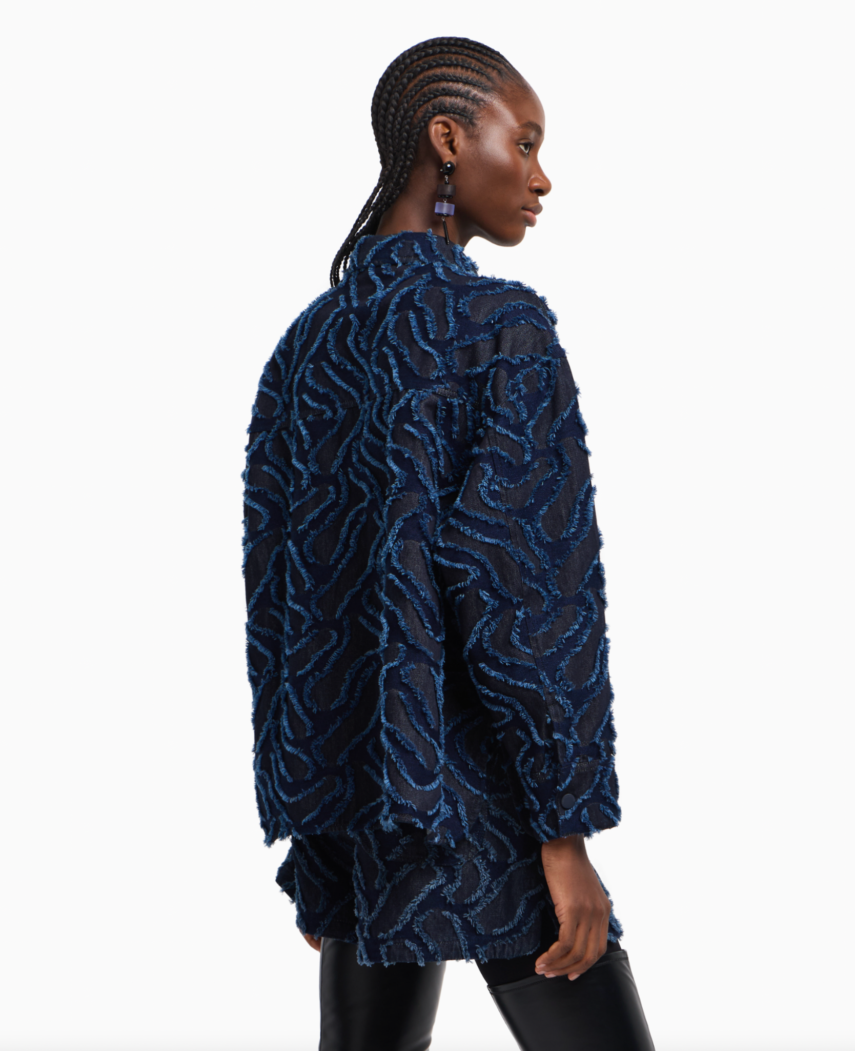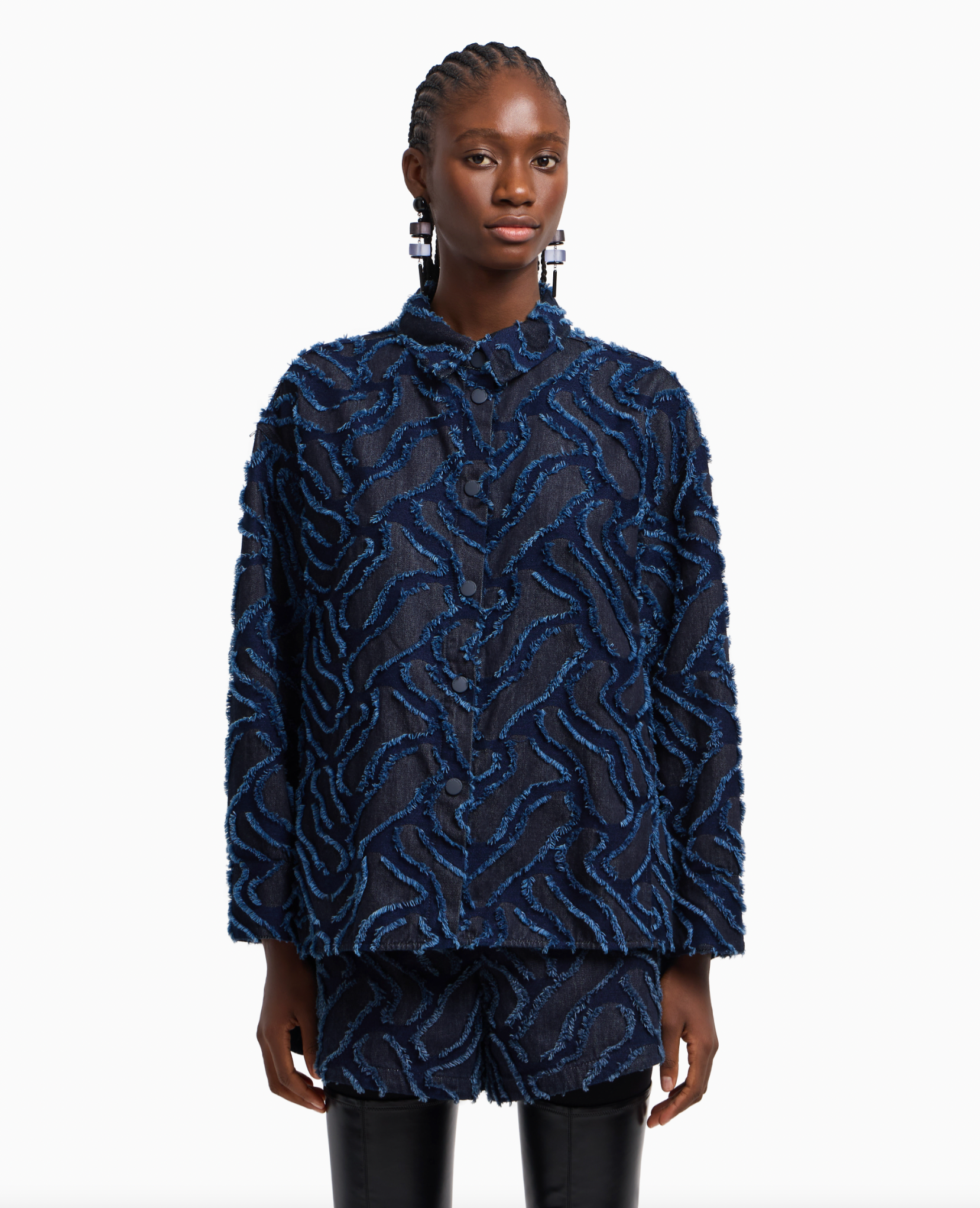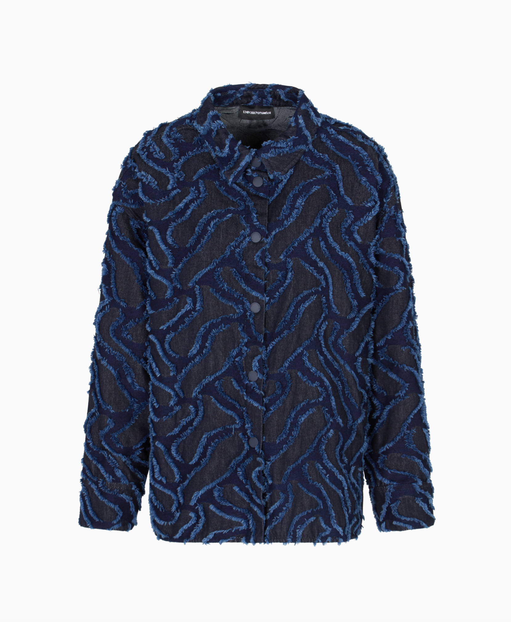 Denim shirt jacket with front buttoning with press studs. The style is embellished with a refined fringed embossed motif created by an all-over jacquard giving the piece a textured, original look.