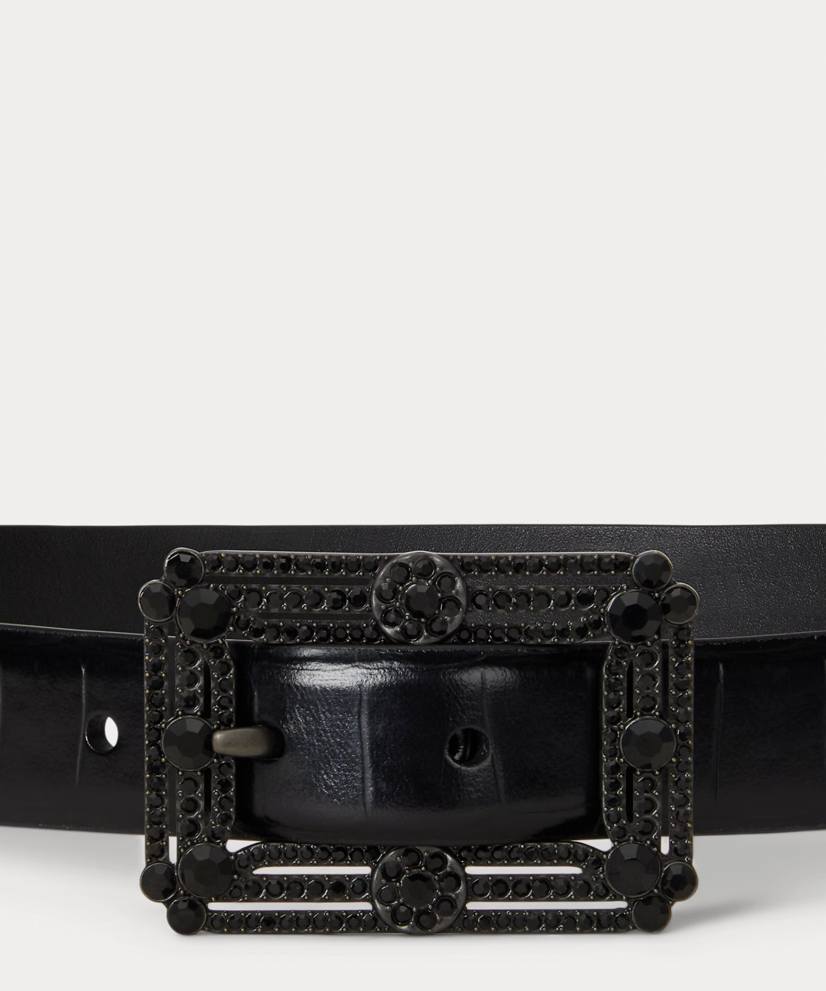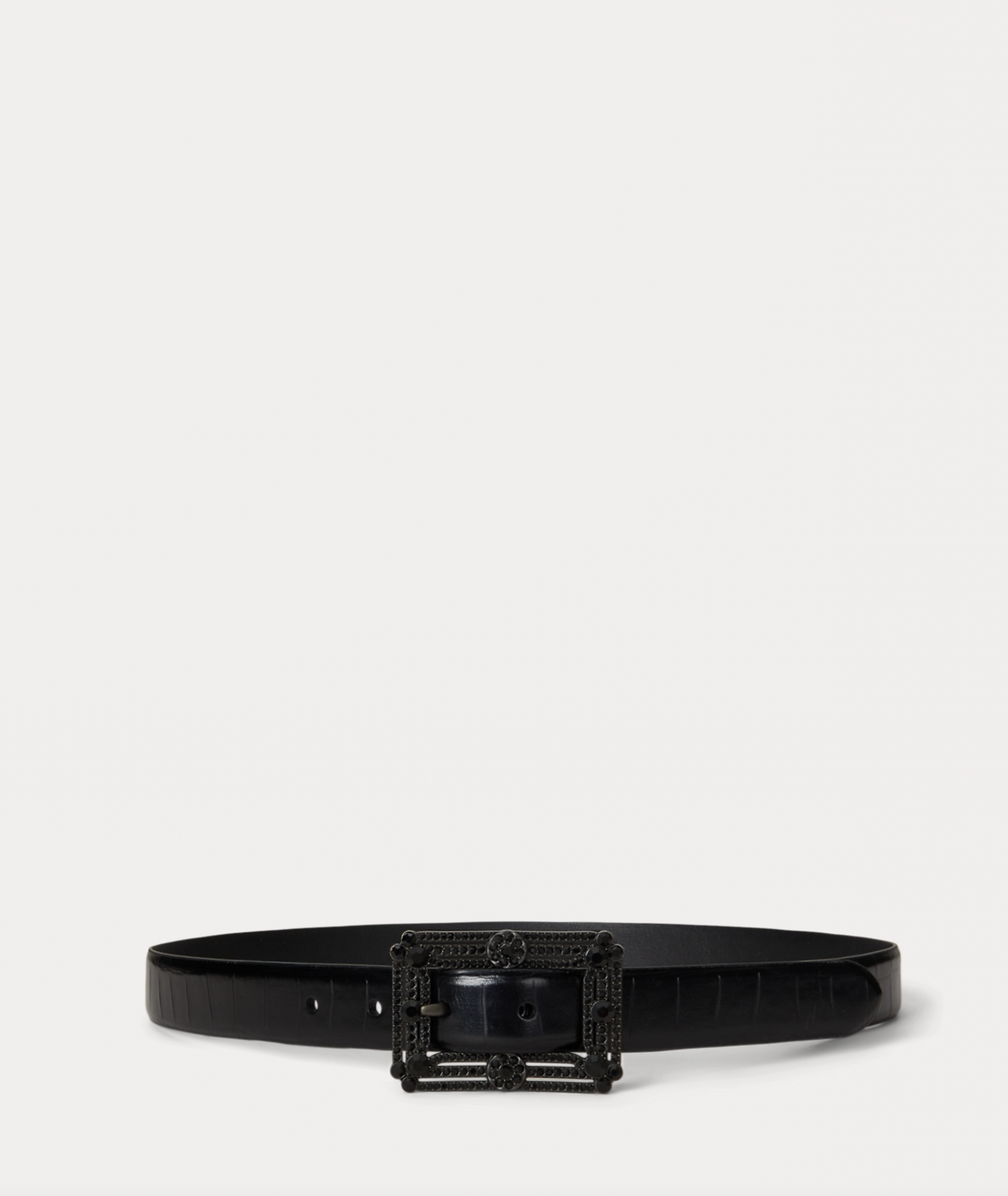 Rendered in glossy crocodile-embossed leather, this skinny belt is centred by an eye-catching buckle embellished with imitation gemstones and lined with supple full-grain leather – distinguished by its naturally smooth finish – for added sophistication.
