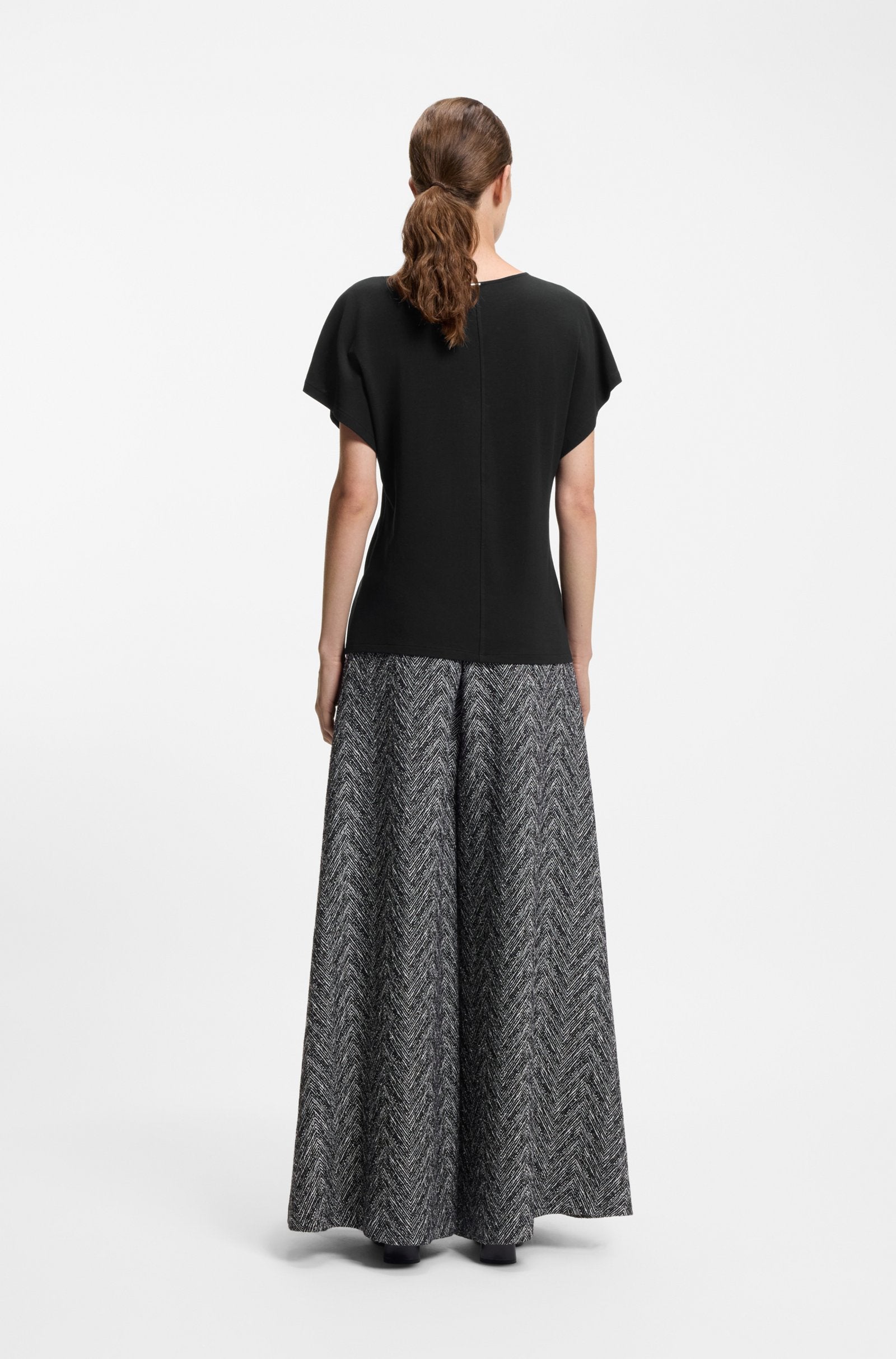 Create a variety of looks with the soft cotton crepe of this BOSS Womenswear top. Rear logo trim. Lustrous piping at shoulder seams.