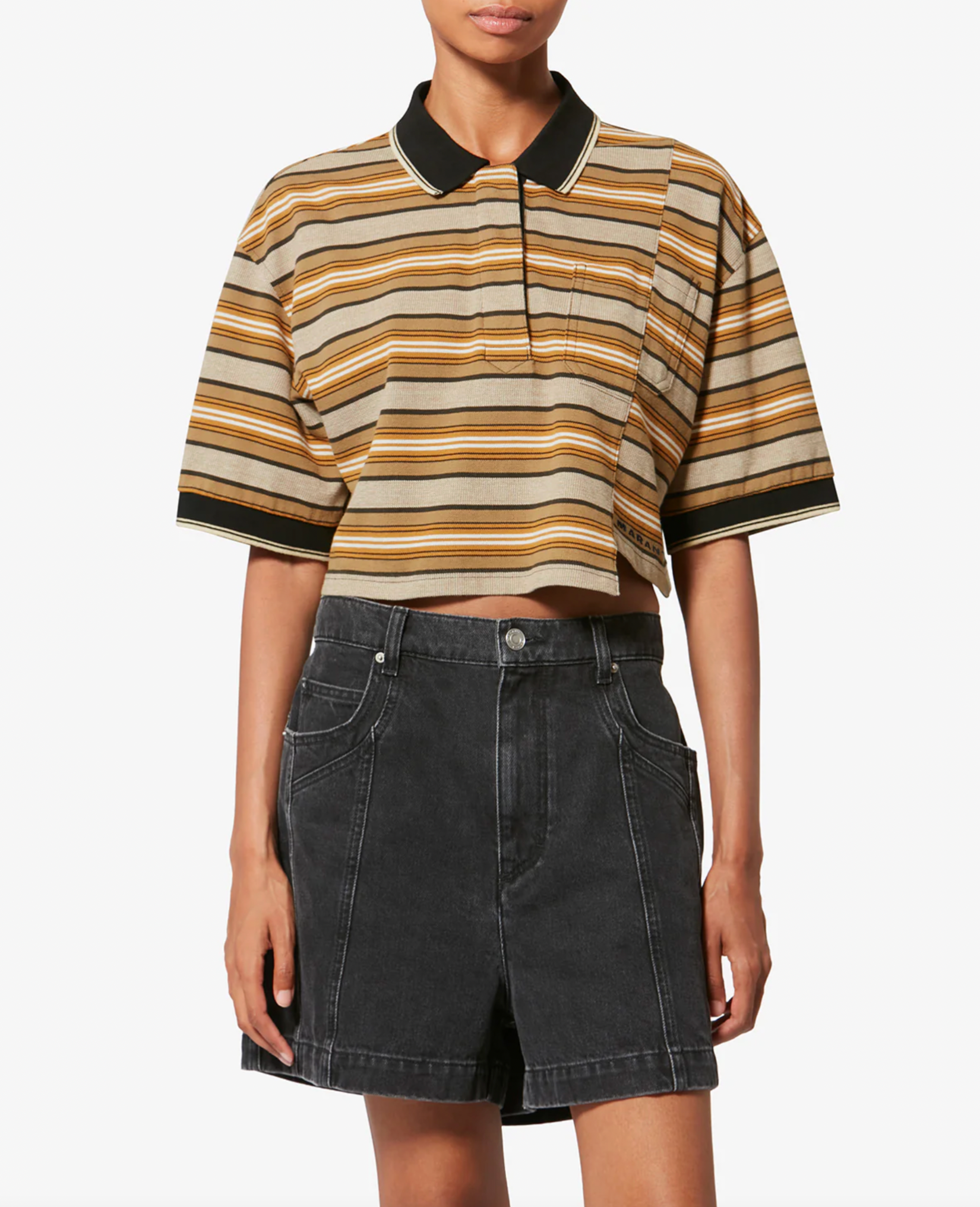 Contrasting polo collar extended by a hidden button tab