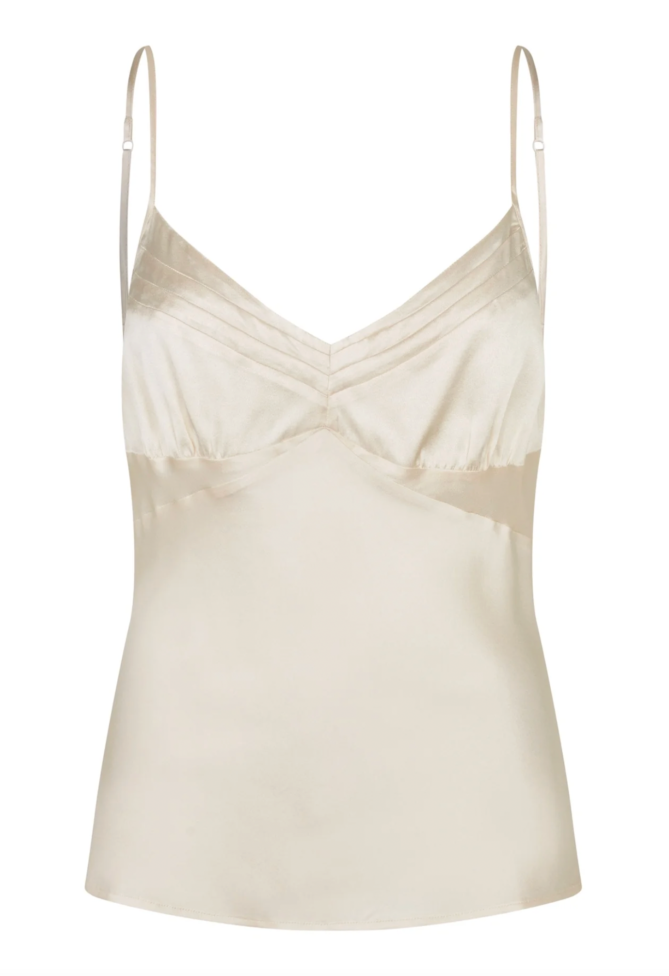 Tiny sewn down pleats run across the bodice of this delicate and feminine camisole top made from oyster silk satin. Seams accentuate the bust line and the top is suspended from adjustable spaghetti straps. Wear under a blazer or shirt for an added touch of sensual sophistication.