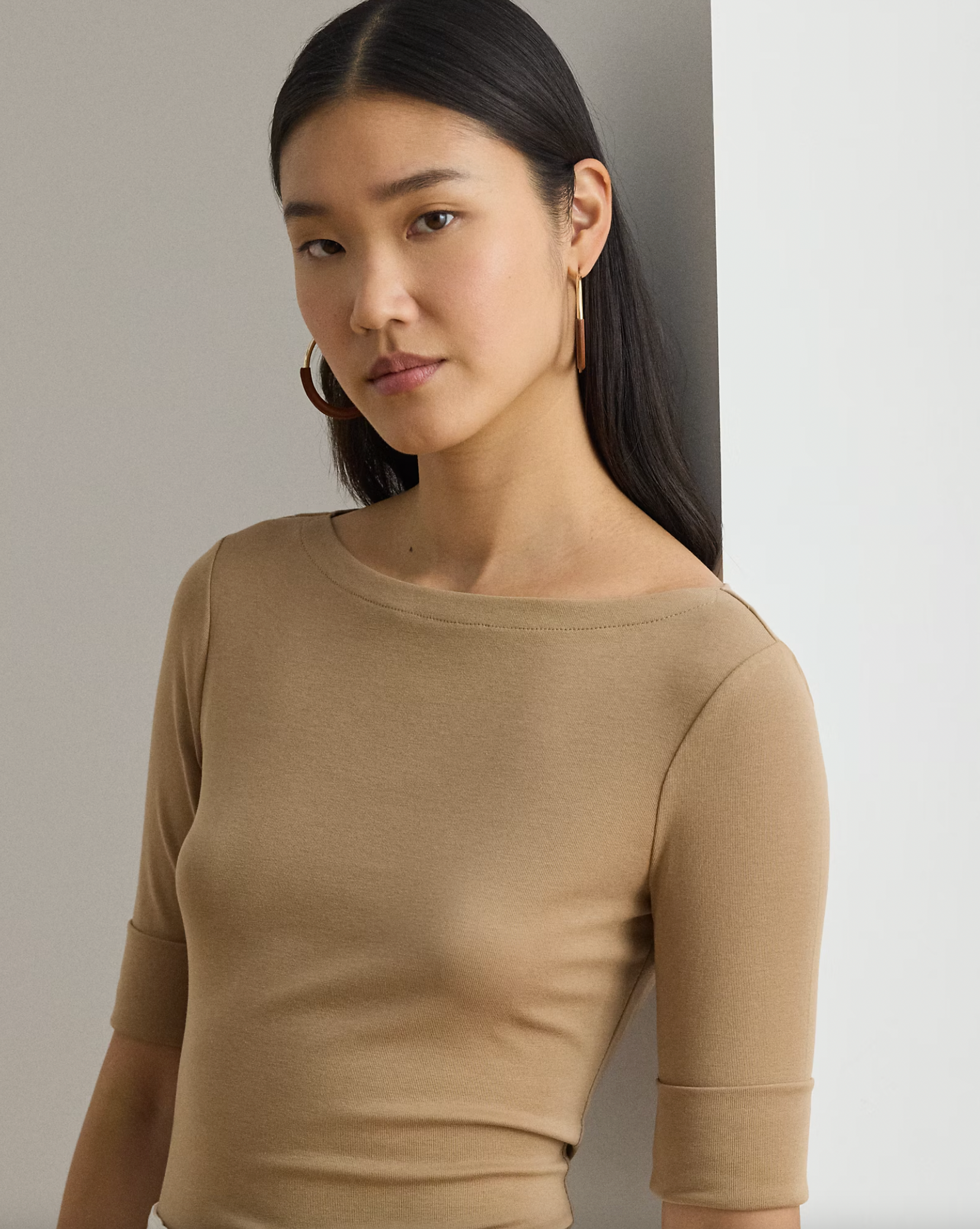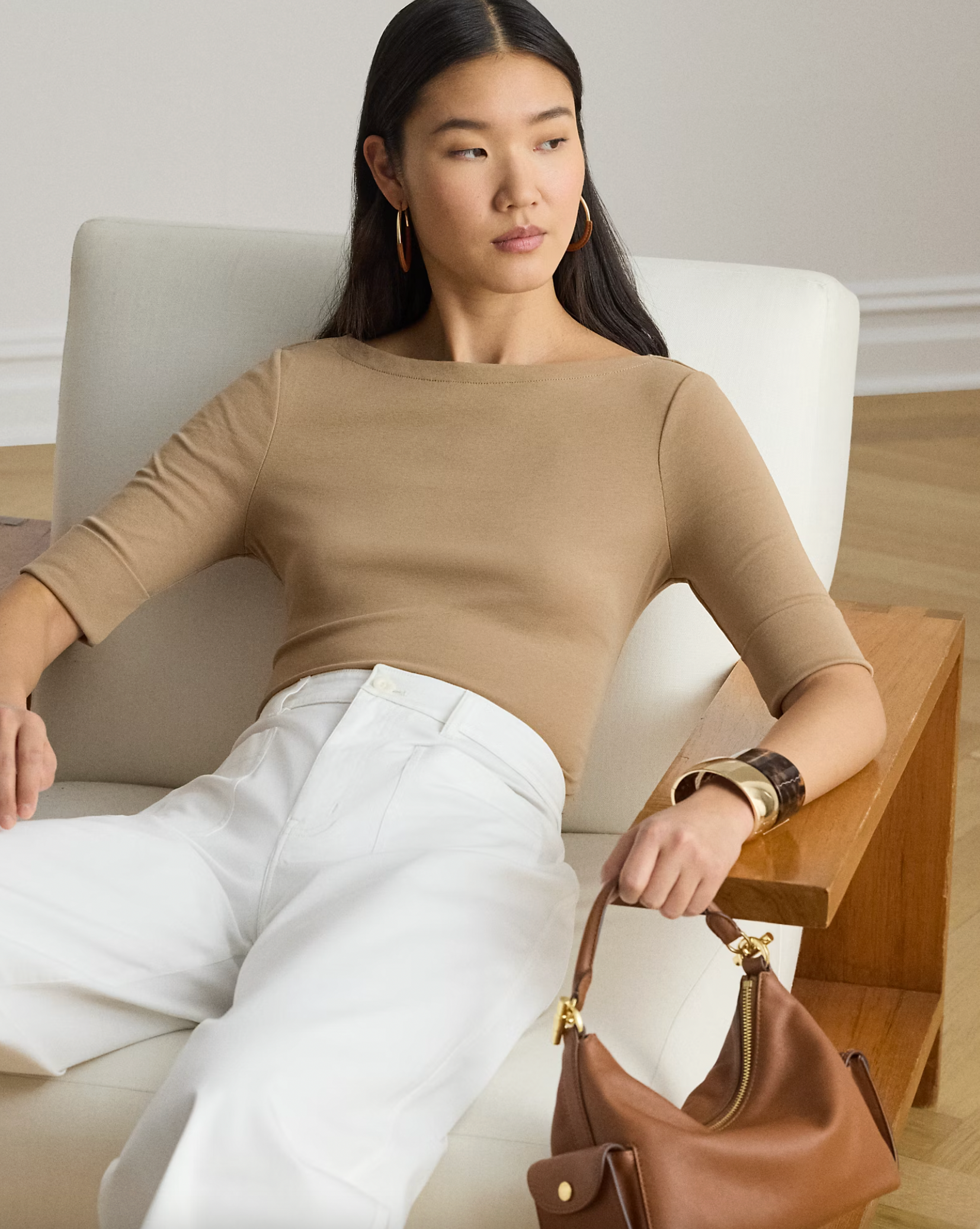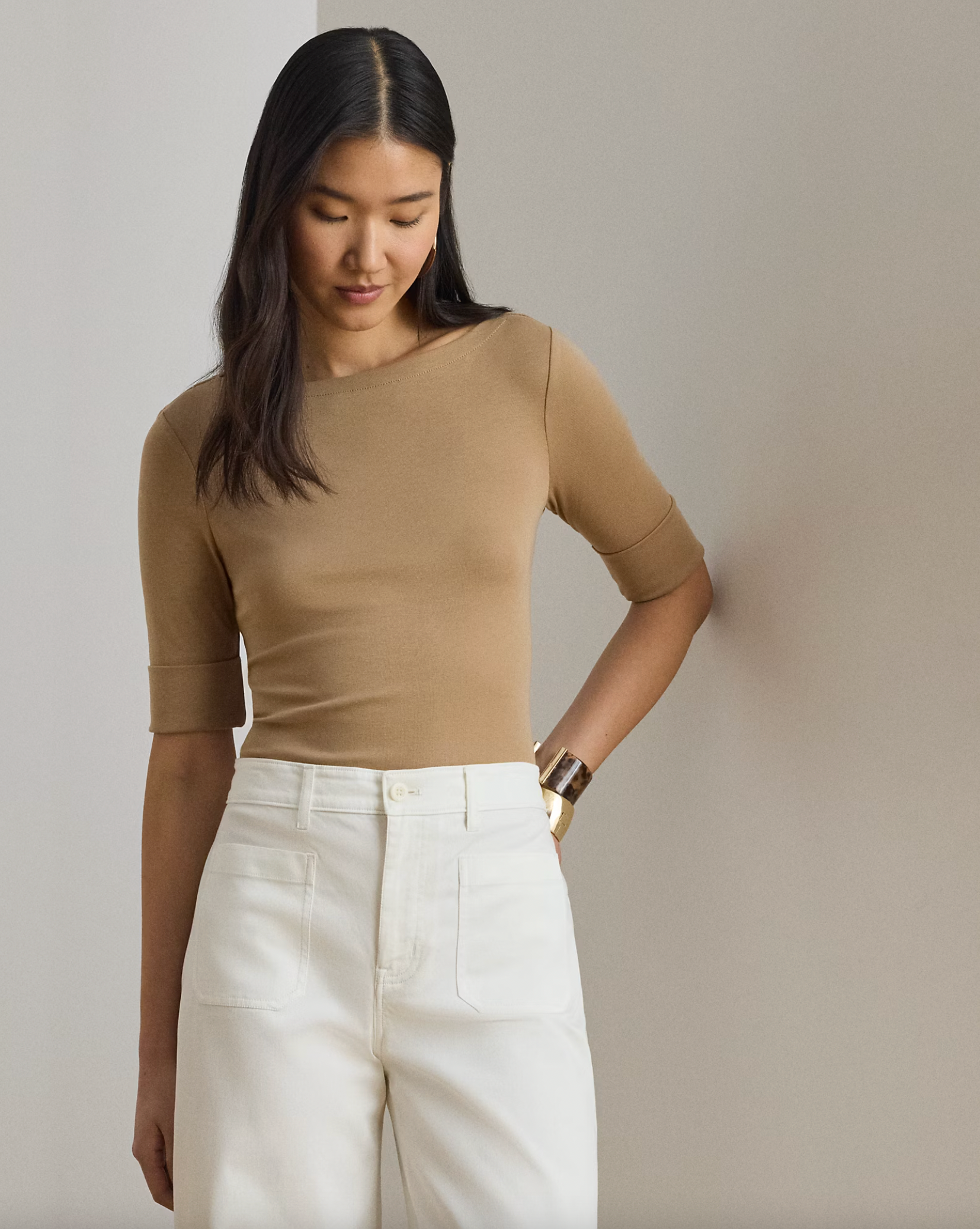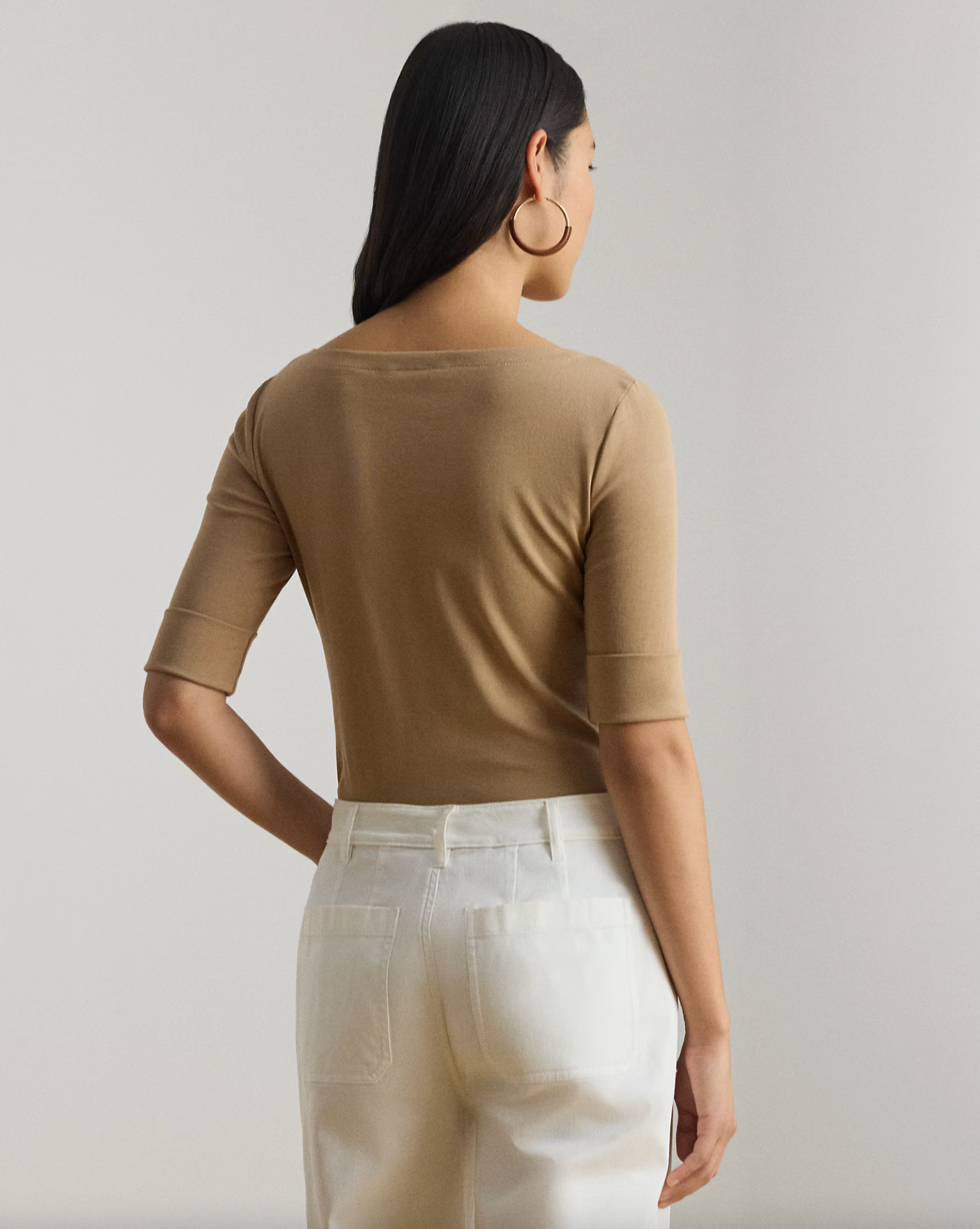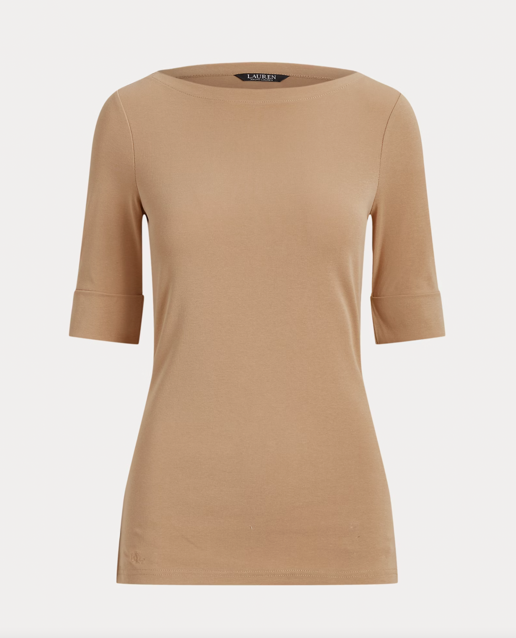 Elbow-length sleeves with folded cuffs. Embroidered “LRL” monogram at the right hem. Side-split hem.