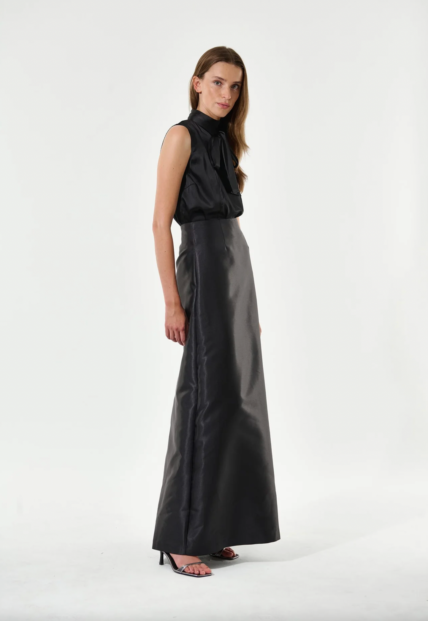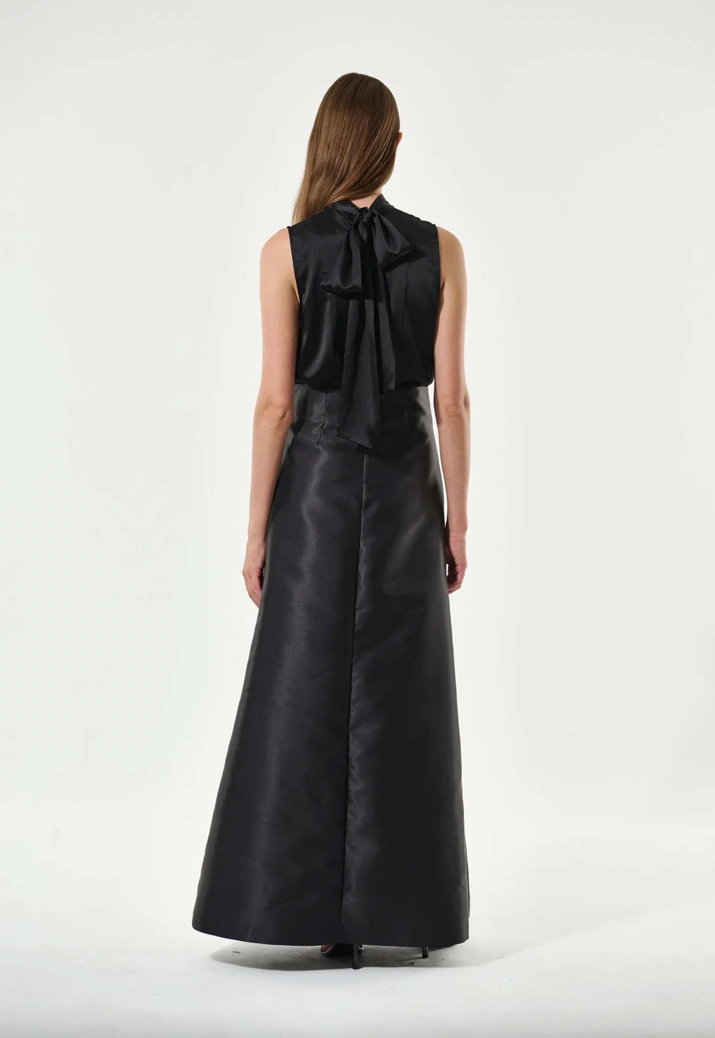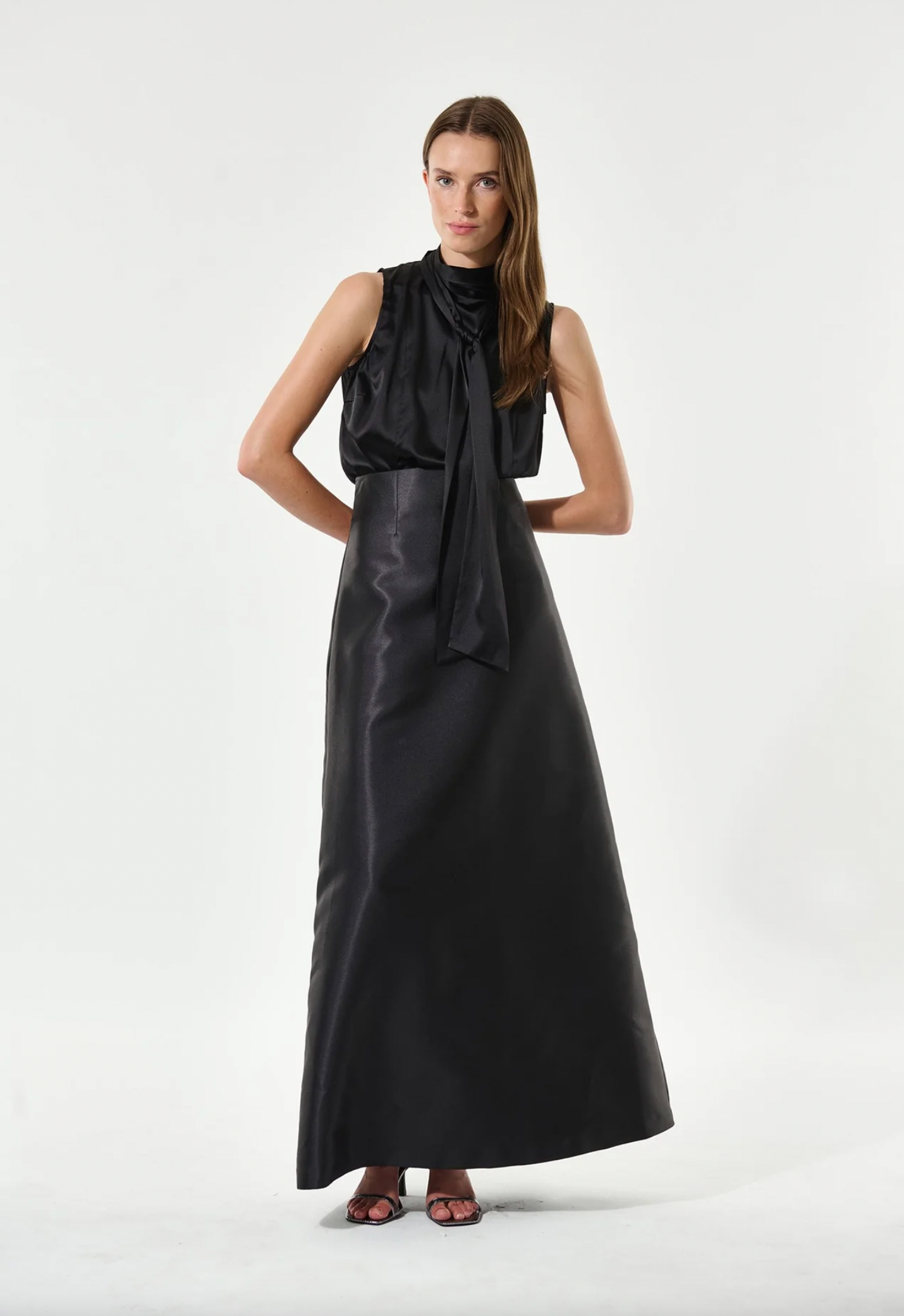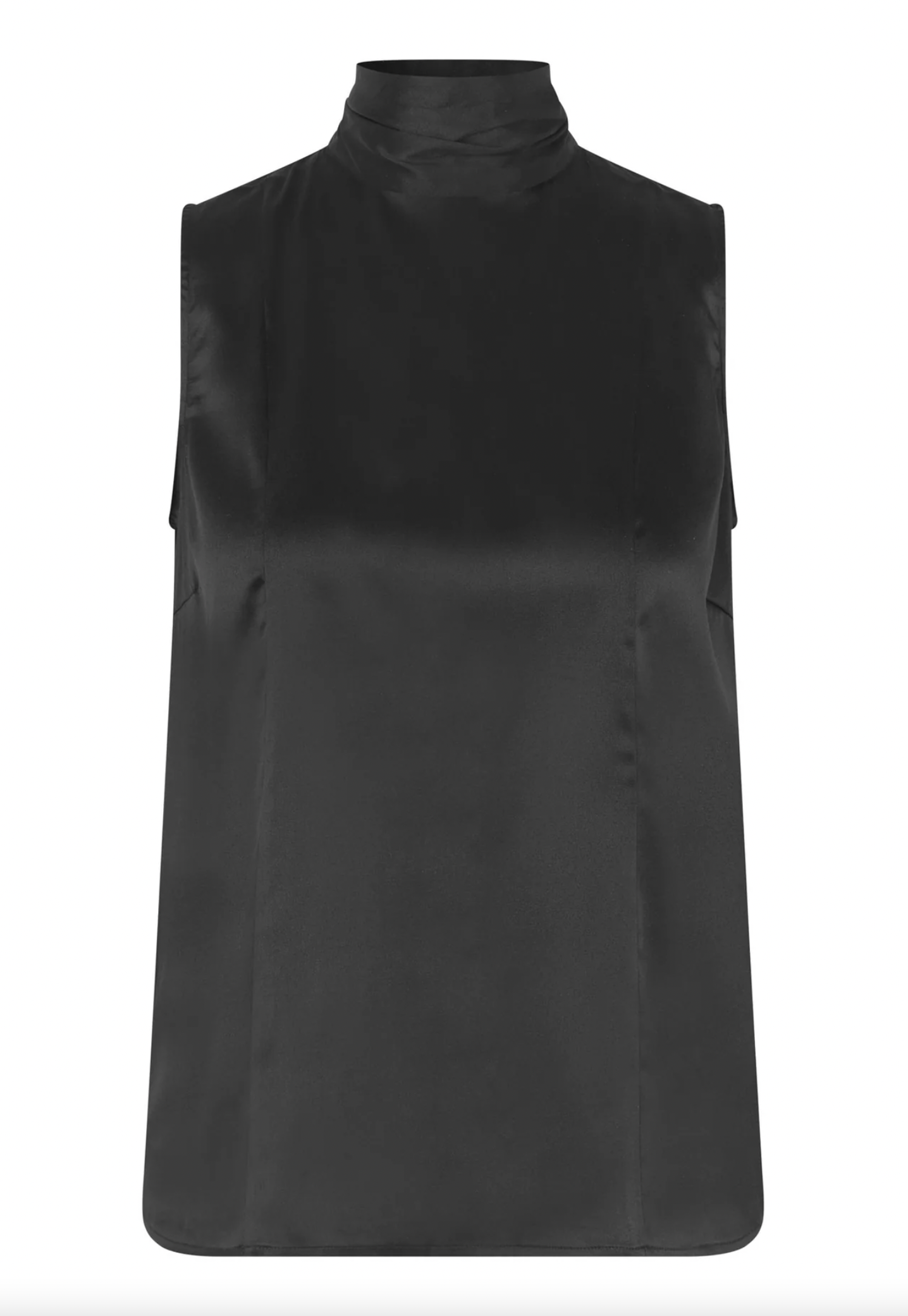 Elegant and refined, this sleeveless top in deep burgundy silk twill has a high scarf neck which can be fastened as a loose bow at the back or wound around to the front for multiple styling options. The top has a body-skimming fit.