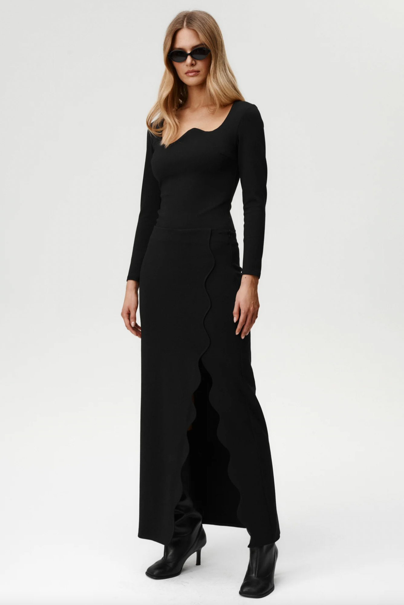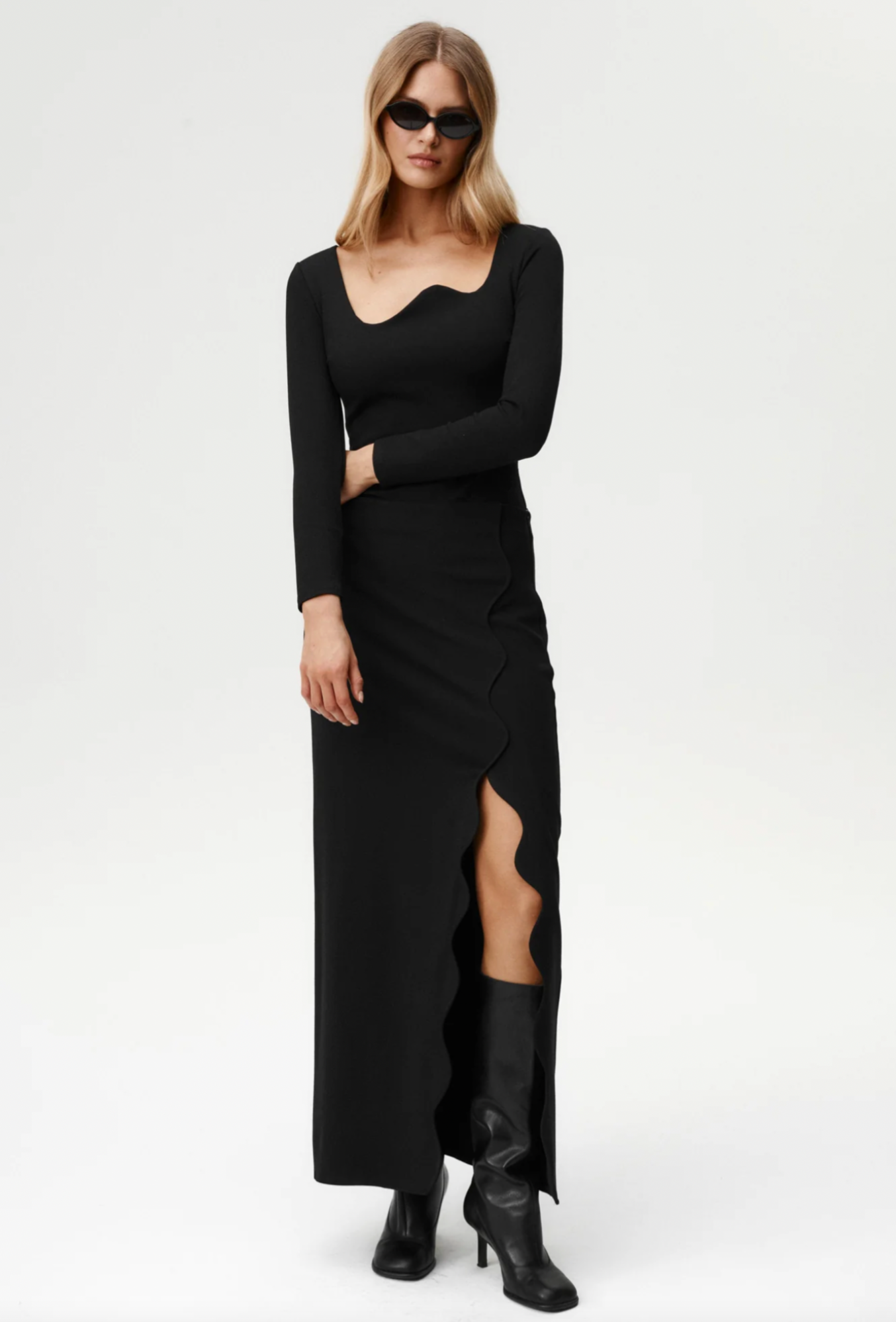 It is all about sculpted elegance with a twist. Its asymmetric neckline is shaped into a wave, creating a focal point that feels both modern and refined. Cut from a dense, body-contouring fabric, it sculpts the figure for that perfectly snatched effect while remaining comfortable to wear. The back is kept clean and minimal, letting the bold front detail take center stage. Pair it with the Ariel Skirt for a complete set that balances timeless sophistication with unmistakable UC edge.