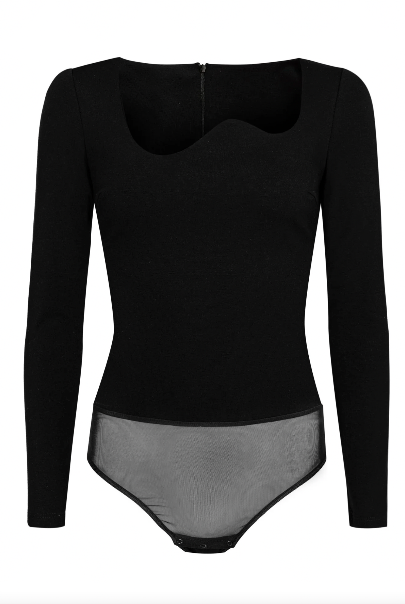 Bodysuit with asymmetric wave-shaped neckline.
