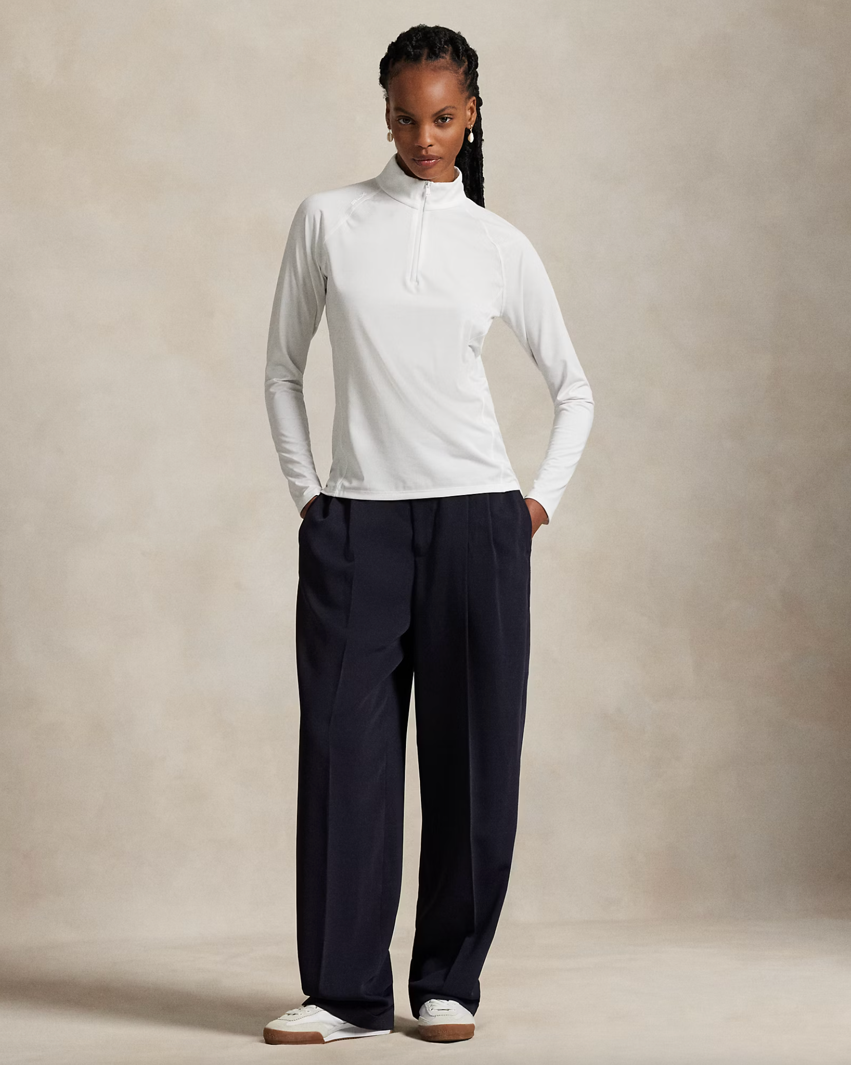 Mockneck. Quarter-zip placket. Zip pull custom-developed with an “RLX” logo.