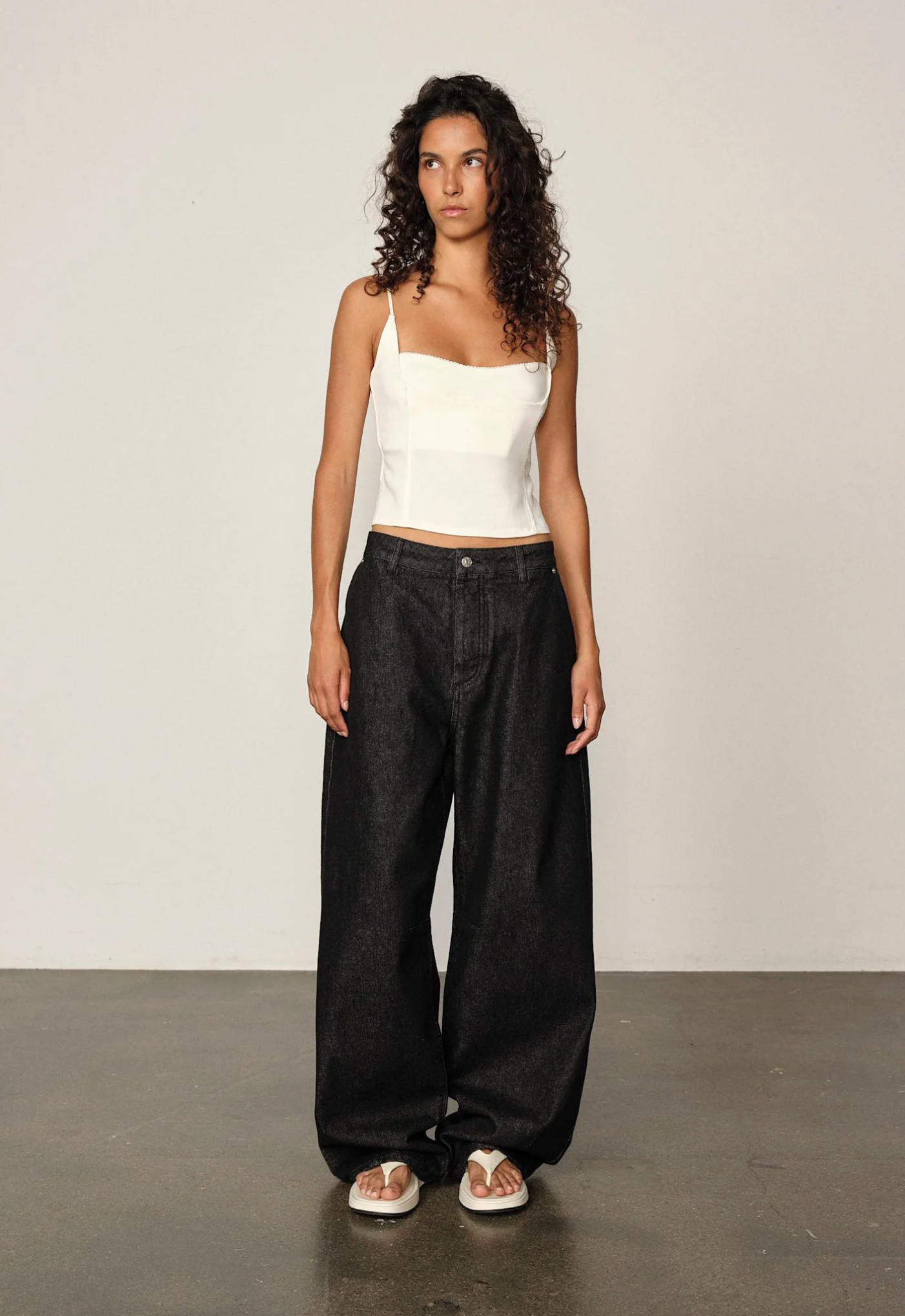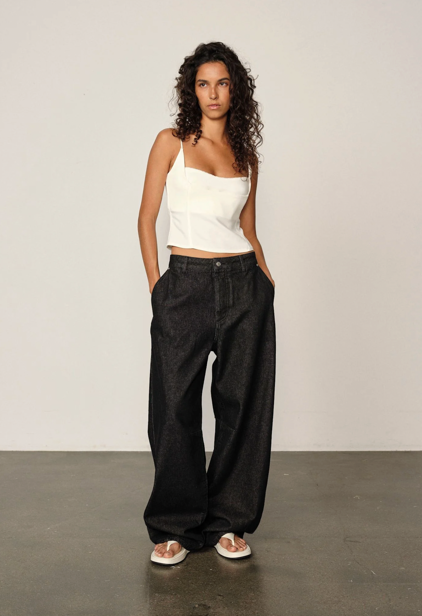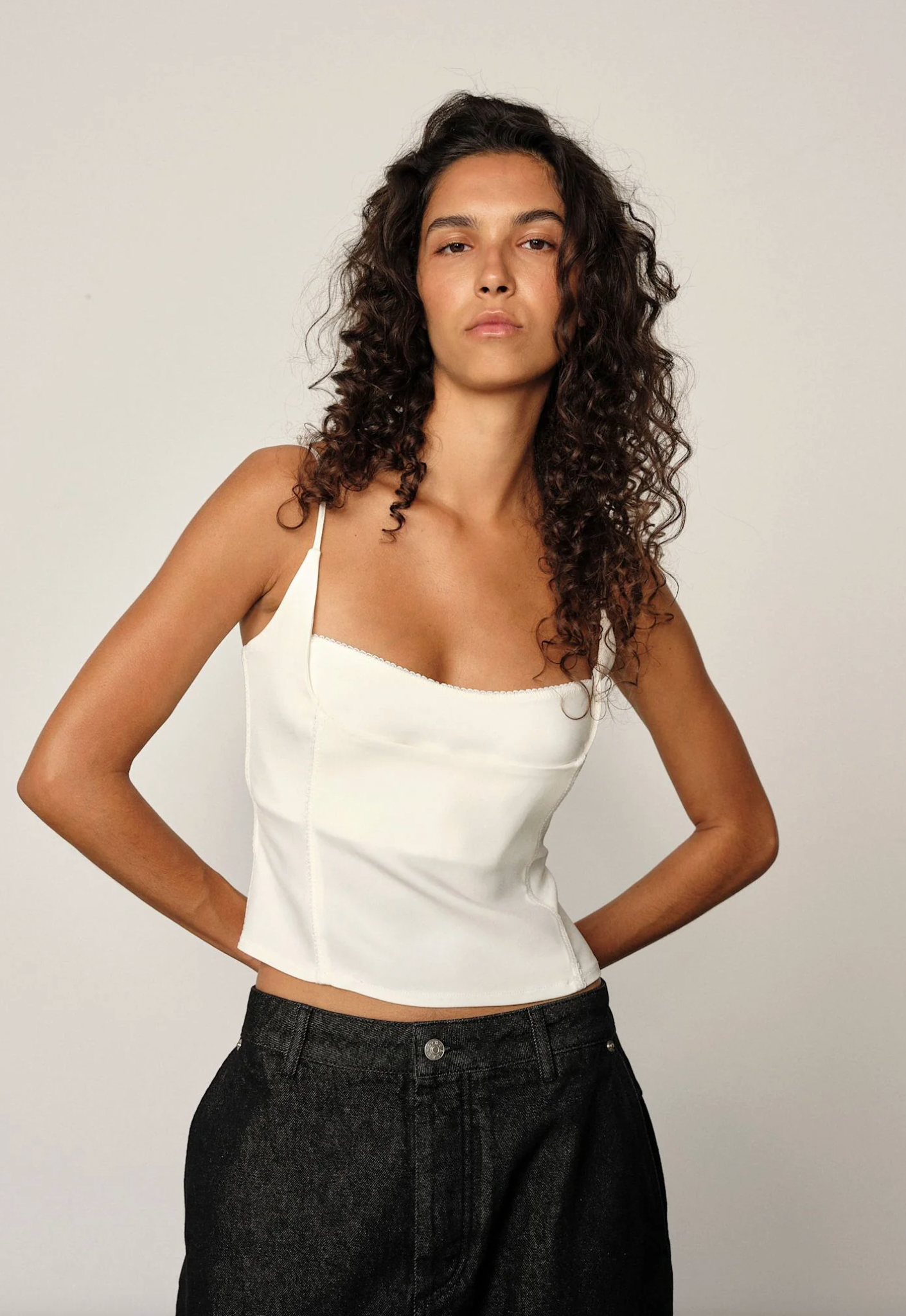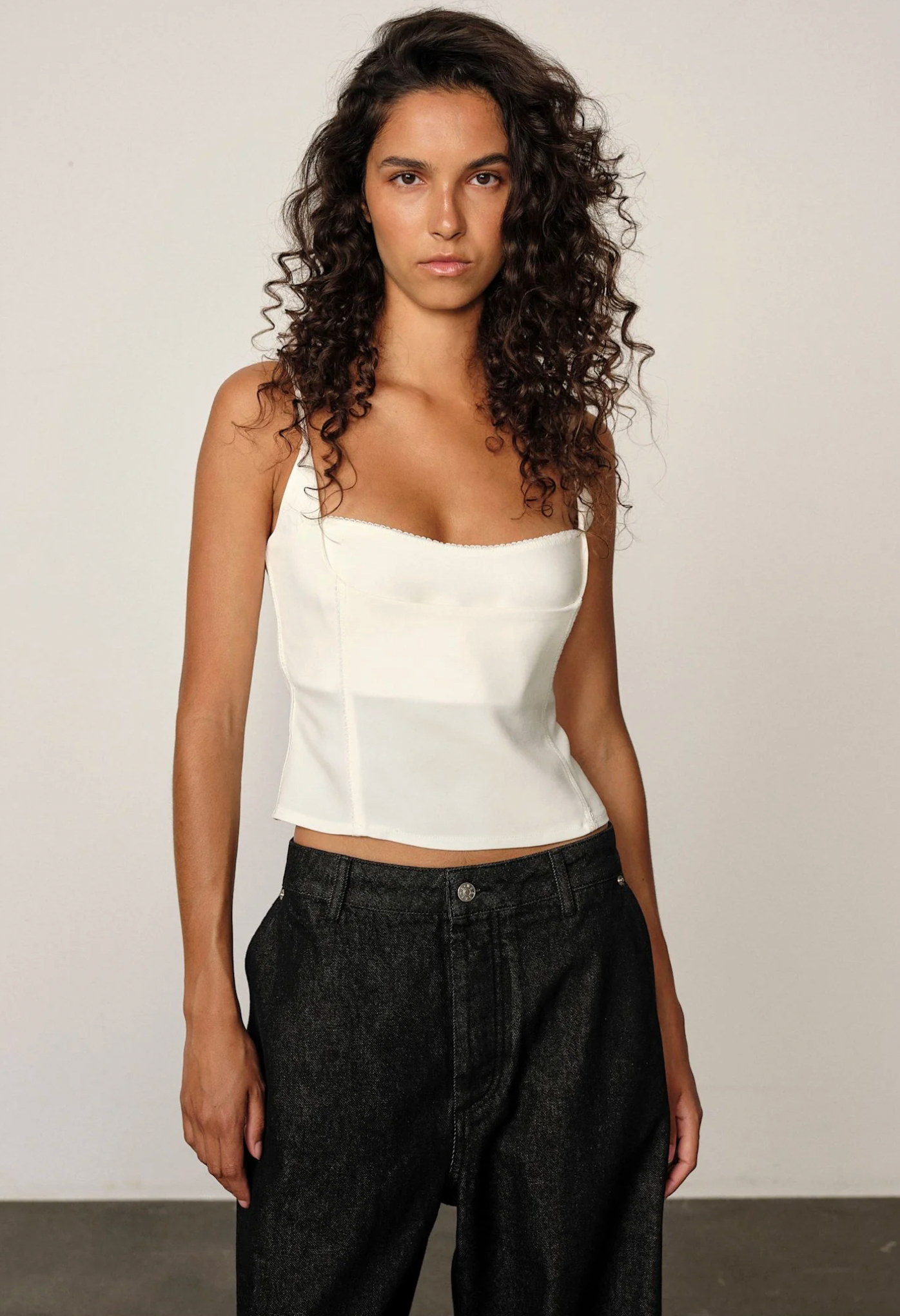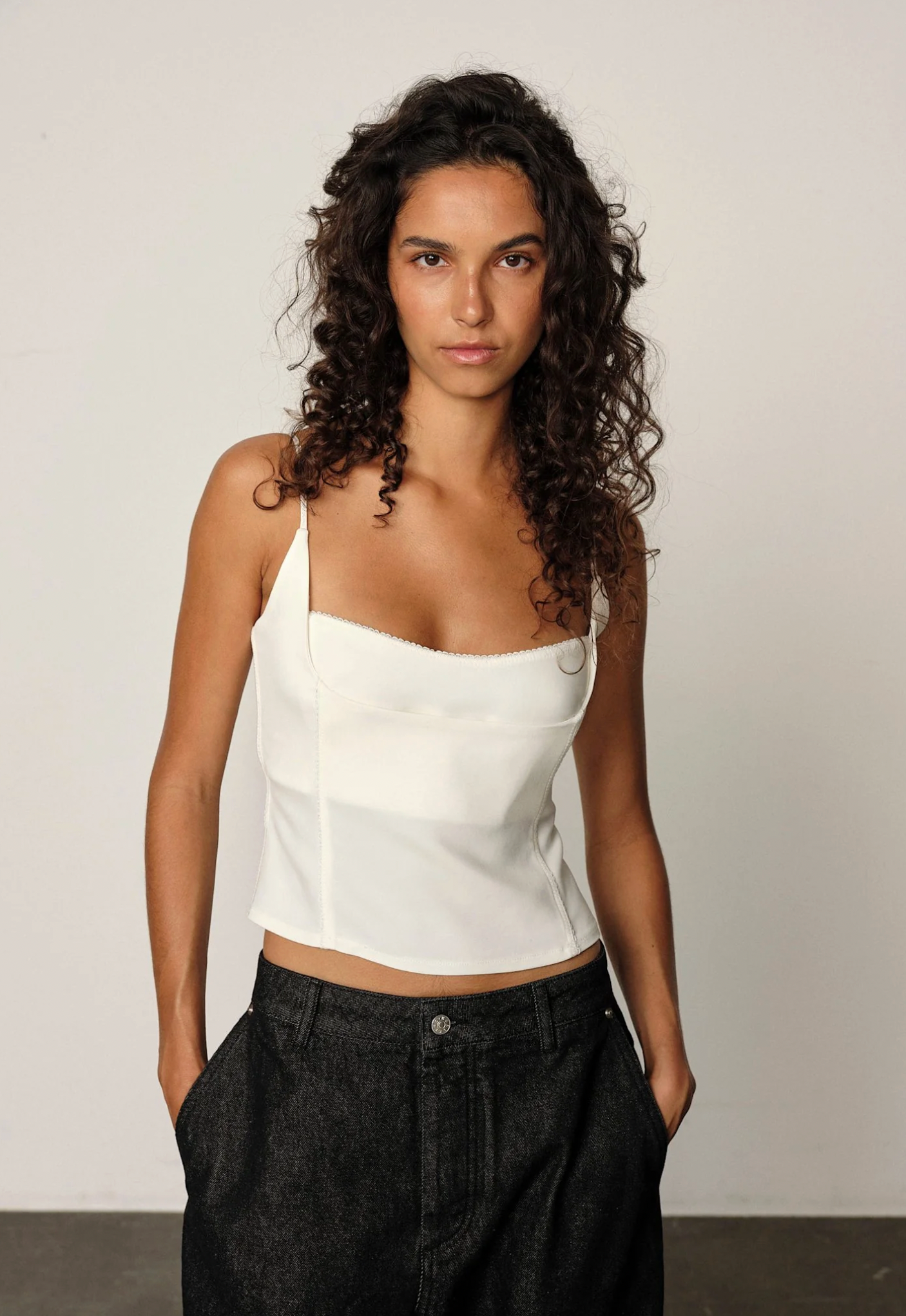 This refined top blends sensuality and structure in a minimalist silhouette. Cut from a smooth viscose blend with a touch of stretch, it features a softly curved neckline with delicate stitching and slim straps. The panelled construction shapes the body elegantly, offering a feminine yet contemporary expression that transitions seamlessly from day to evening.