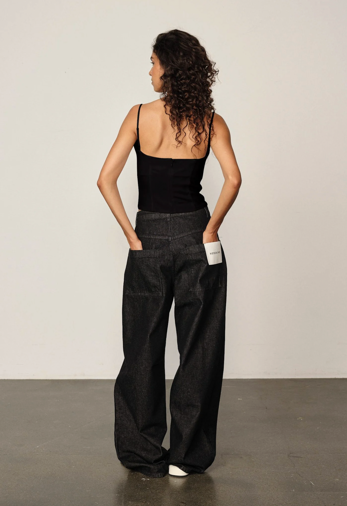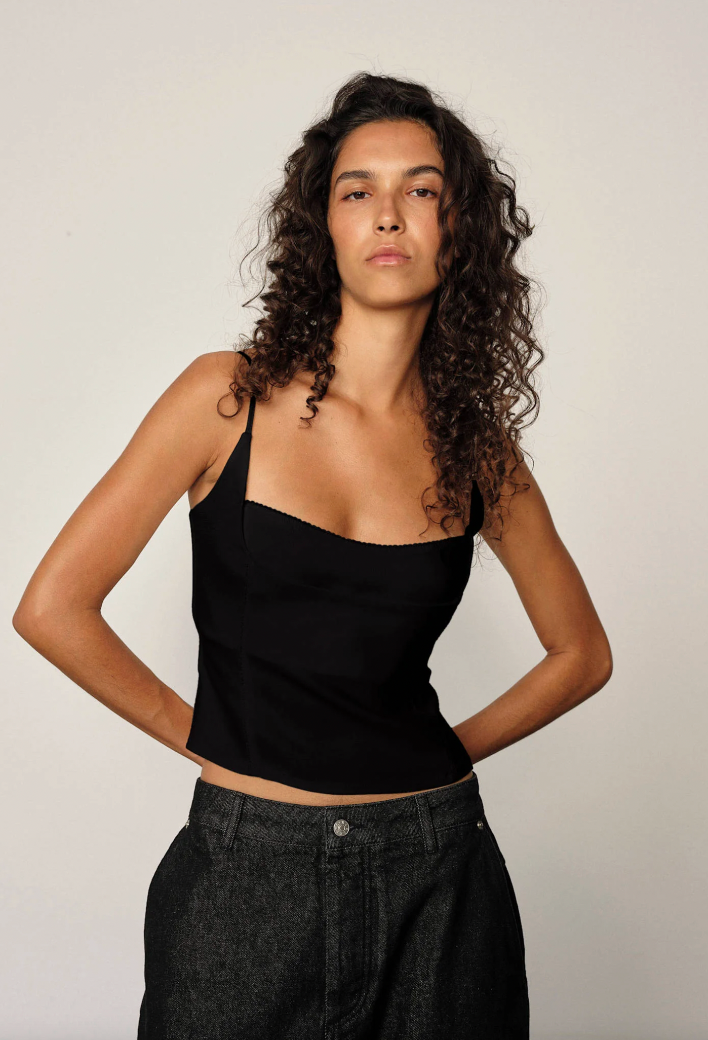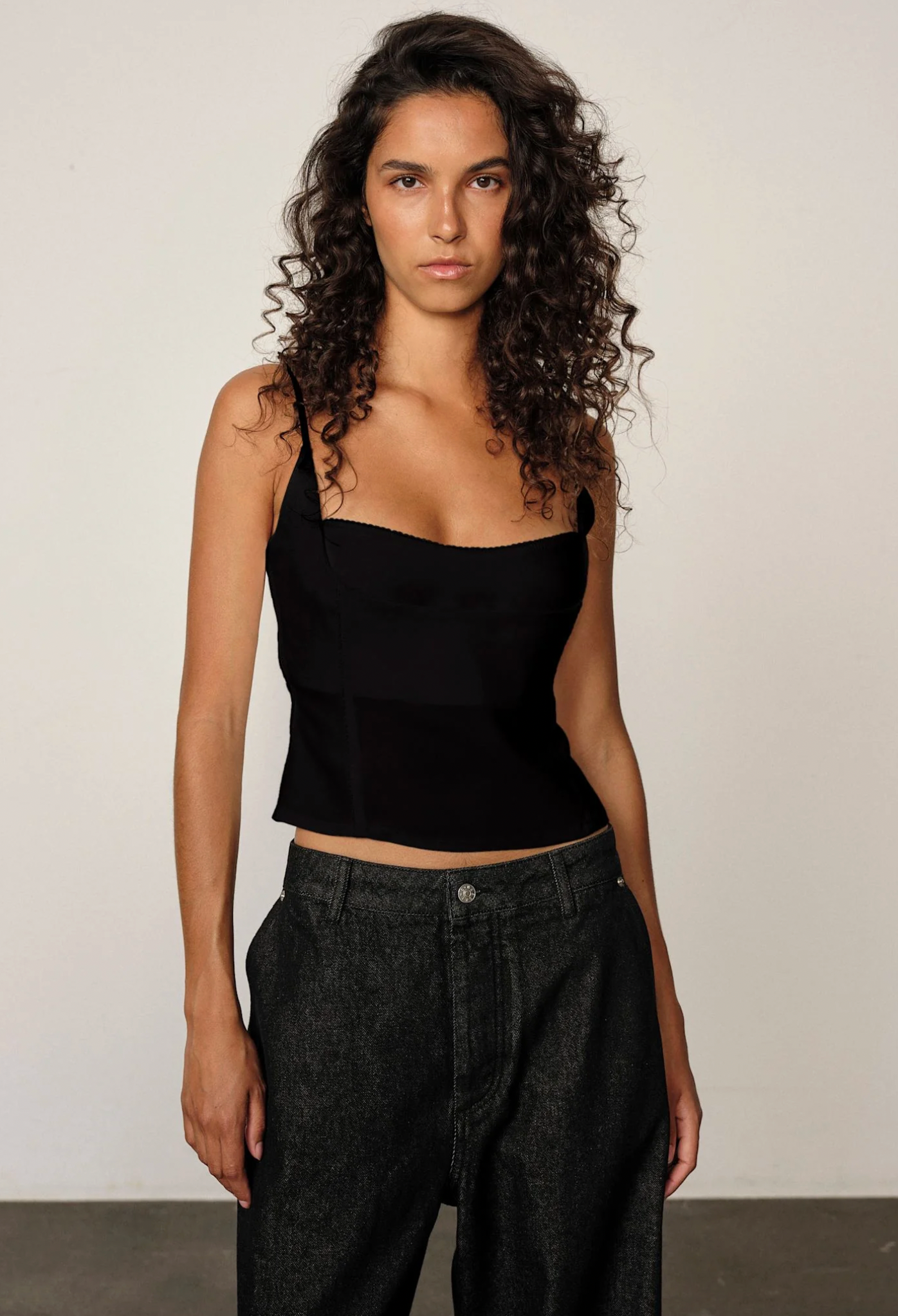 This refined top blends sensuality and structure in a minimalist silhouette. Cut from a smooth viscose blend with a touch of stretch, it features a softly curved neckline with delicate stitching and slim straps. The panelled construction shapes the body elegantly, offering a feminine yet contemporary expression that transitions seamlessly from day to evening.