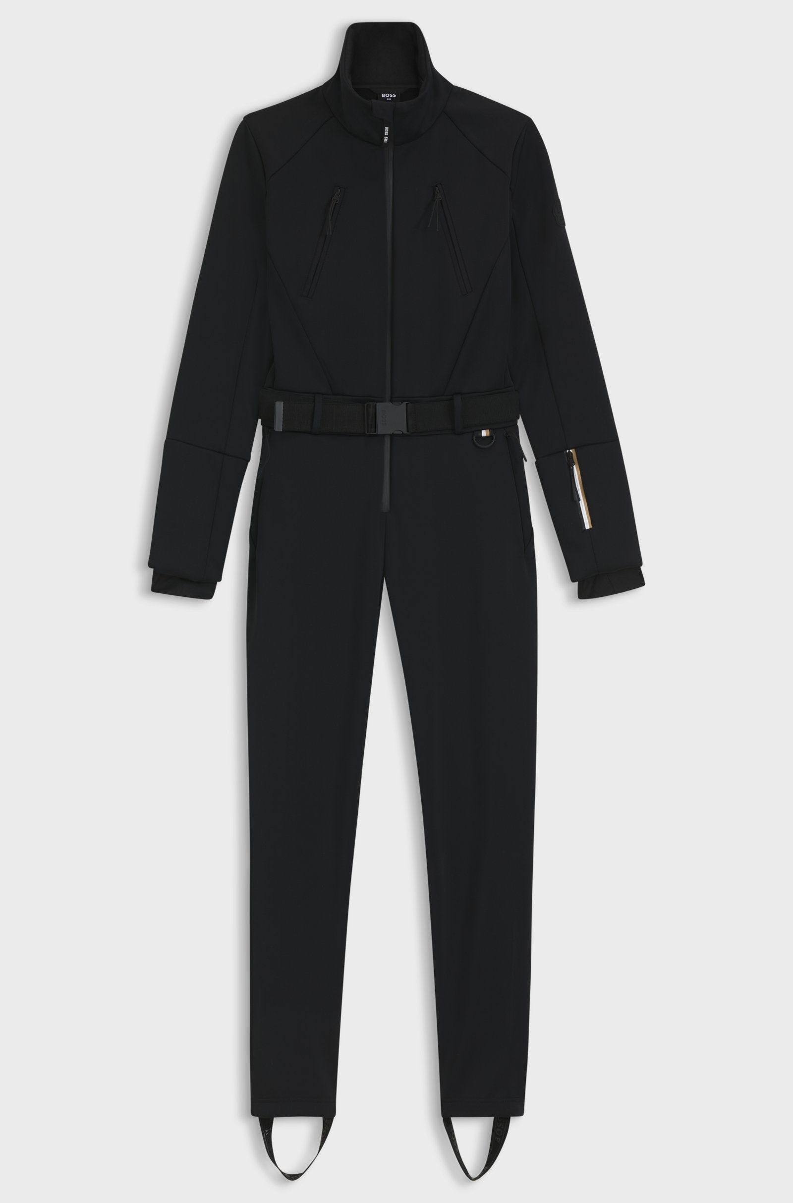Water-repellent and cosy, this women's BOSS Ski suit is the all-in-one you're looking for. Stirrups for comfy hold. Buckled adjustable belt. Take to the mountains in style with BOSS Ski: a collection of high-performance pieces and bold après-ski designs.