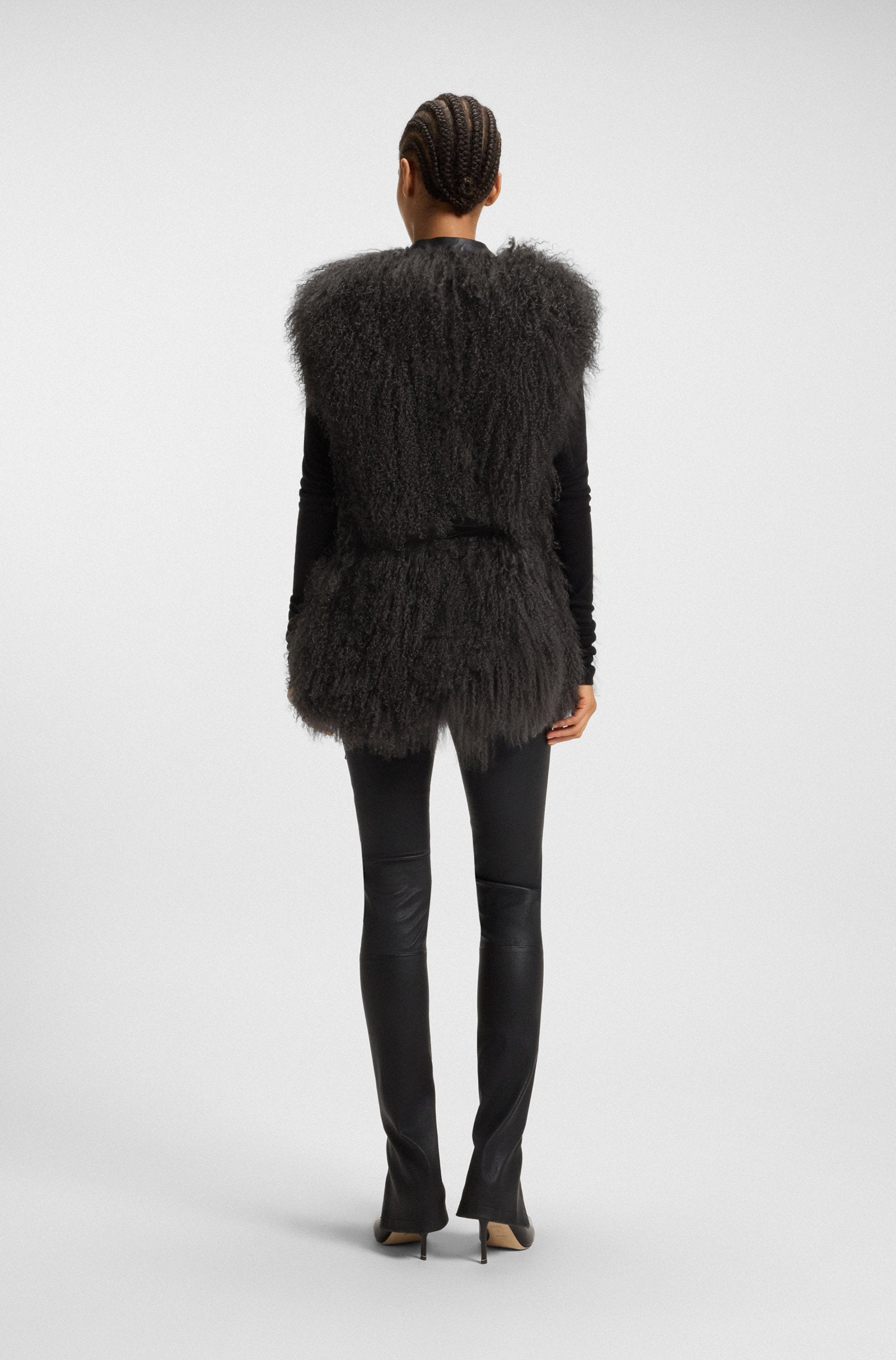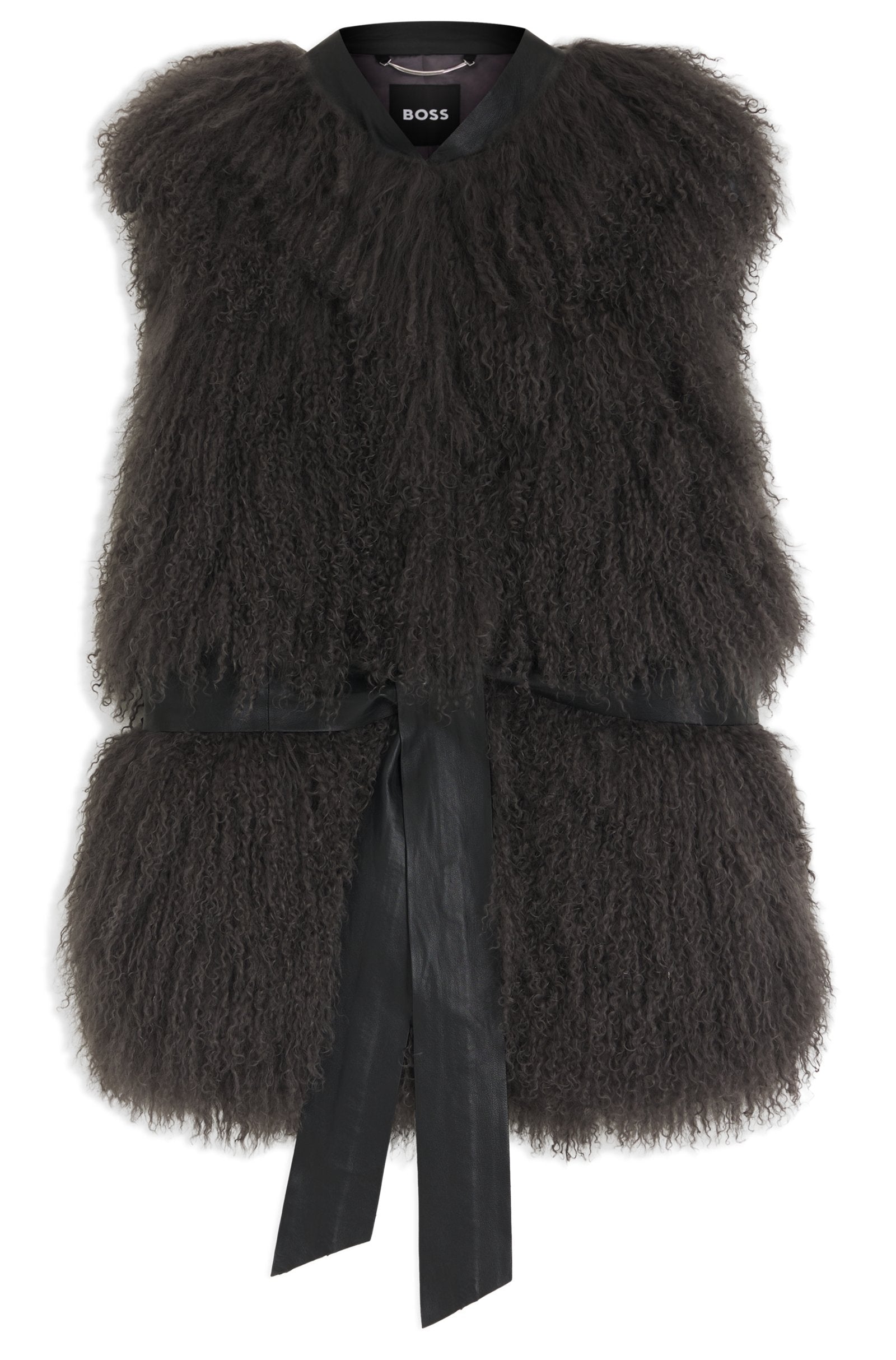 Treat your winter wardrobe to the crimped Mongolian shearling of this BOSS Womenswear gilet. Detachable D-ring belt in rich nappa leather. Smooth lining.