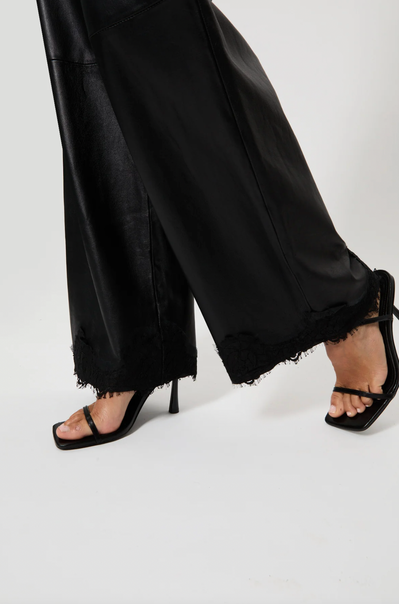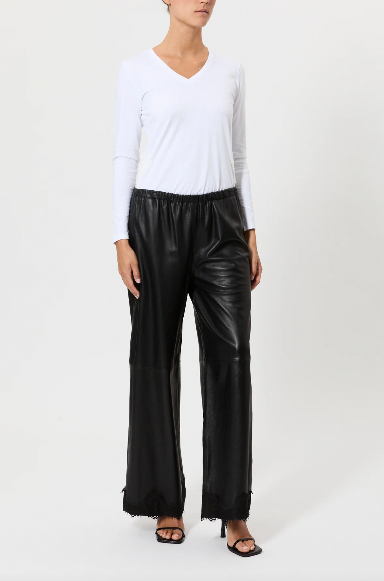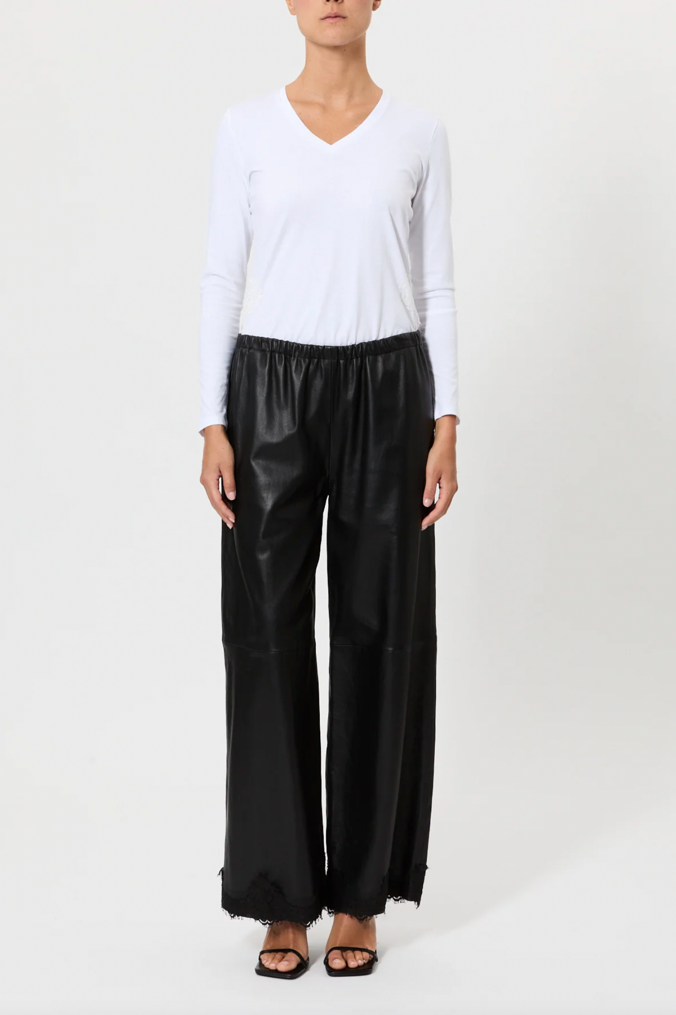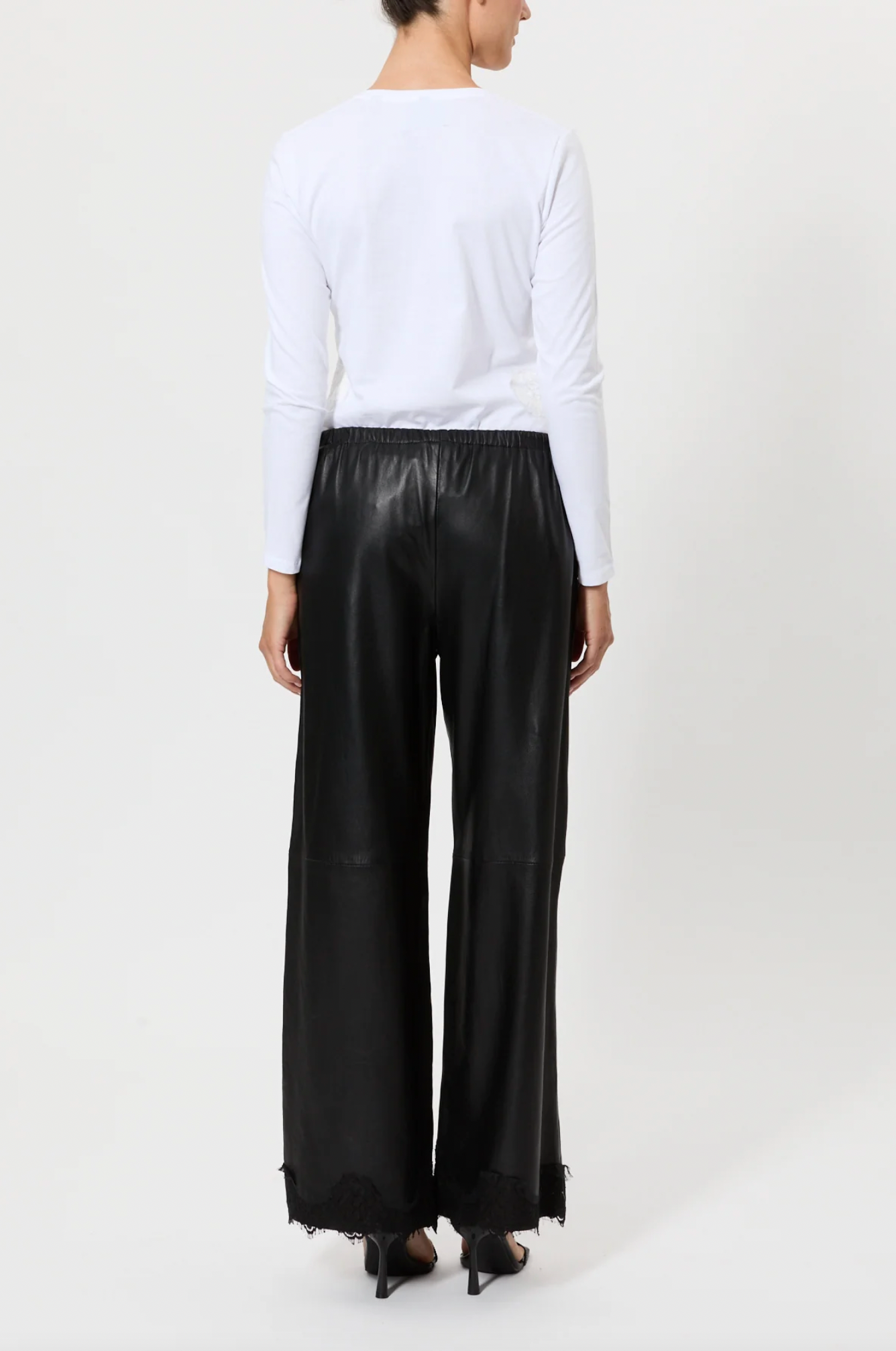 Leather trousers with lace details, elastic waistband, and a relaxed, low-rise silhouette. 100% Made in Italy, crafted in Florence by skilled artisans.