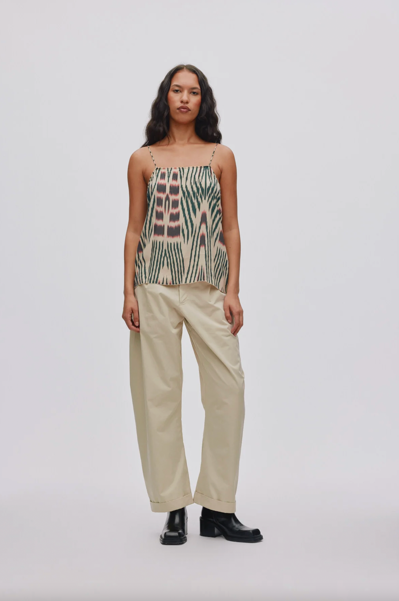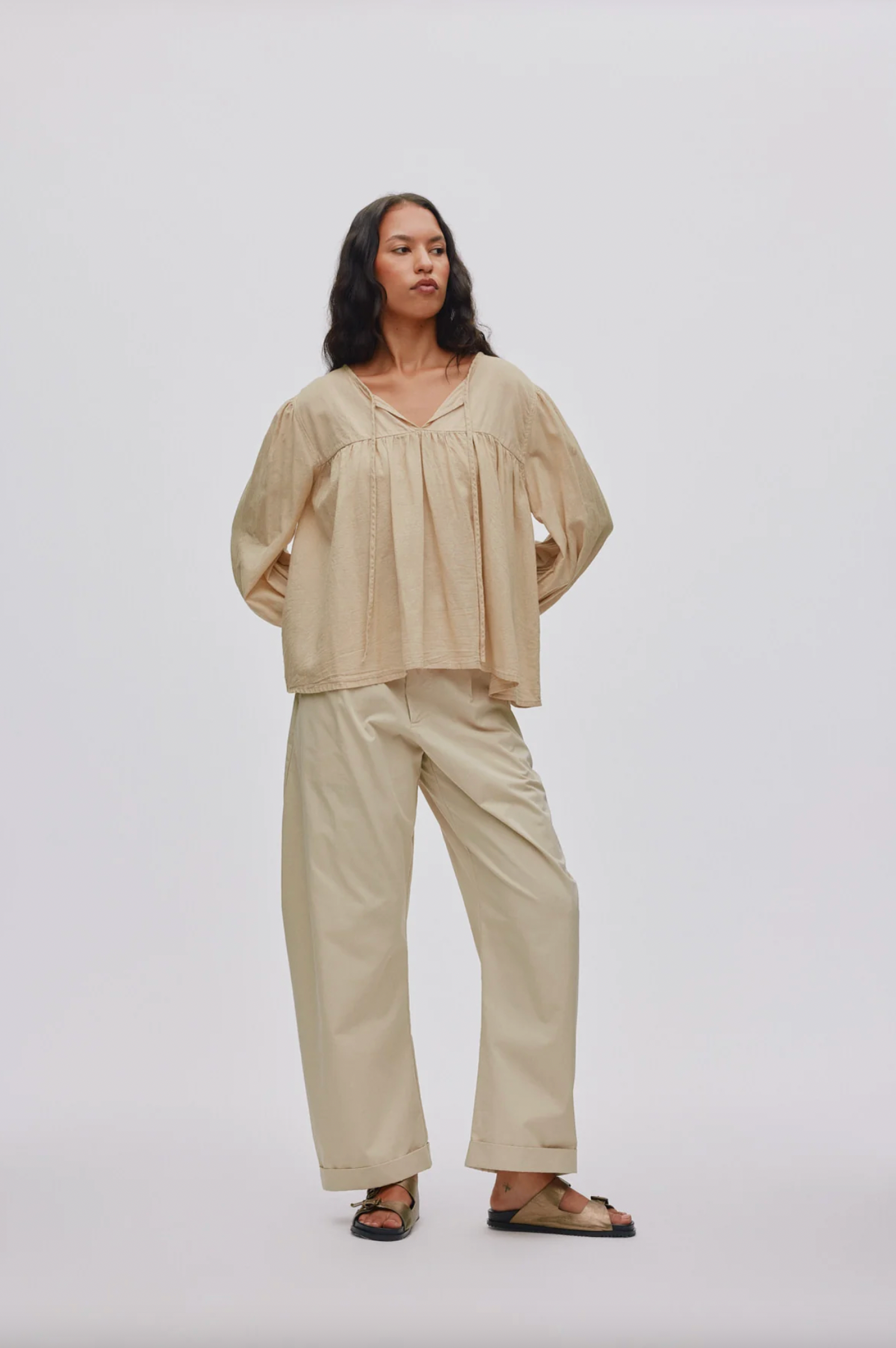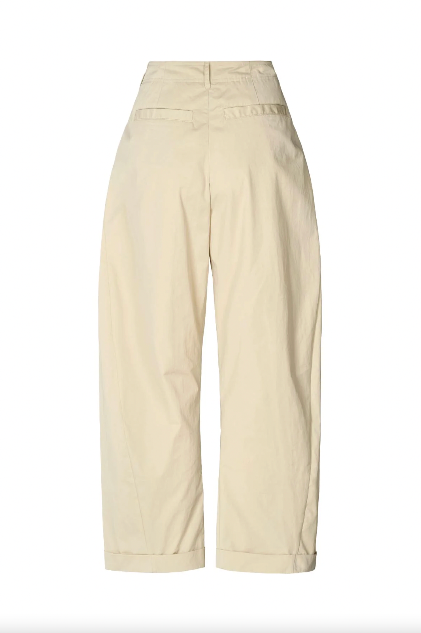 The trousers are made from a comfortable, lightweight material that drapes beautifully on the body. The design is relaxed, featuring a regular waist and loose, straight legs with a cuffed hem. They are detailed with a zip and button closure, side and back pockets, and belt loops.