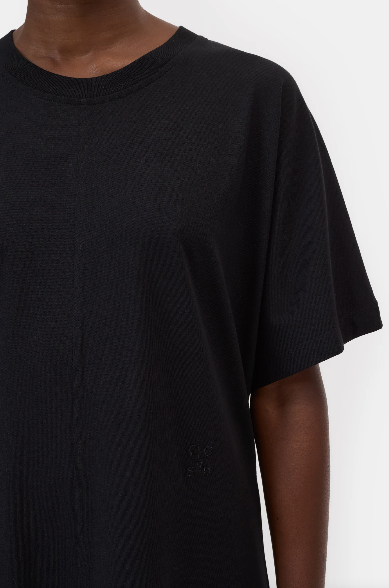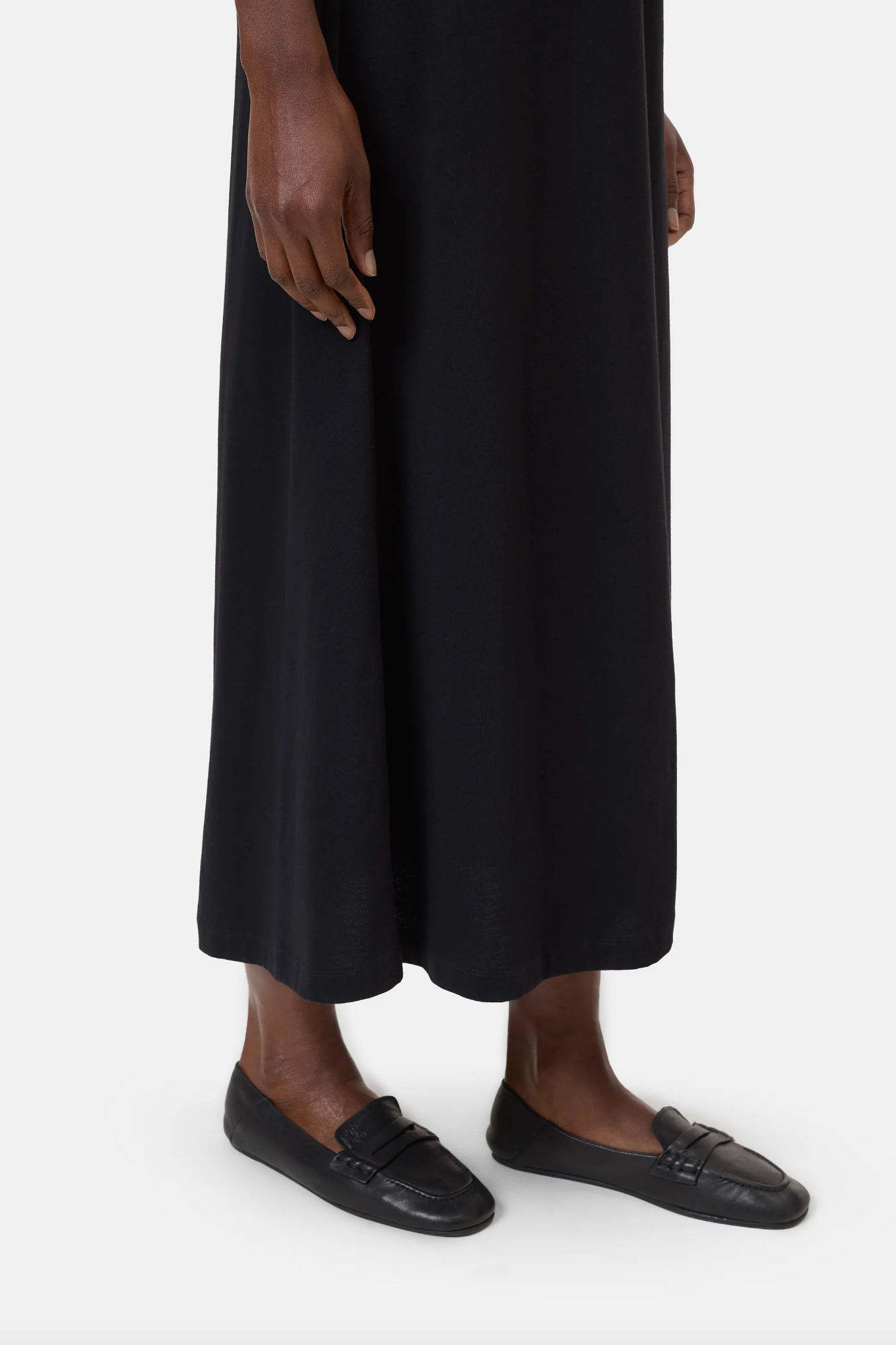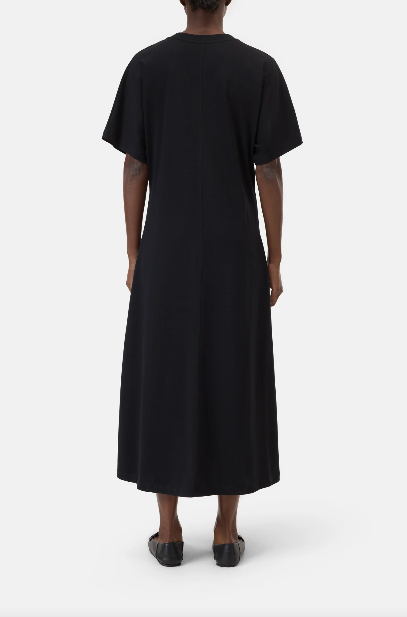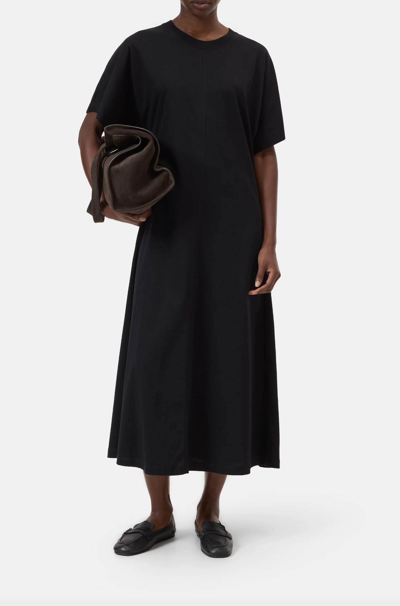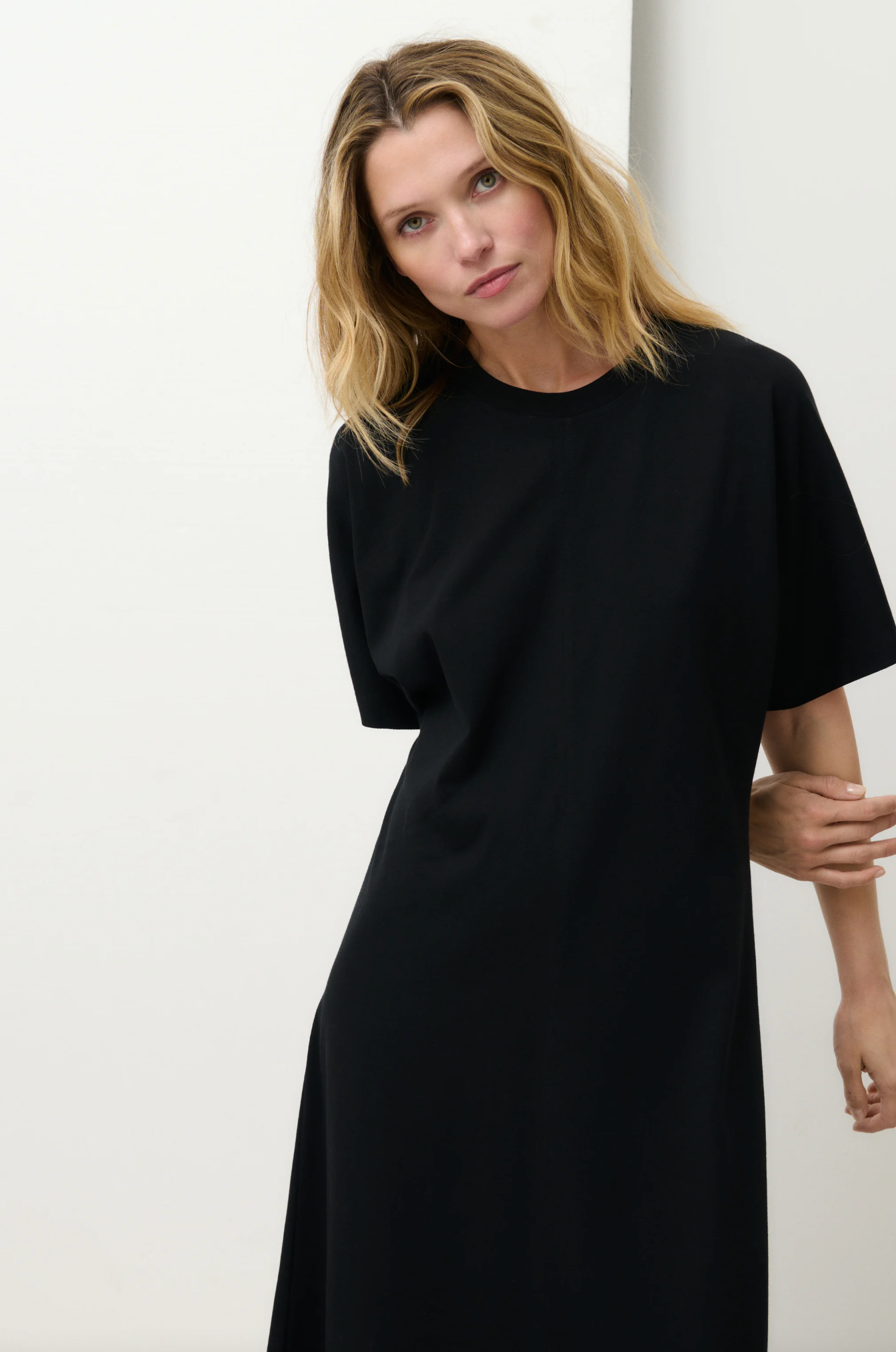 Made from pure organic cotton, this dress stands out thanks to its relaxed cut. The flared, slightly draped skirt creates a feminine silhouette. It is made from compact single jersey, which is given its special character by a special piece and pigment dyeing process. With a monogram embroidery at the waist and a ribbed round neckline.