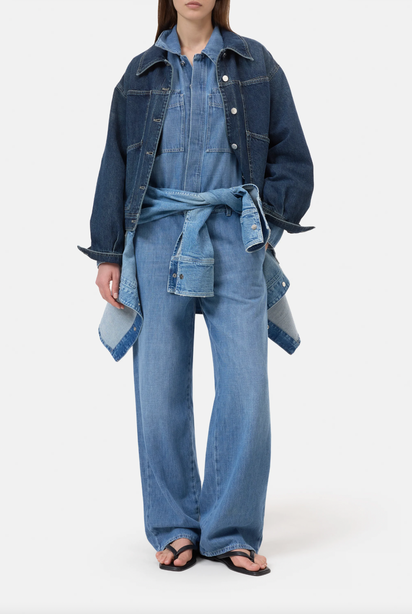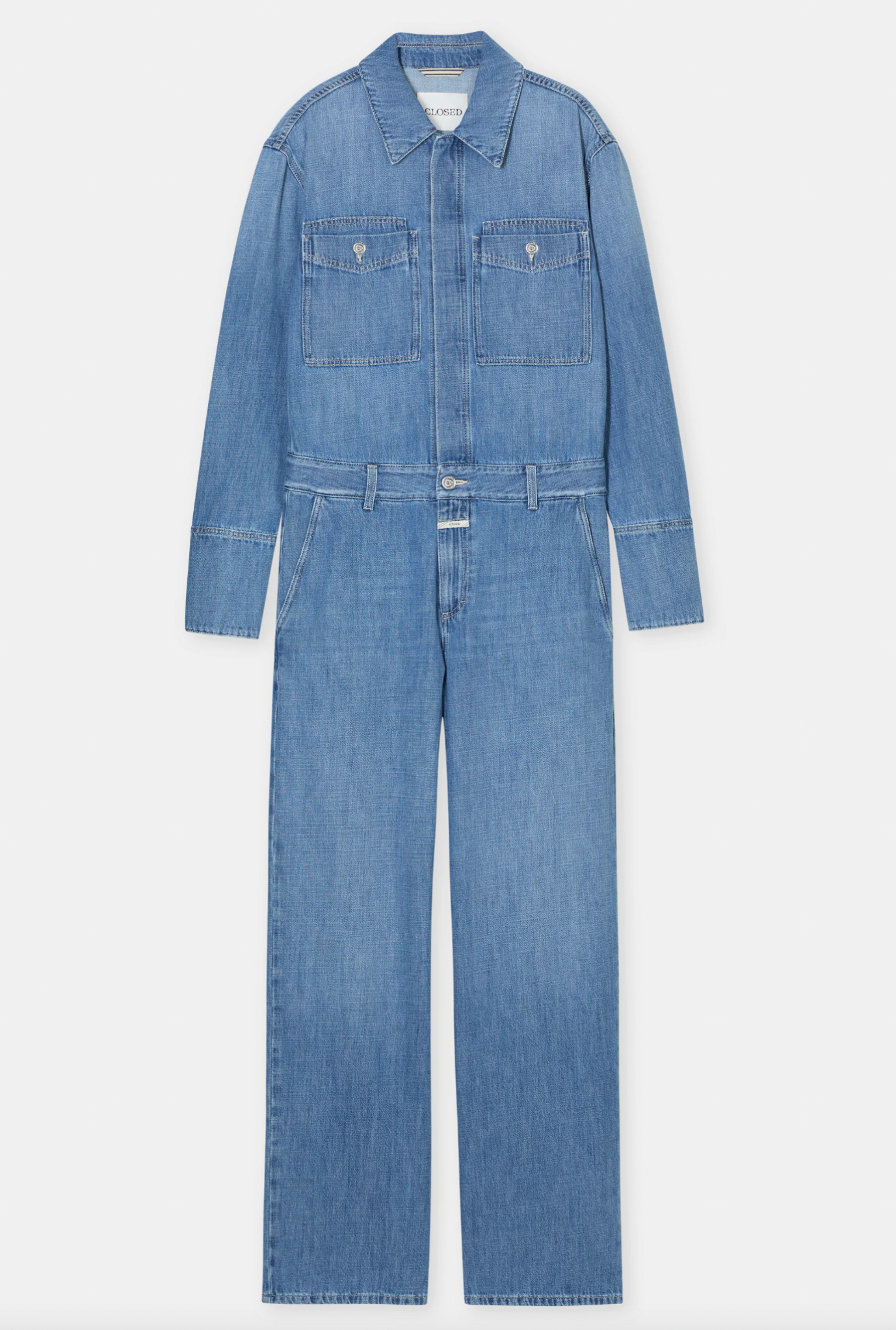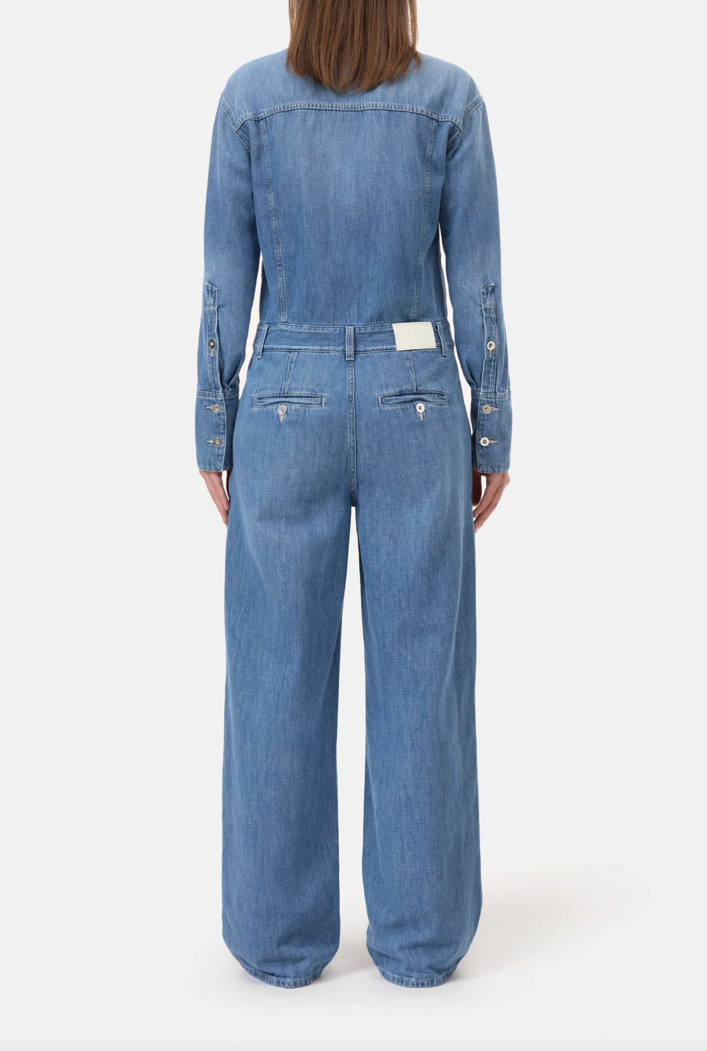 The Wyla jumpsuit is crafted from lightweight 8.5 oz. denim in an authentic twill weave, offering remarkable softness and comfort. The design features a hidden button border and our signature pocket flap stitching. The mid blue denim with gentle fading and a washed-out look has an exceptionally soft handfeel and light drape. Made in Italy using organic and recycled cotton, representing mindful production practices.