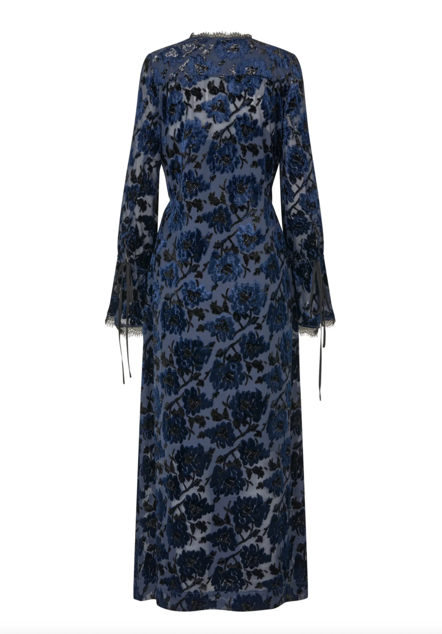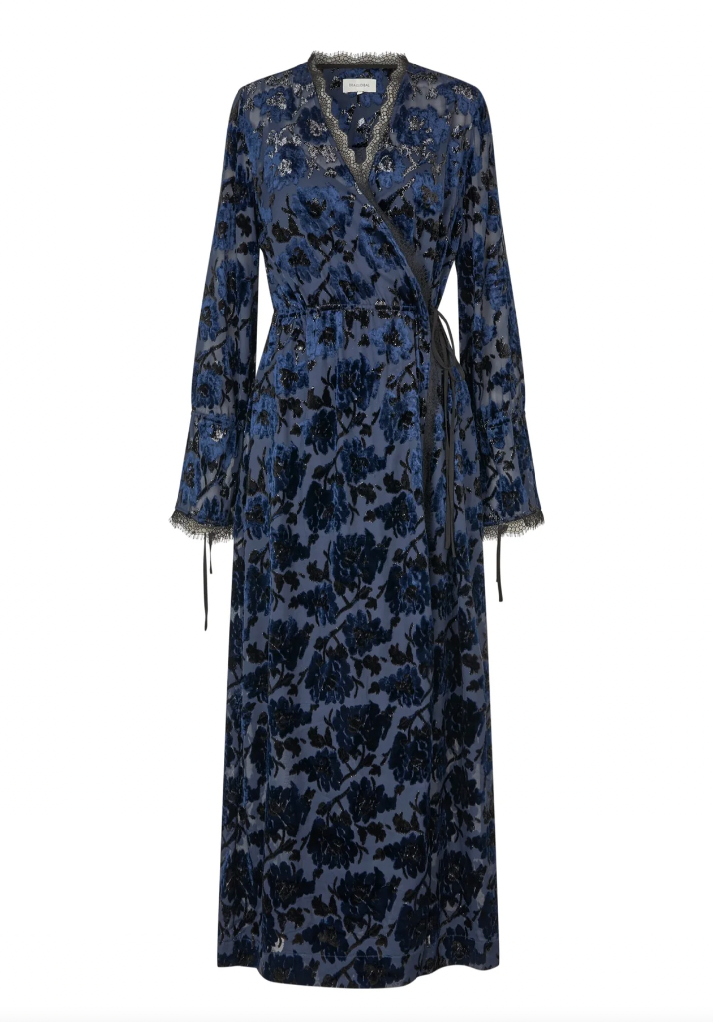Easy to wear but with a definite sense of glamour, this long wrap dress is made from a rich and luxurious devoré velvet in deep navy blue with a floral motif. Tied at the waist, it has delicate lace trim at neck and cuffs and fine tape is used to pull in the sleeves to form a cuff. The dress comes with a navy blue slip dress.