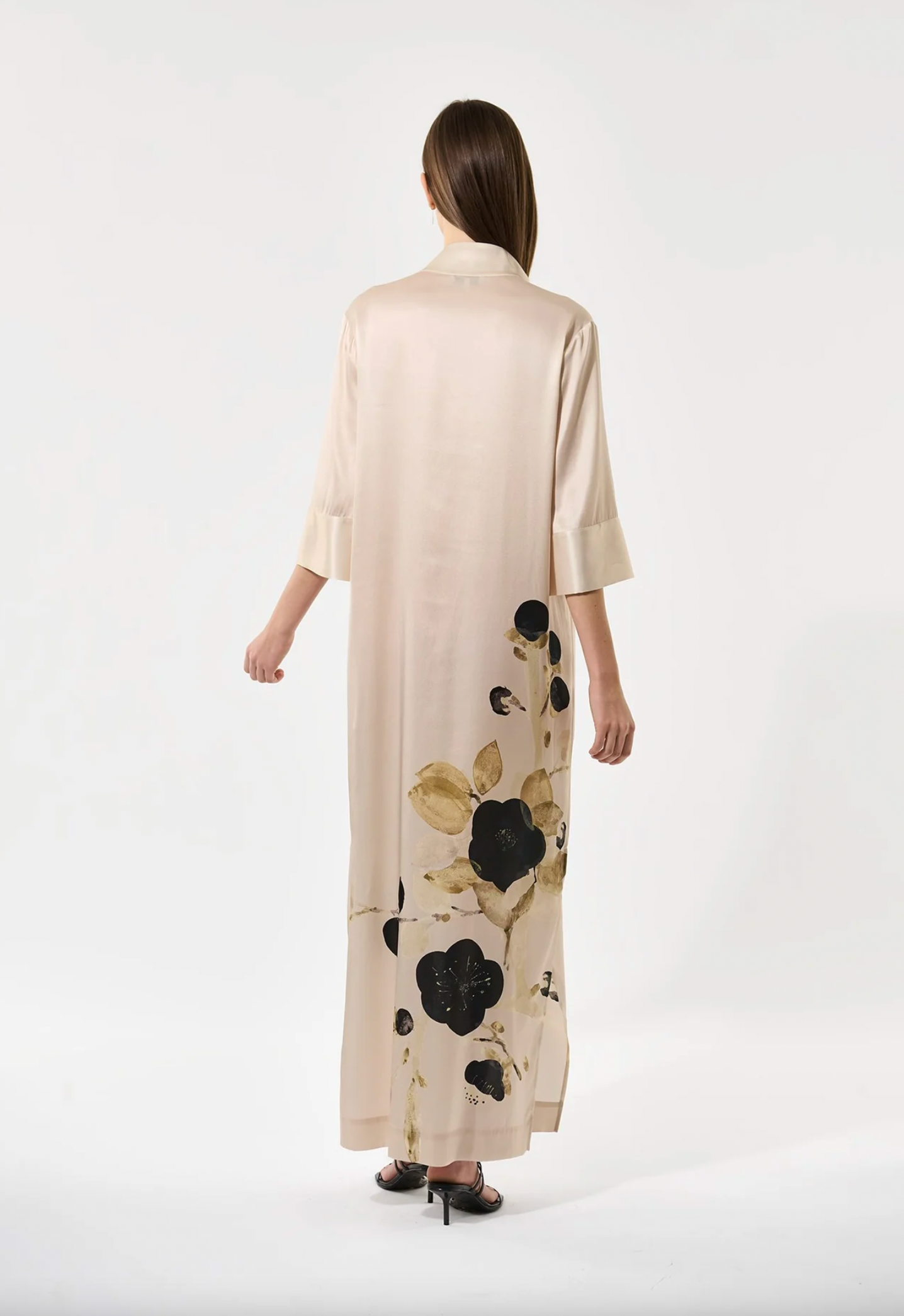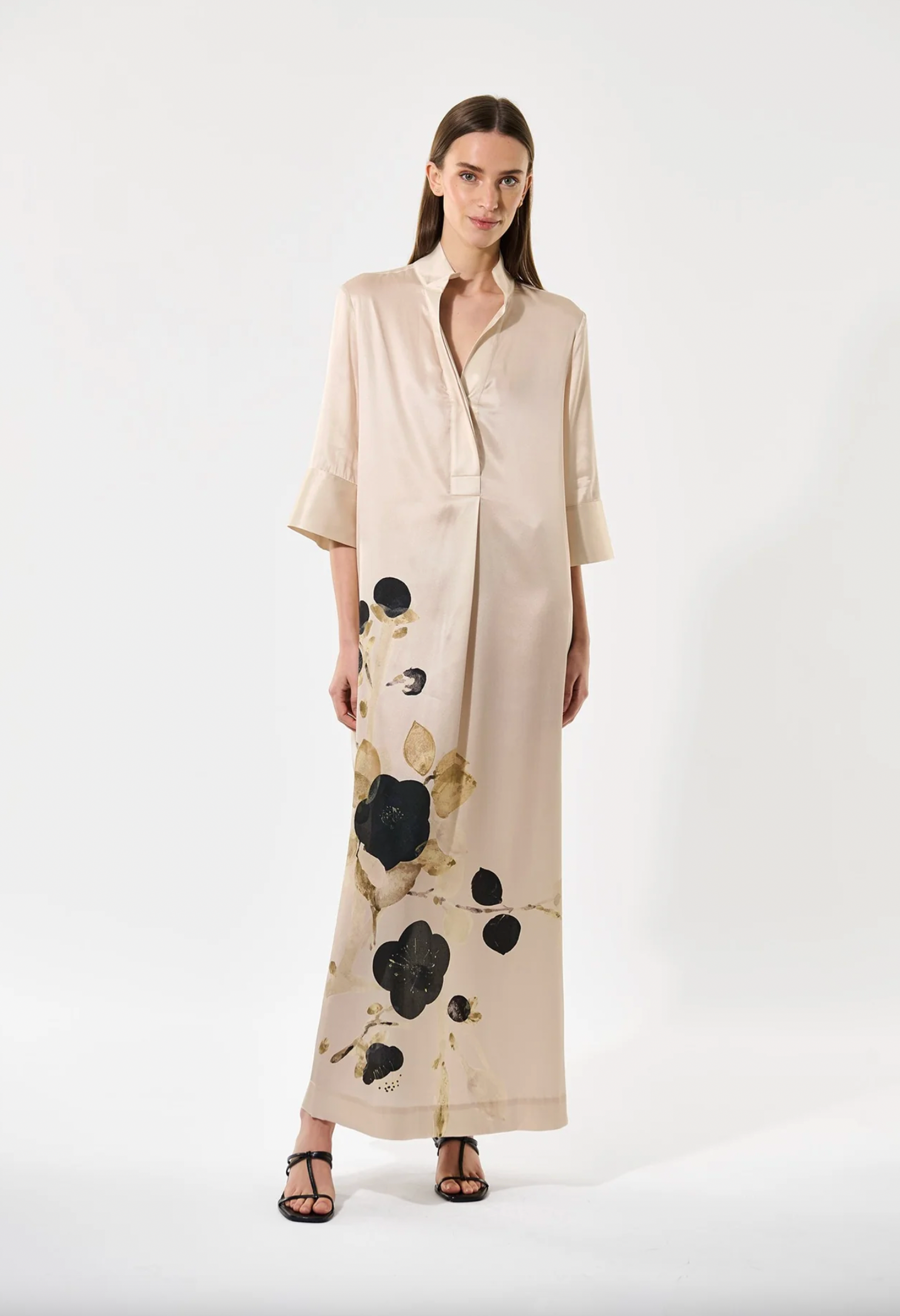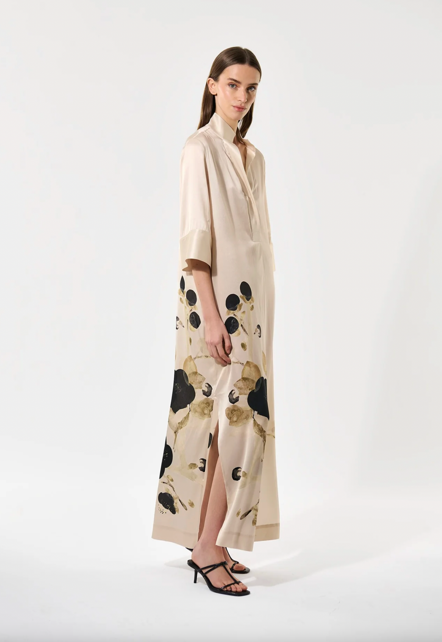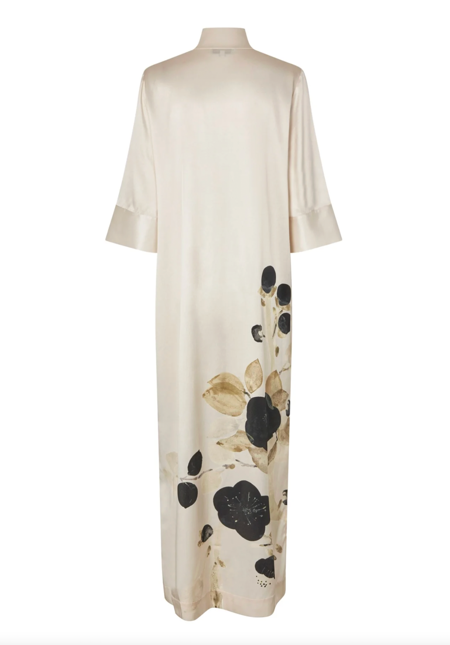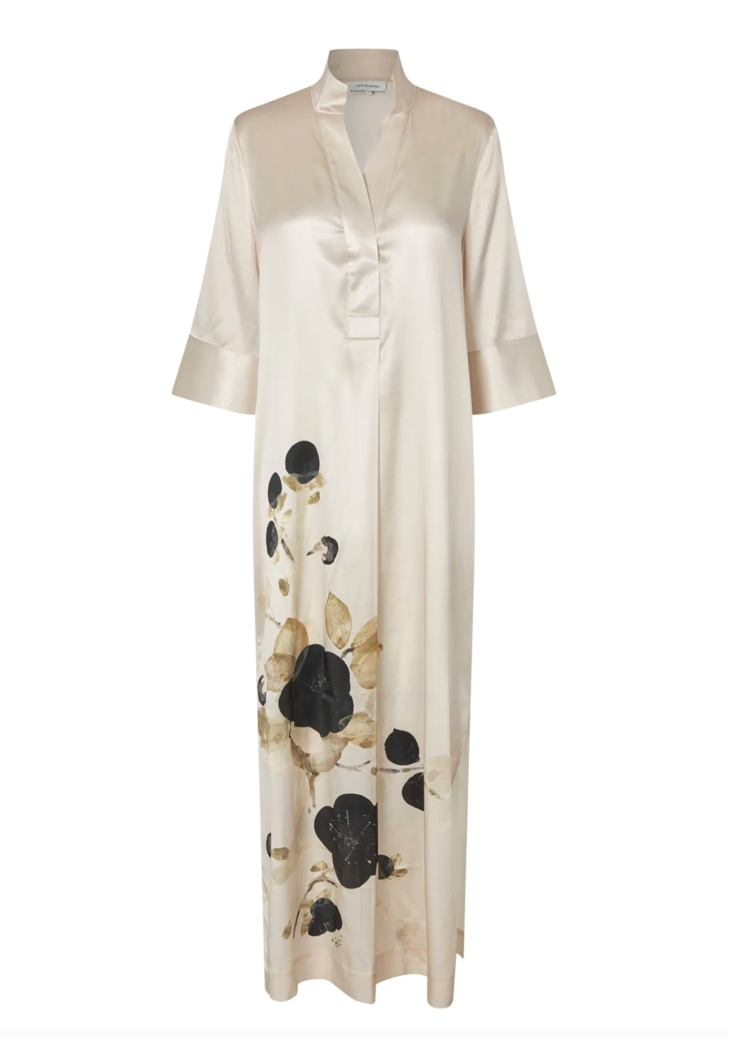 A beloved Dea Kudibal classic, Helga is a relaxed fit full length silk dress with a kimono style neckline, stand collar and 3/4 length wide sleeves. This version comes in a spectacular print featuring lotus flowers that appear to be growing from the hem.