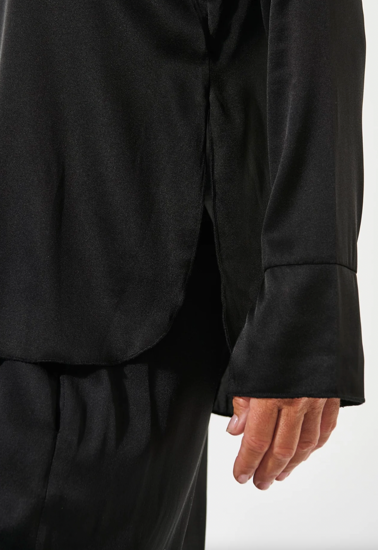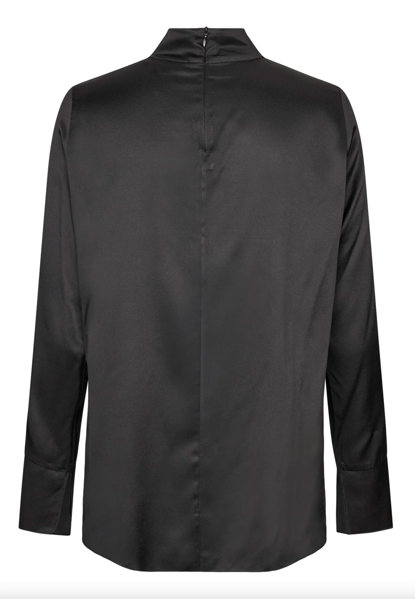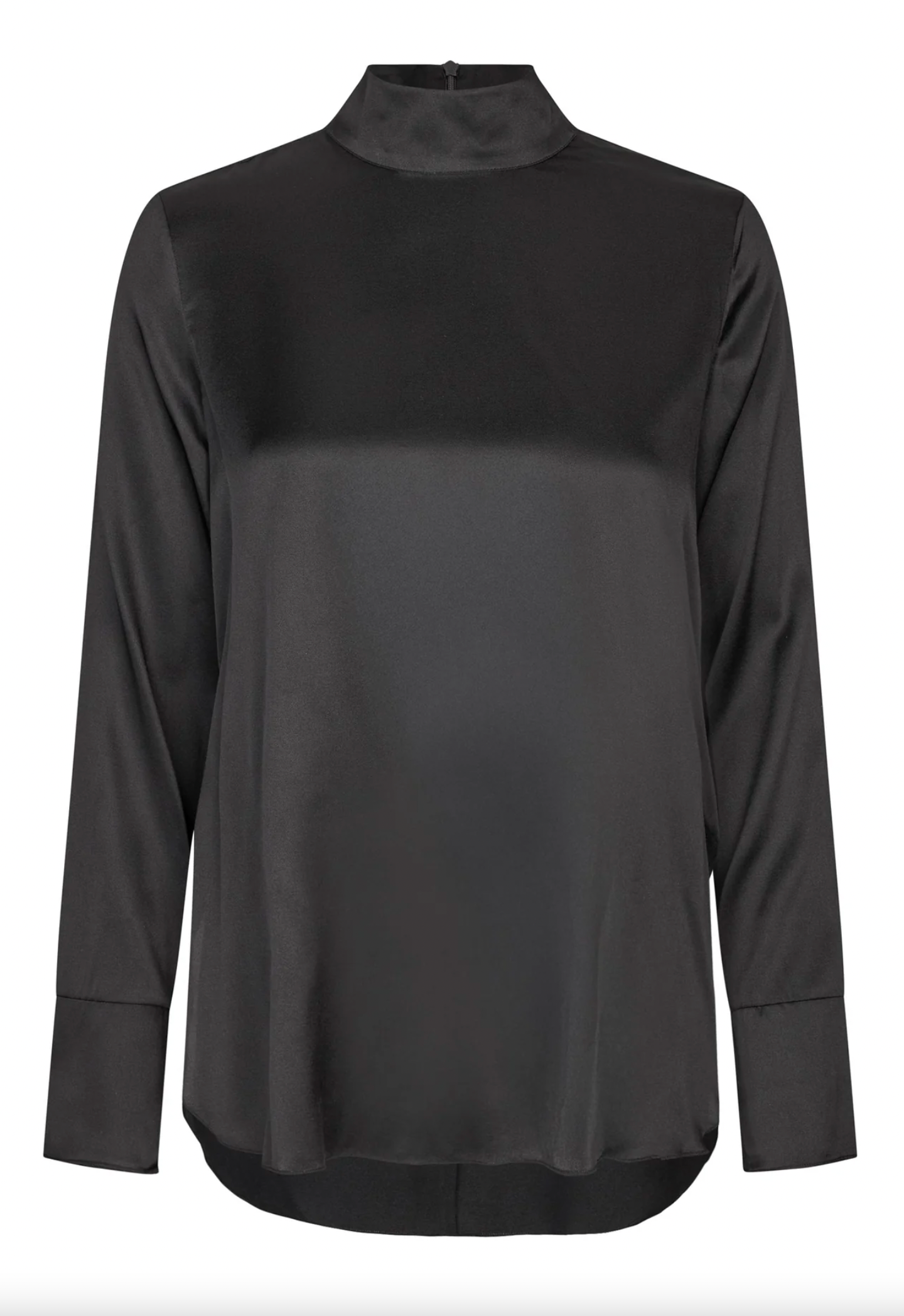 Totally minimalist and utterly chic, this jet black silk twill high neck top with long sleeves works as a beautiful contrast to a patterned skirt or trousers or as a sophisticated layering piece under a blazer. Body skimming in silhouette, it is fastened by a hidden zip at the back neck.