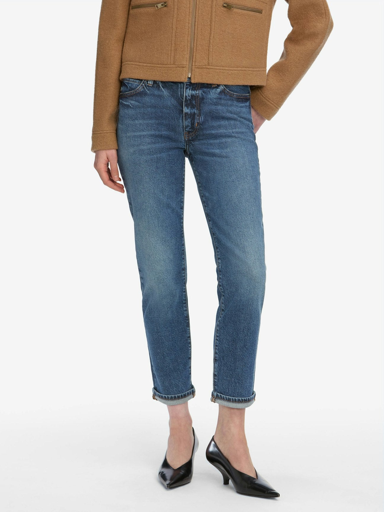 A boyfriend jean for the new millennium, this mid-rise silhouette hugs the hip and finishes at the ankle. Cut in Structured Stretch denim for vintage character and modern comfort, in a black wash we love cuffed—but is just as good unrolled.