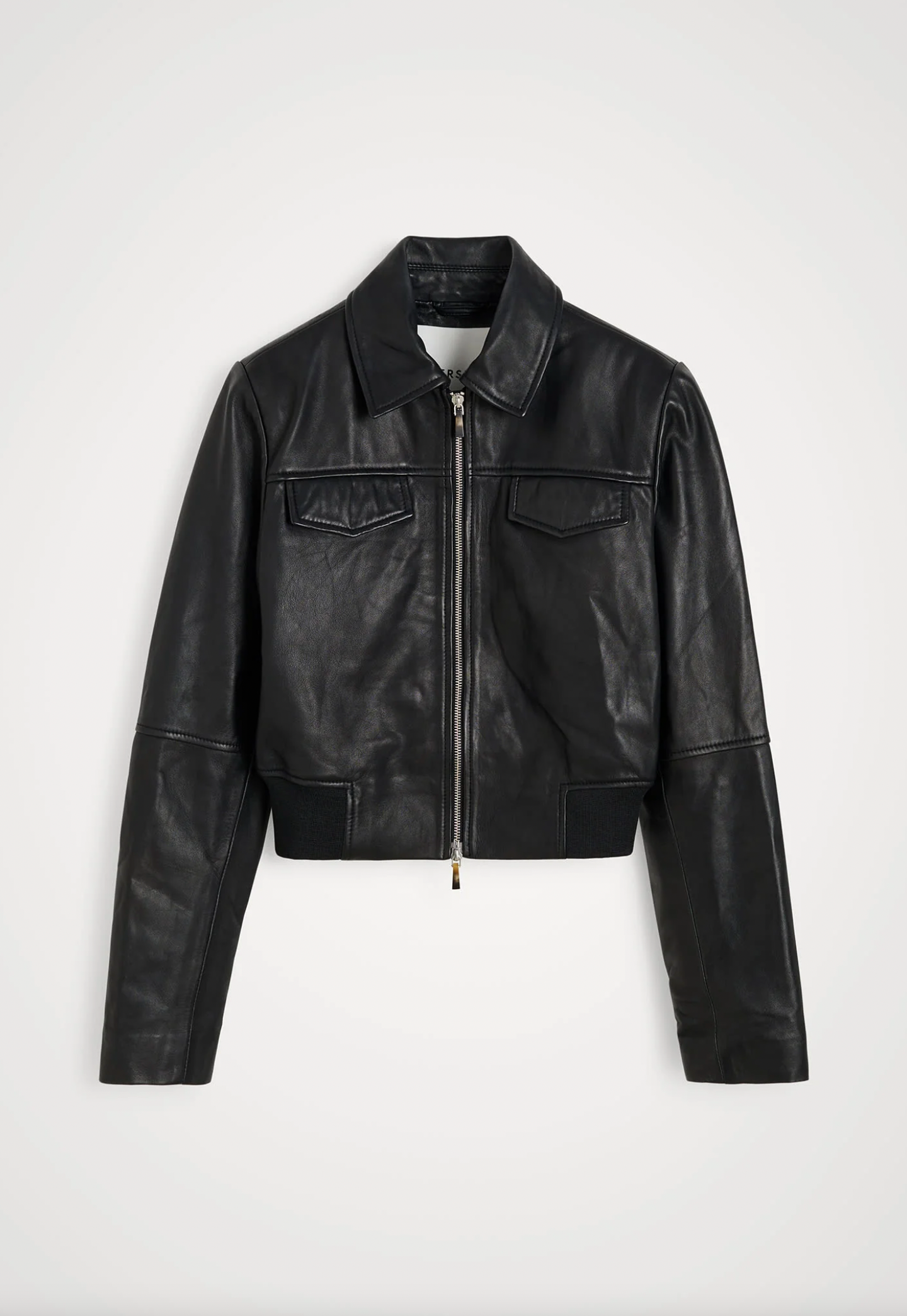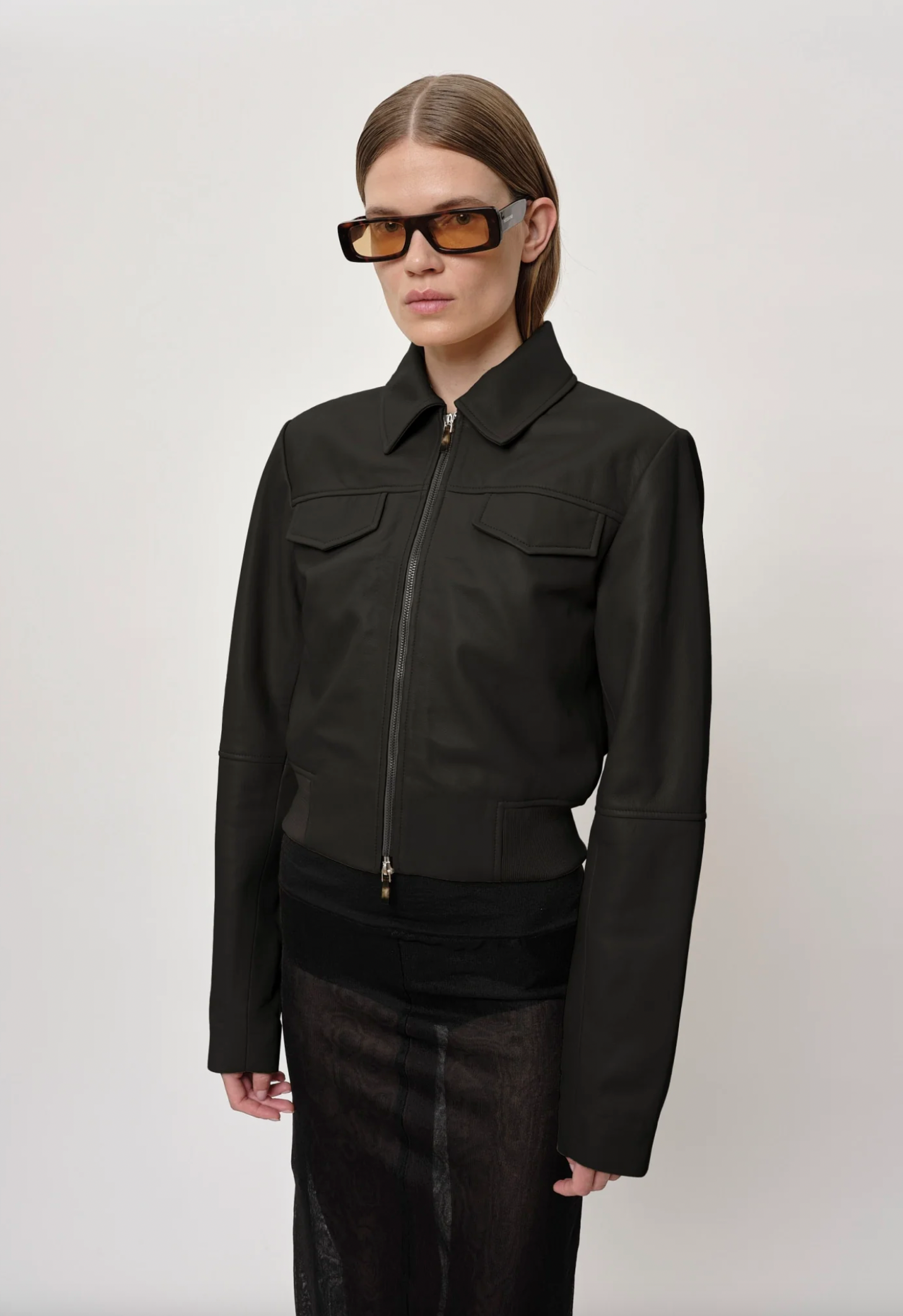 Introducing the Joelle Leather Jacket: A cropped leather jacket with a zipper, featuring a round neck with collar, cutline at the front. It has two paspel pockets and an elastic waistband.