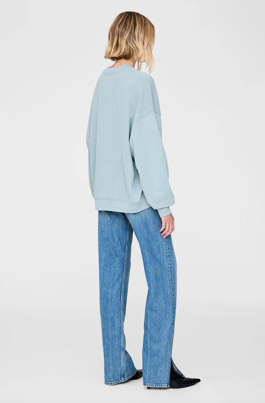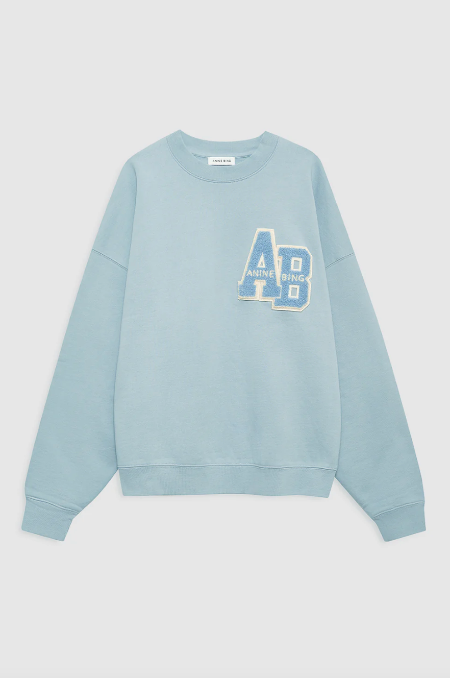 The Miles Oversized Sweatshirt Letterman is an oversized crewneck pullover made from midweight 100% organic cotton fleece in a pastel blue. This relaxed casual features a custom ANINE BING letterman chenille patch graphic at the chest.