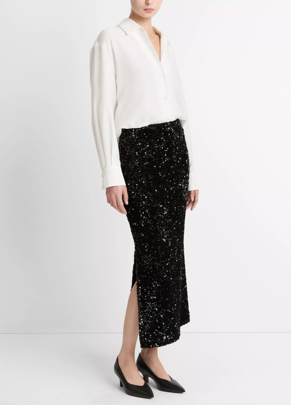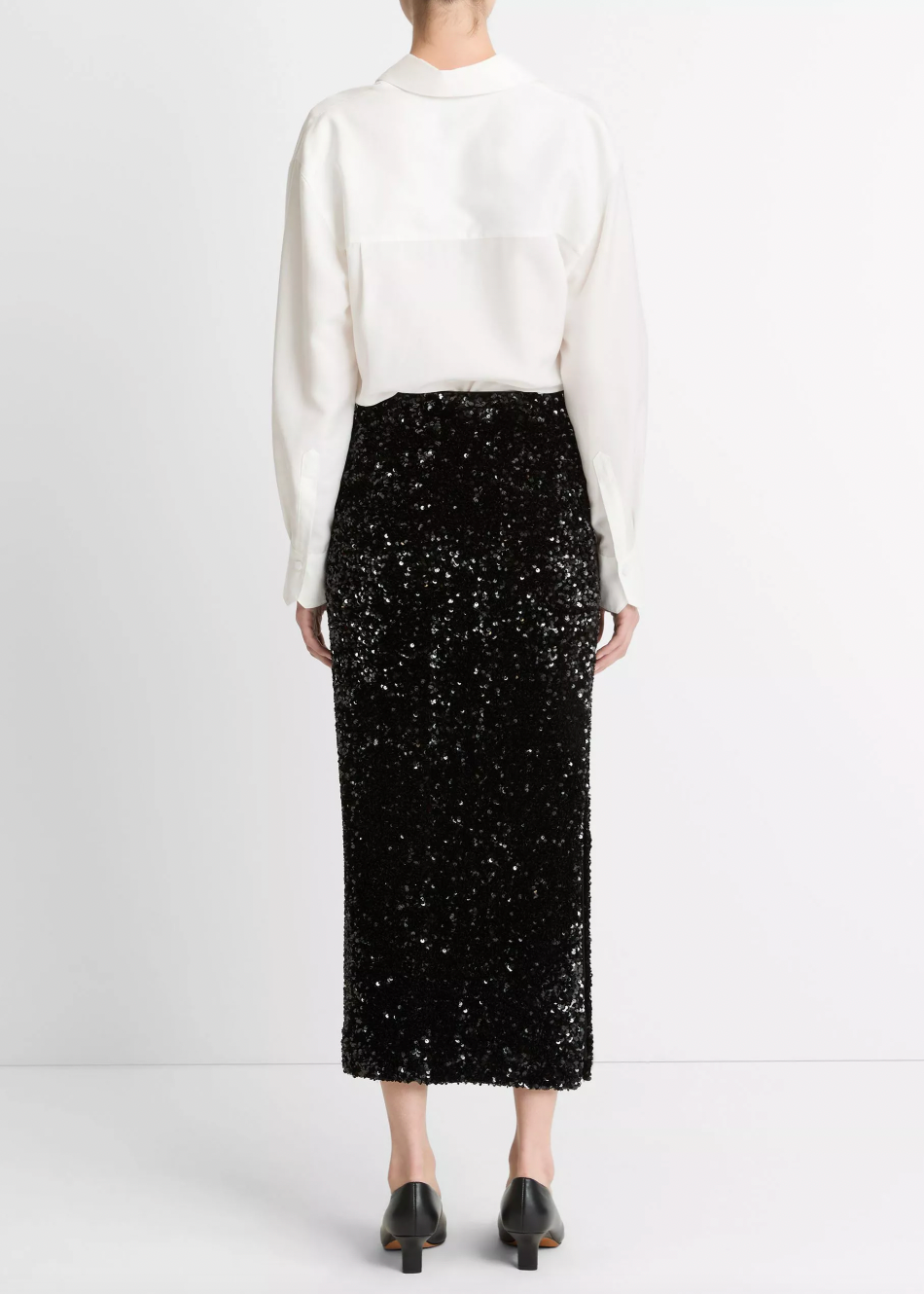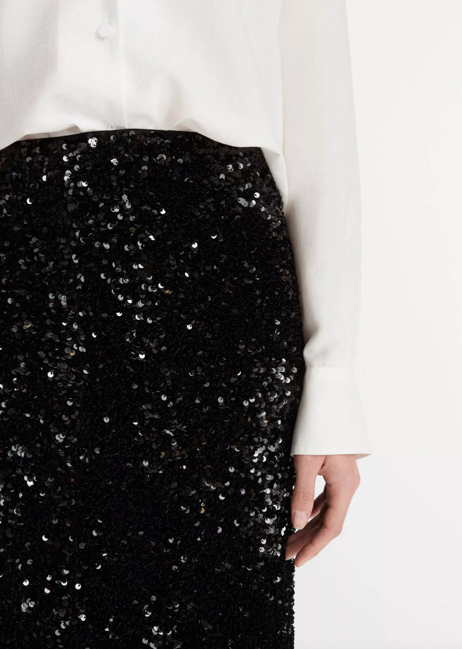 Stretchy, sumptuous black velvet is appliquéd with thousands of tonal metallic sequins, lending this skirt its rich, mesmerizing texture and dimension.