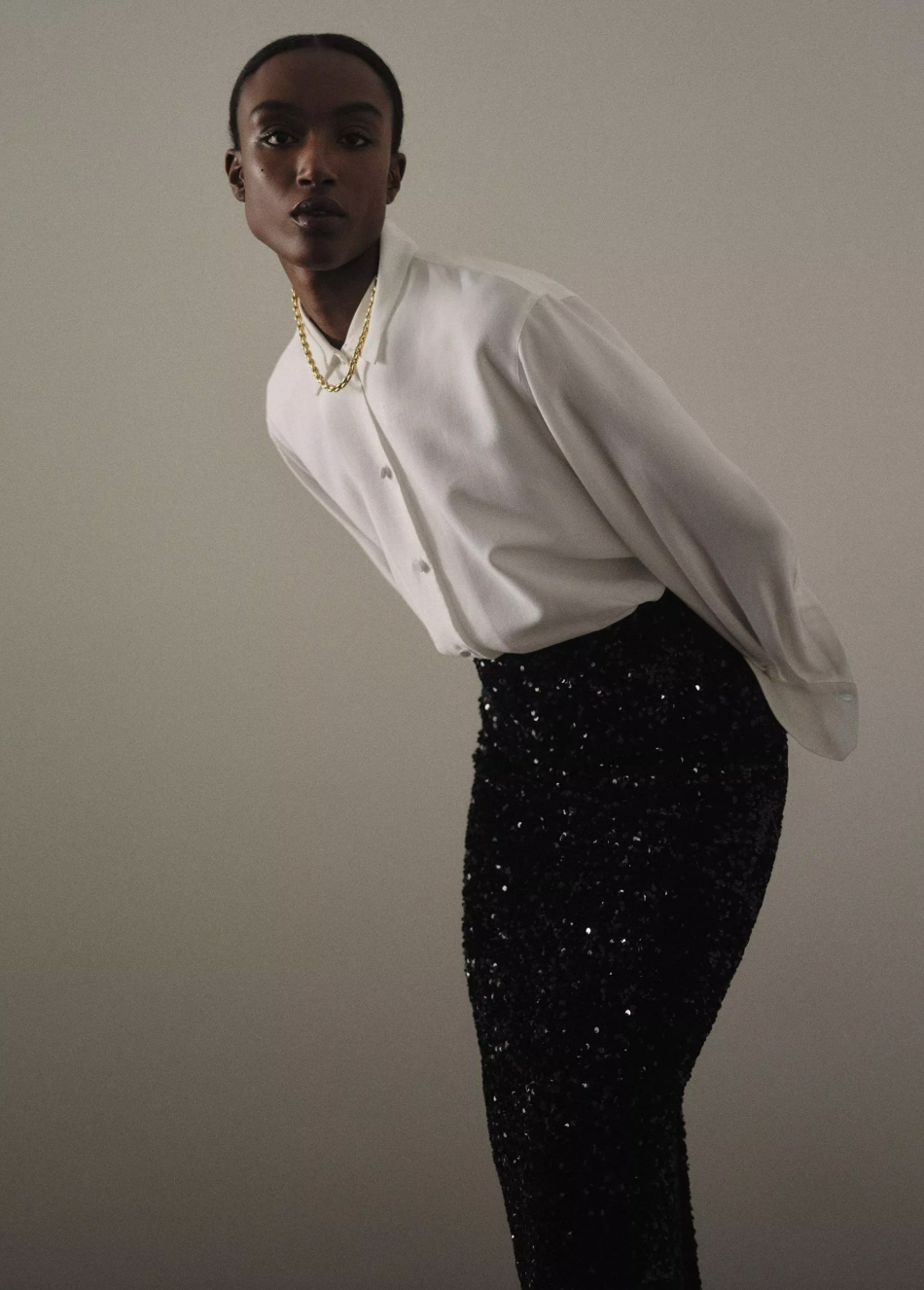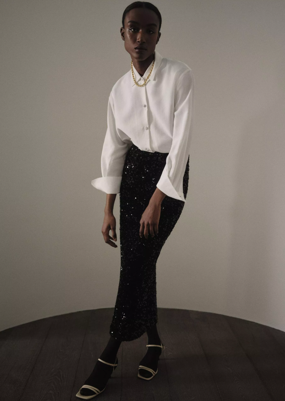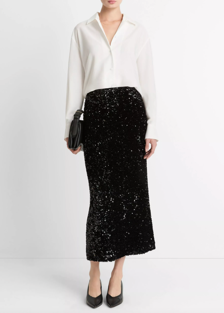 Stretchy, sumptuous black velvet is appliquéd with thousands of tonal metallic sequins, lending this skirt its rich, mesmerizing texture and dimension.