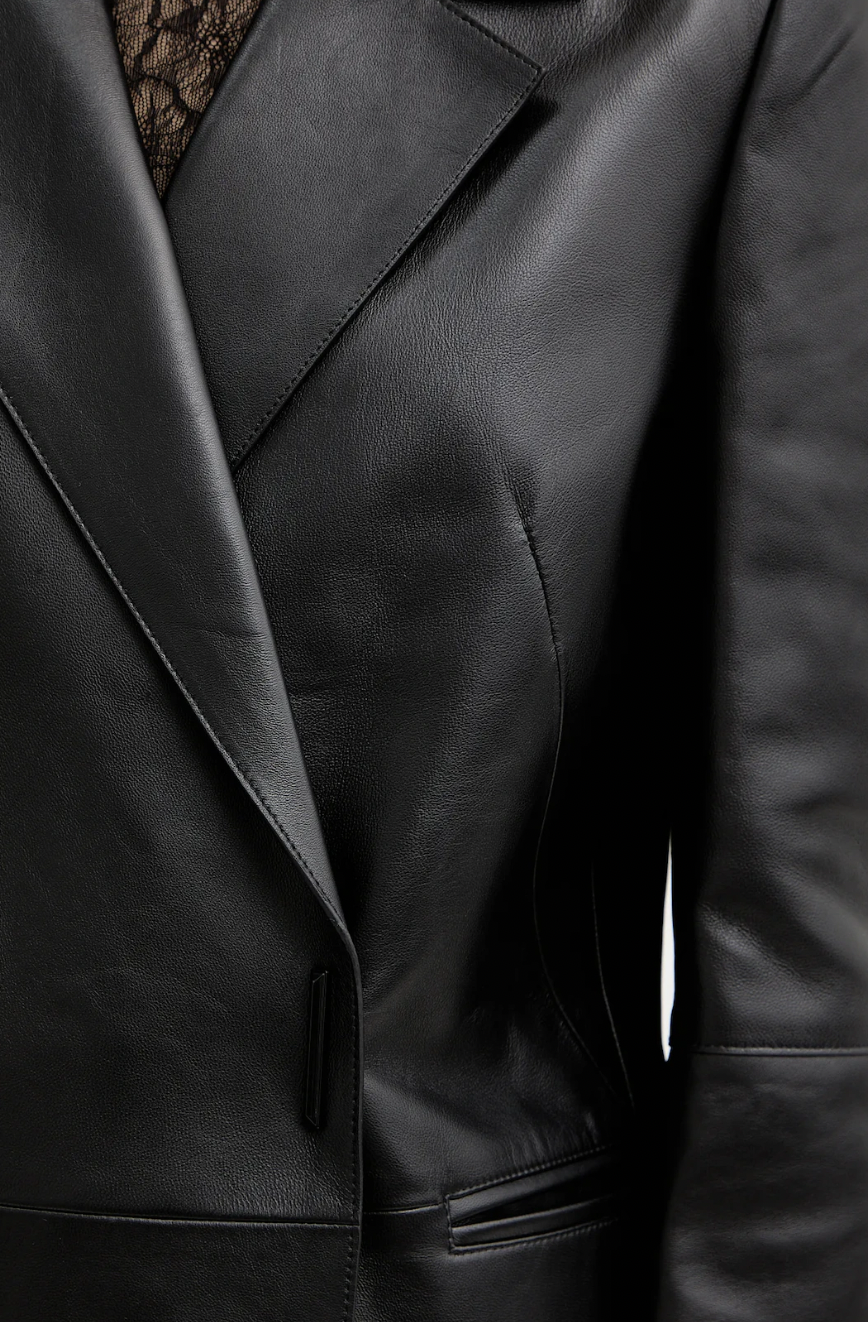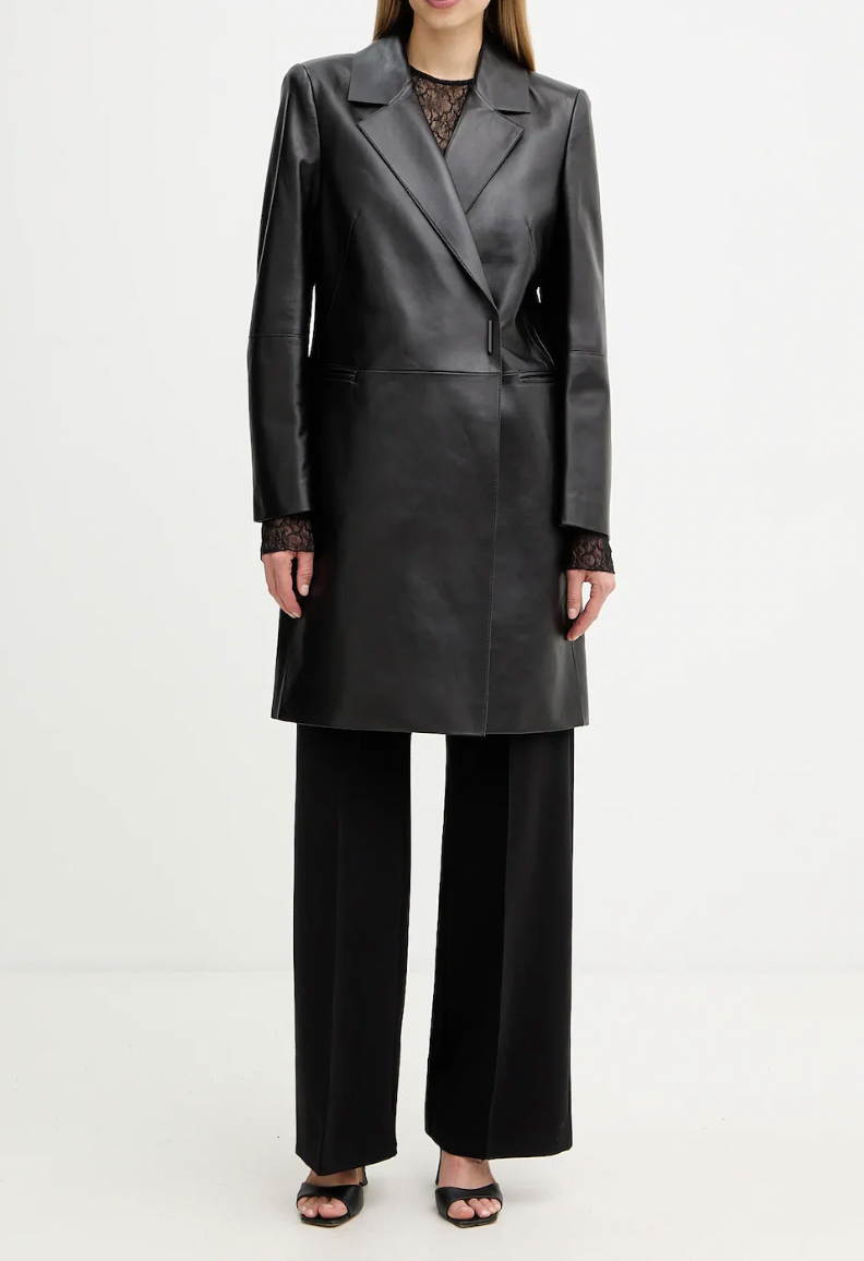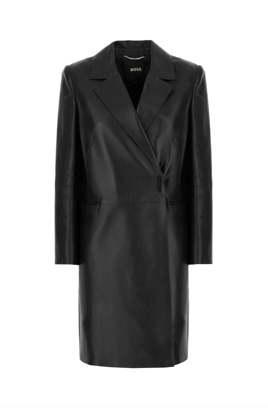 A coat from the BOSS collection. This unlined model is made of genuine leather. Lambskin is very flexible, soft, and durable.