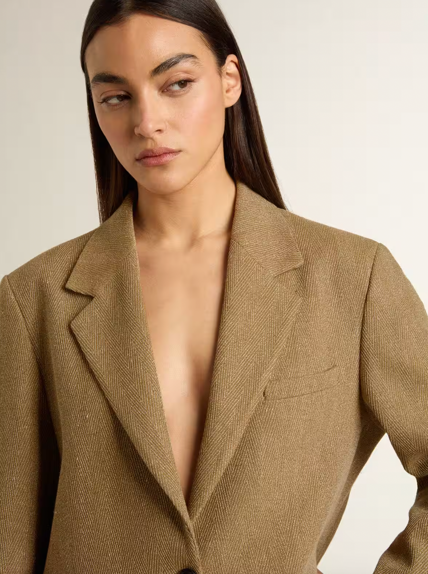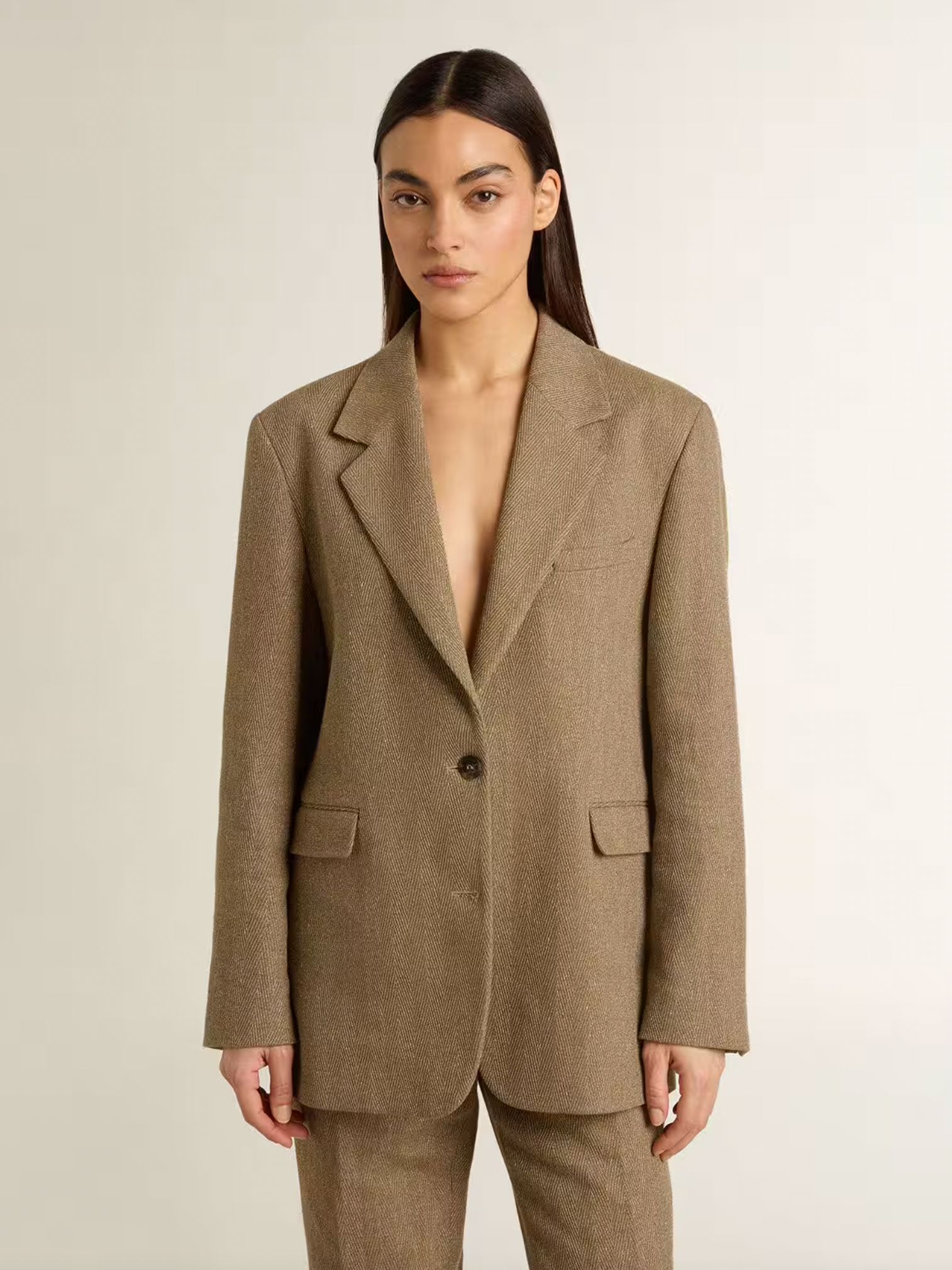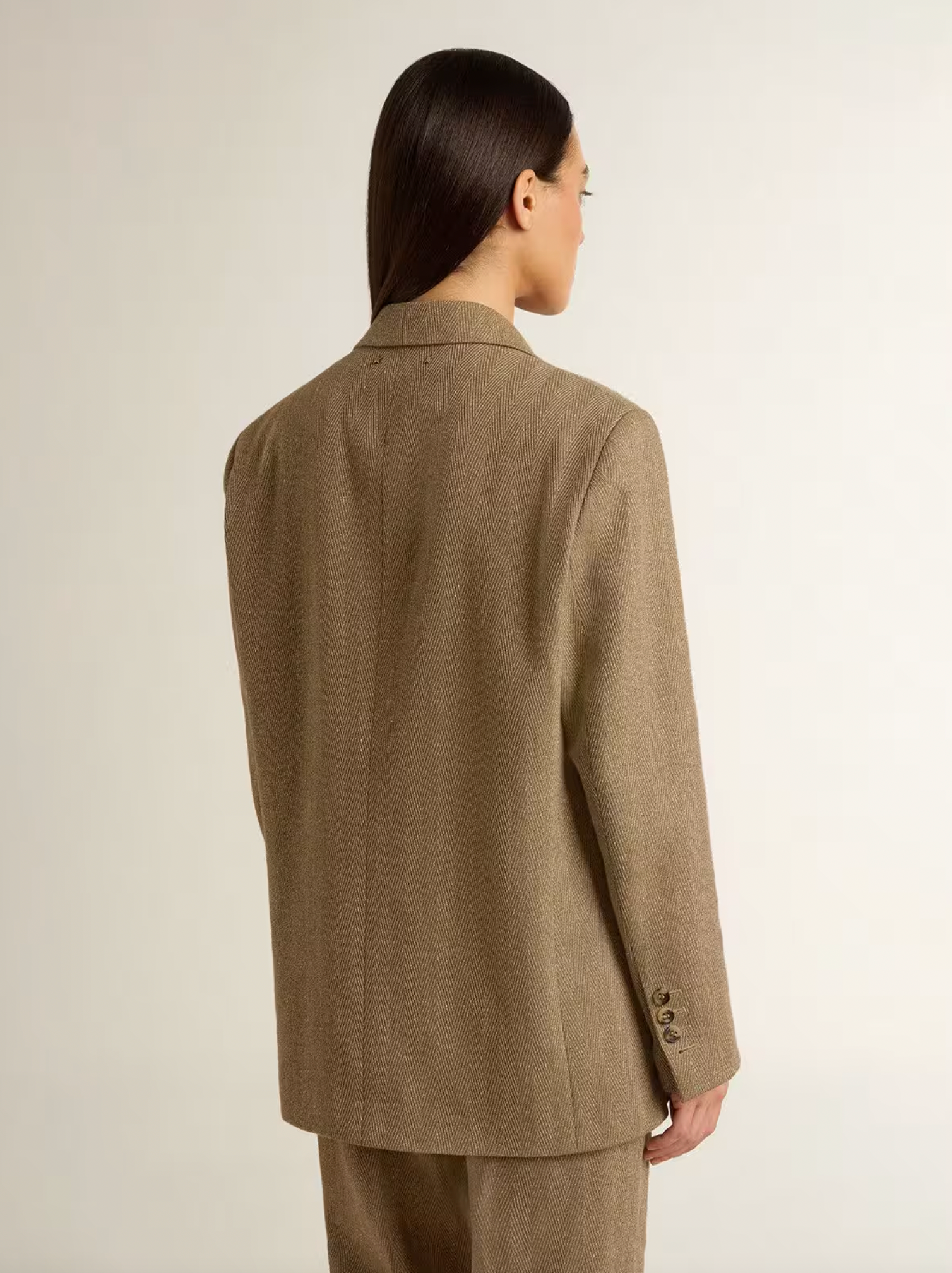 Inspired by the iconic Seventies, the carefree spirit of that era comes to life with the first drop of our Fall/Winter 25 collection. This regular-fit single-breasted blazer in sand-colored herringbone linen blend features two front pockets and two buttons as a fastening. The double star on the back adds the finishing touch.