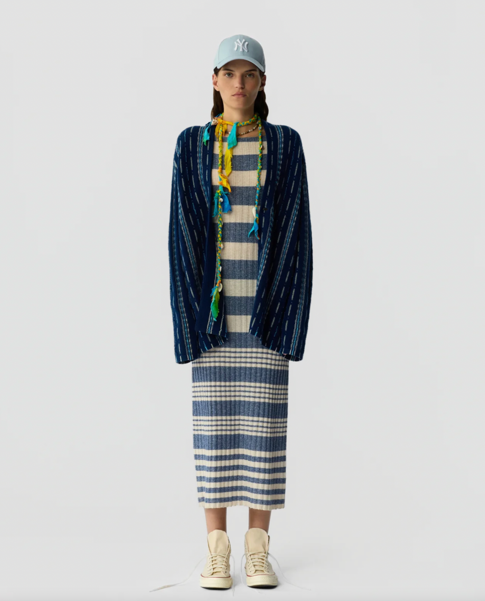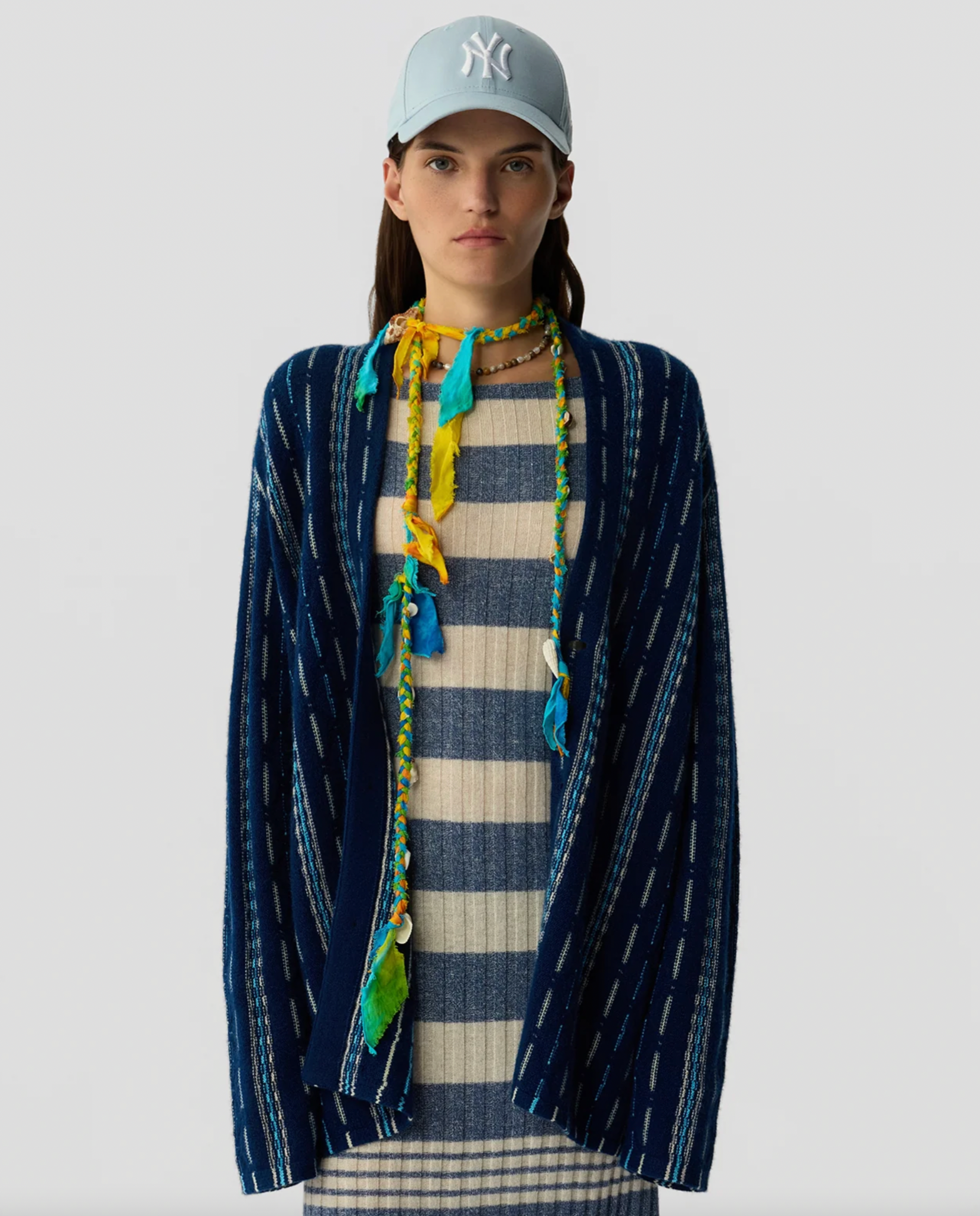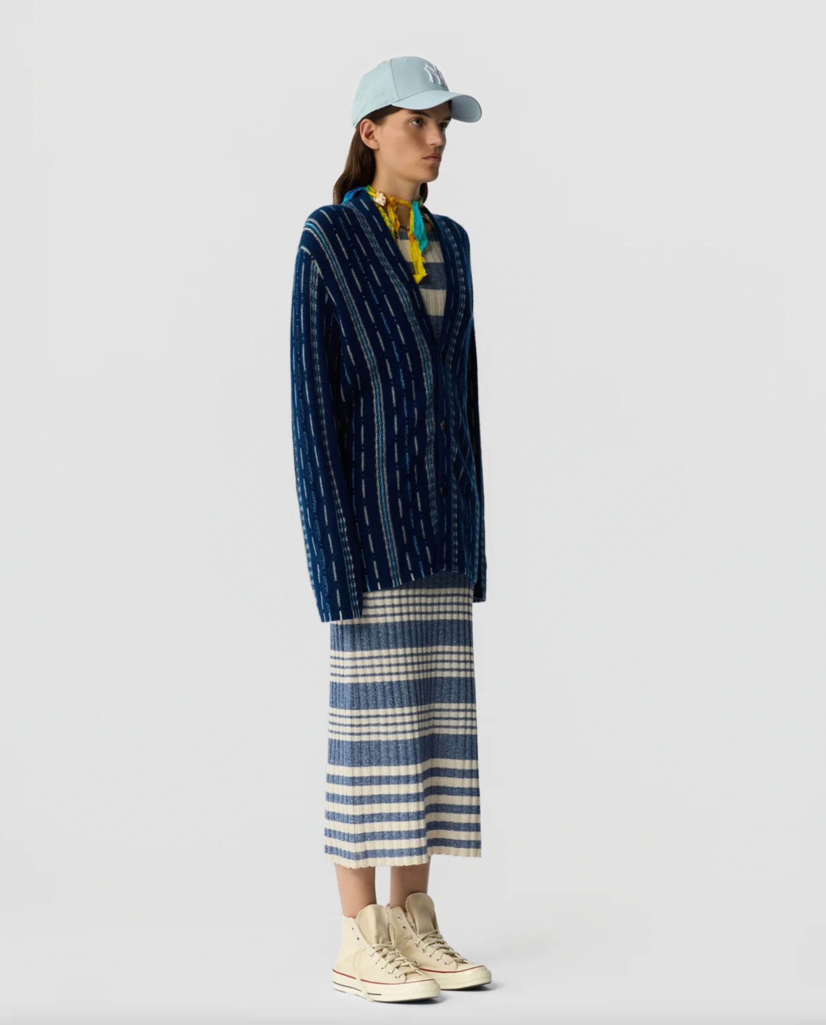 The Baja Everywear Cardigan is a unisex striped cardigan featuring our signature Everywear silhouette, updated with a four-color jacquard stripe and raised texture. This mid-weight knit cardigan is finished with a three-button front and relaxed shape, making it an effortless layer worn open or buttoned up.