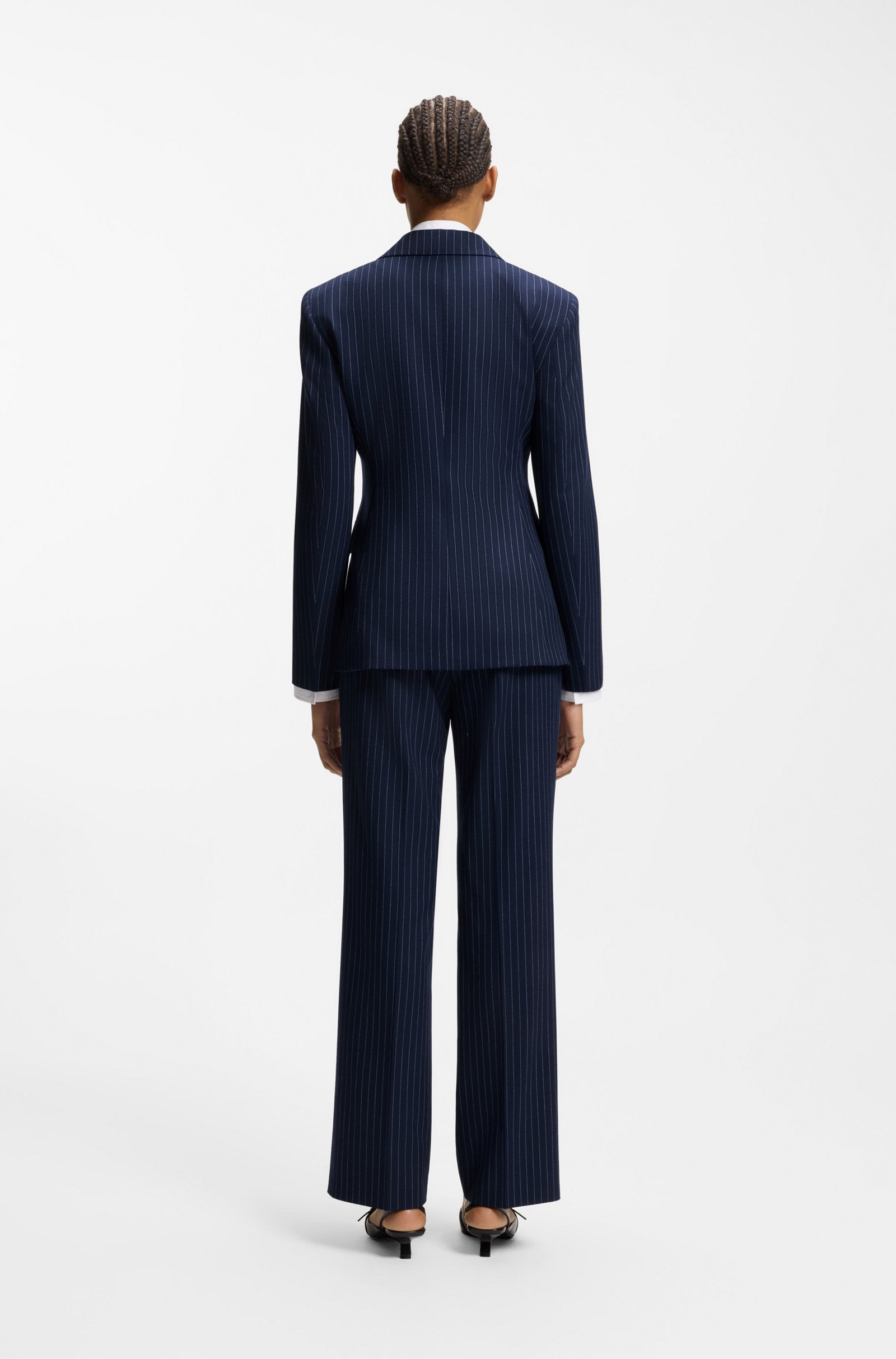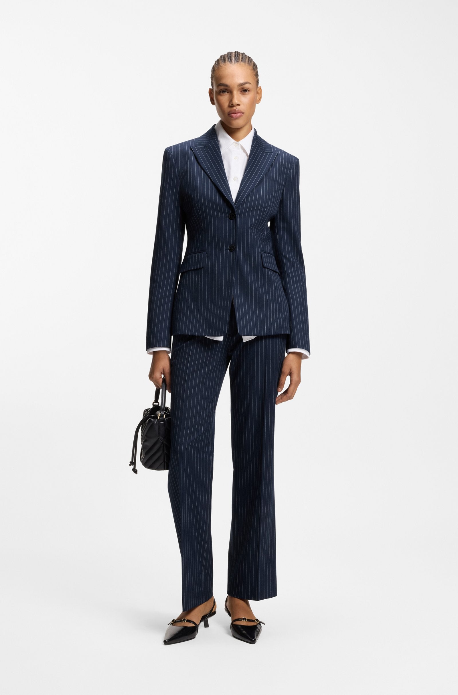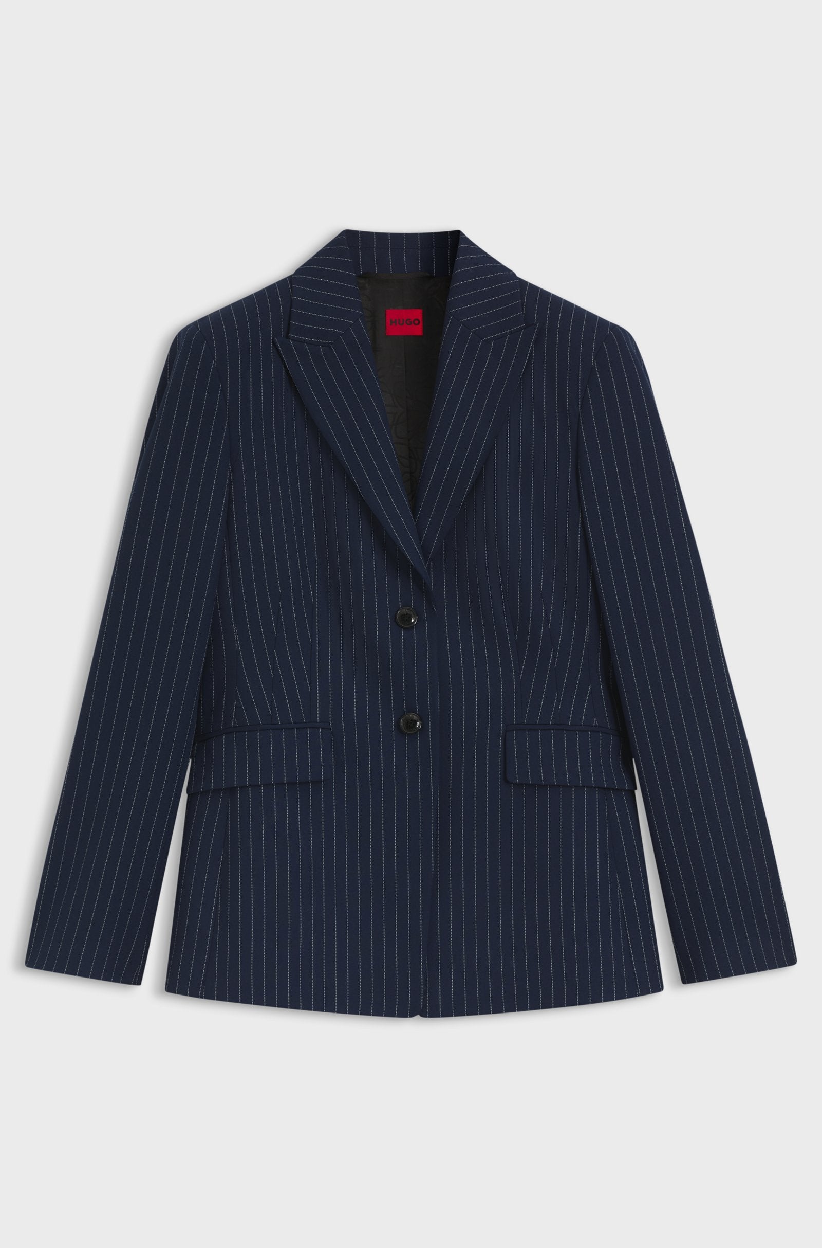 Create classic formal looks with the pinstripe pattern and straight cut of this HUGO Womenswear blazer. Crafted in stretch fabric for comfort.