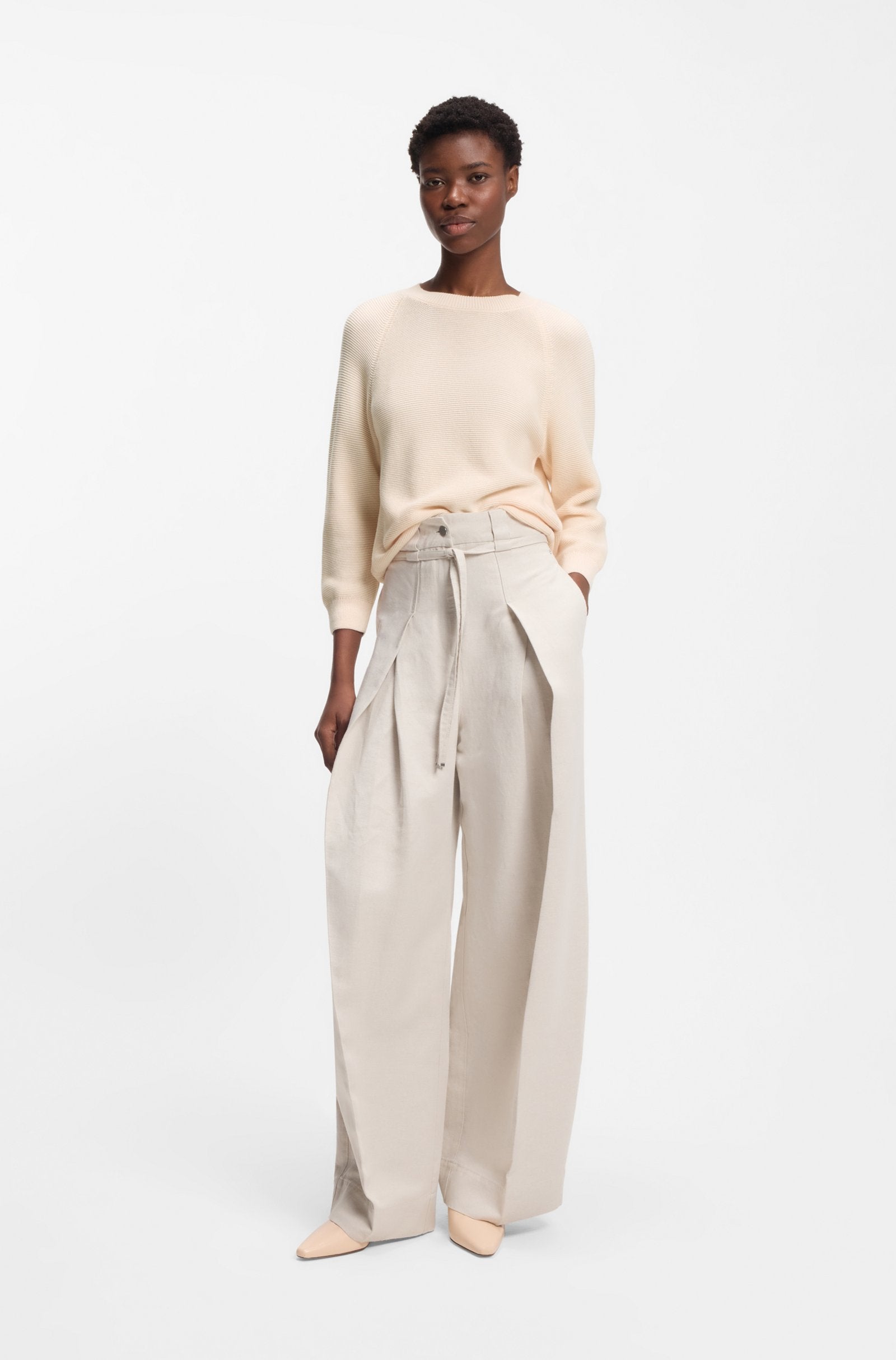 Layer up in luxury with the soft cotton yarn and structured knit of this BOSS Womenswear sweater. Cut to a laid-back fit.