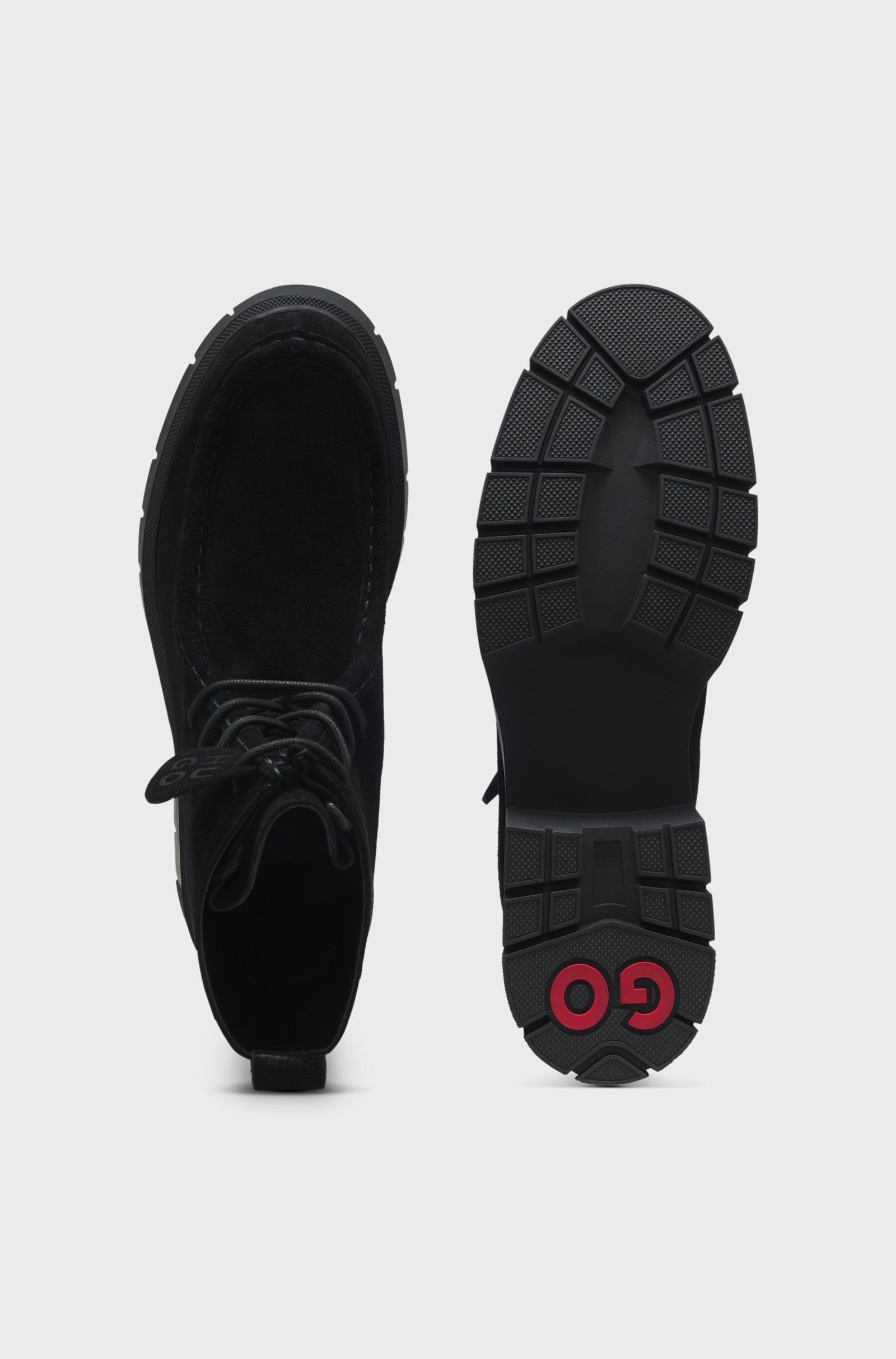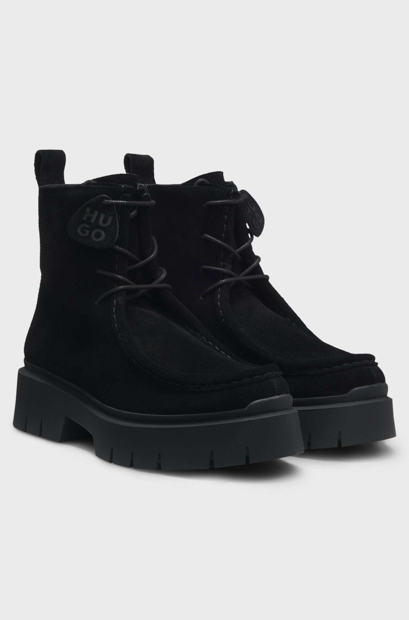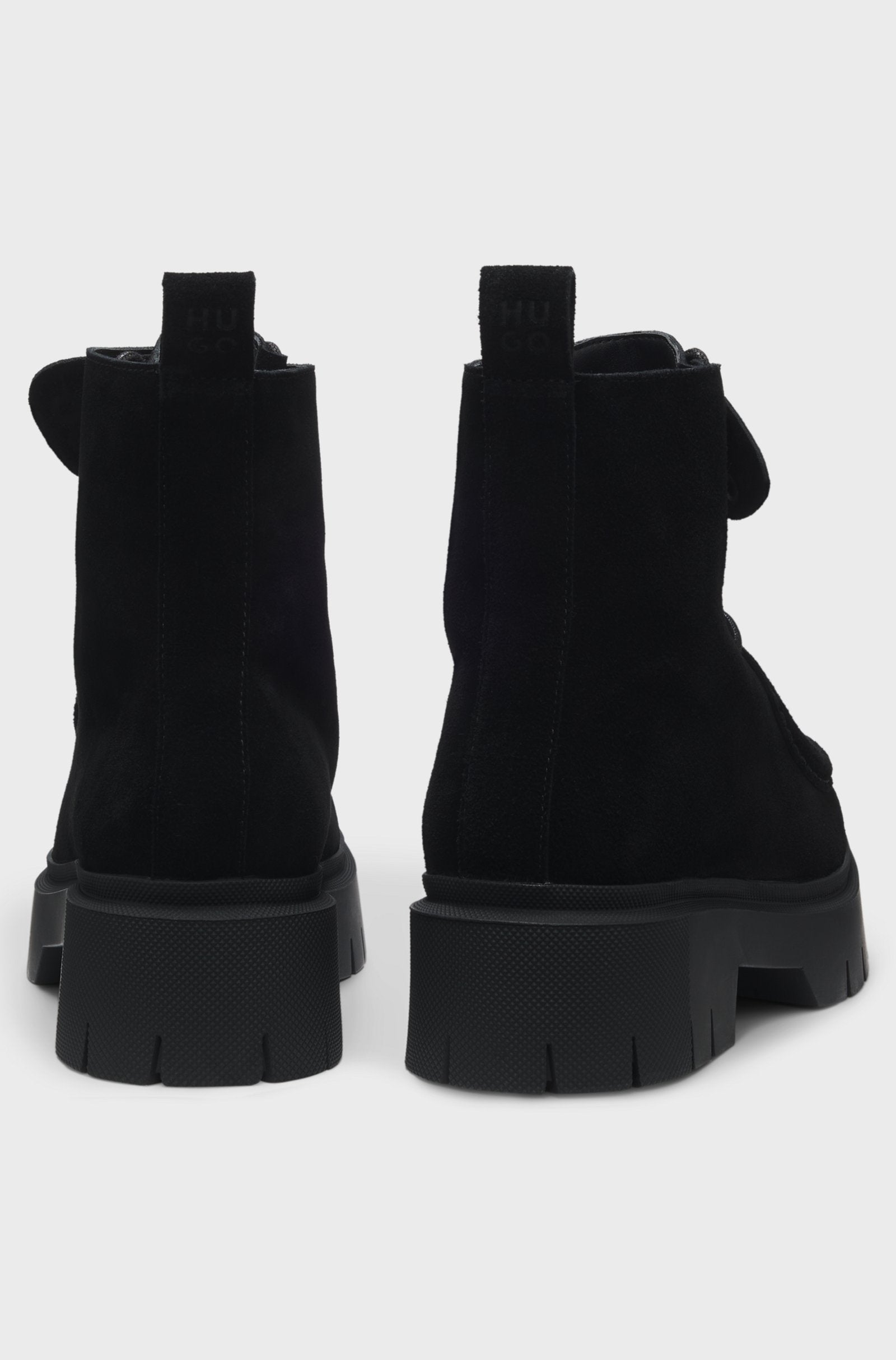 Add a modern finish to everyday looks with the suede uppers and chunky outsole of these HUGO Womenswear boots. Detachable logo tag for versatile styling. This product contains at least 60% better raw materials. We continuously look for more responsible ways to produce and finish our products. A minimum of 60% of the leather used to make this product has been sourced from certified tanneries.