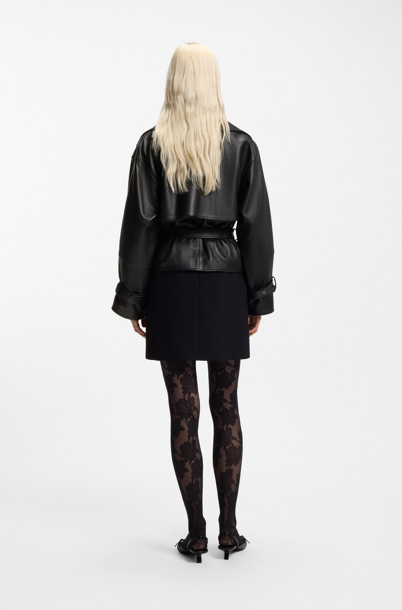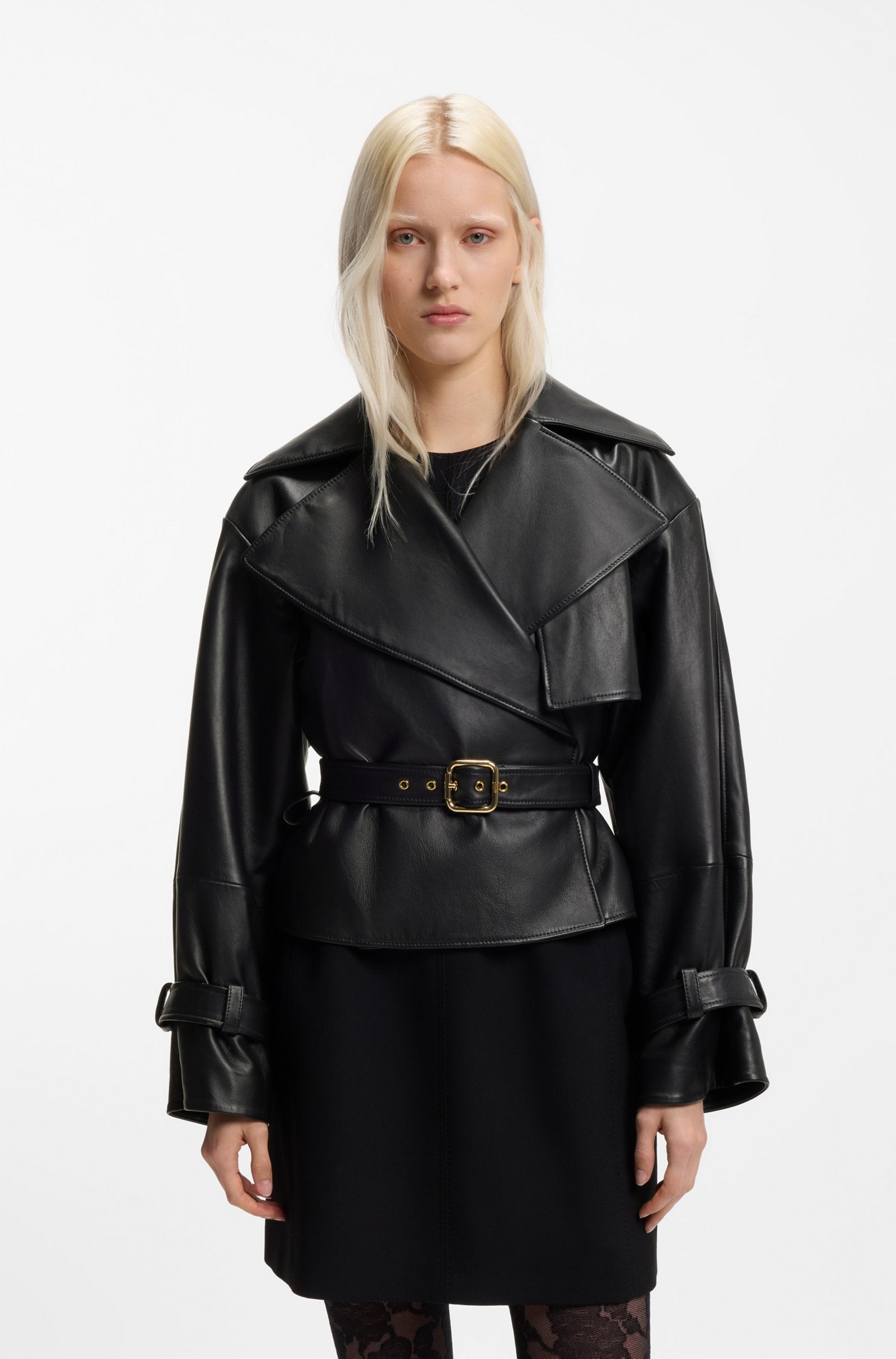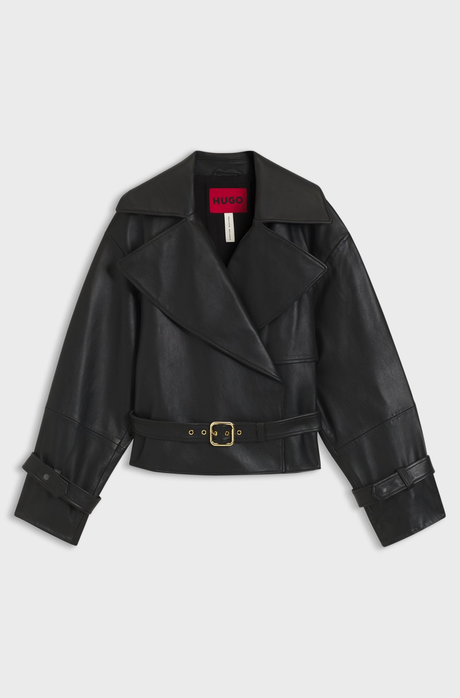 Updating a wardrobe essential, this relaxed-fit HUGO Womenswear jacket is cut in lustrous leather with an eyelet belt. Wide sleeves with cuff straps.