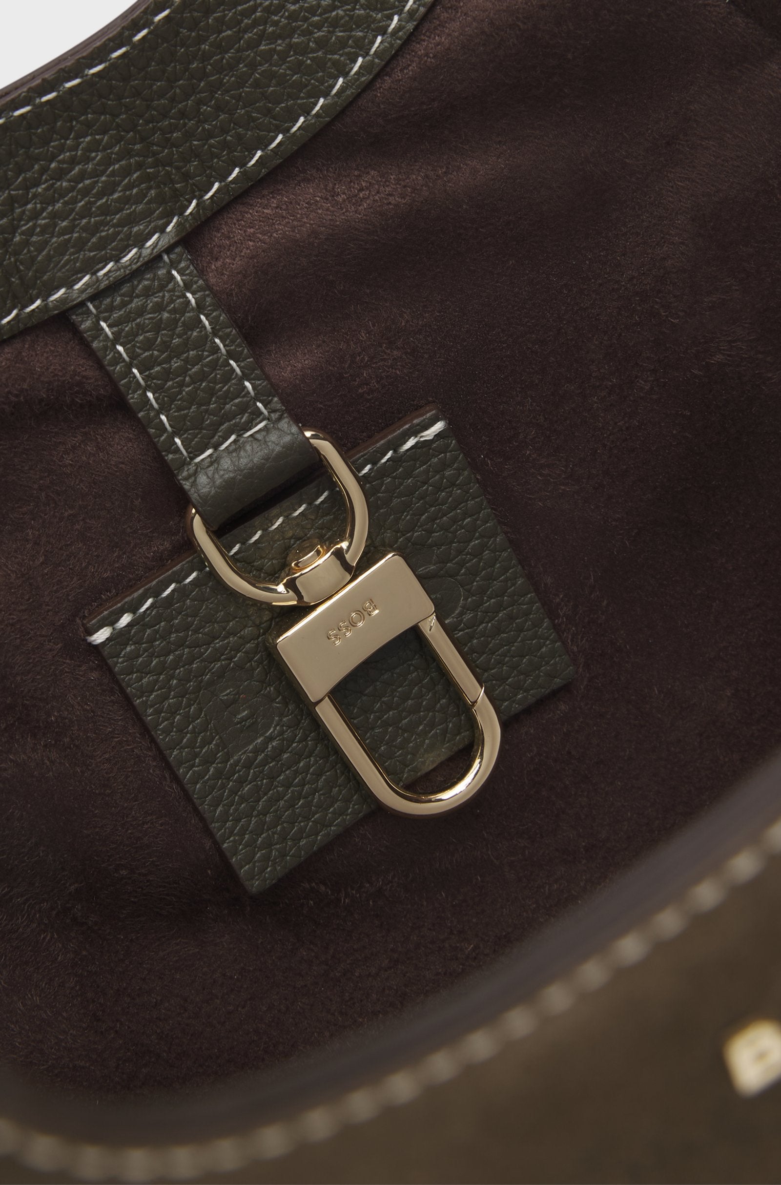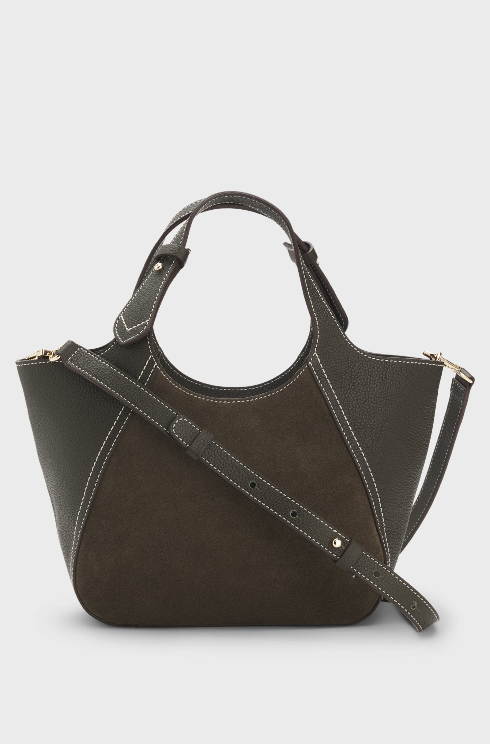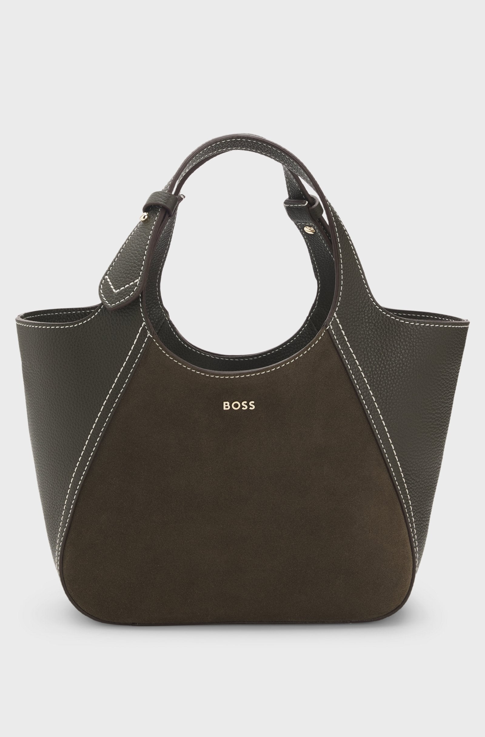 Adjustable for a custom drop, this BOSS Womenswear tote bag combines richly grained leather with supple suede for contemporary style. Metallic logo lettering.