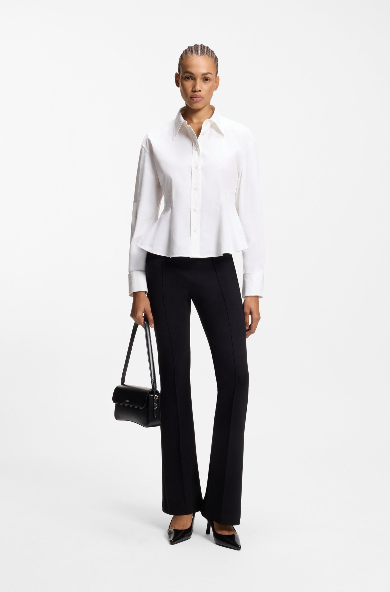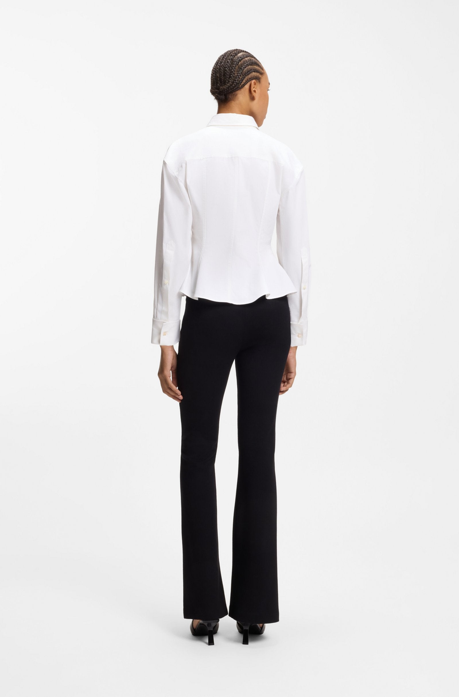 Create an elegant profile with the relaxed fit, dropped shoulders and peplum hem of this HUGO Womenswear blouse. Cotton twill for natural comfort. This product contains at least 80% better raw materials. This piece is made with at least 80% cotton derived from regenerative agriculture. Regenerative agriculture prioritises the preservation and restoration of natural environments, aiming to enhancebiodiversity, maintain water quality, and improve soil health.