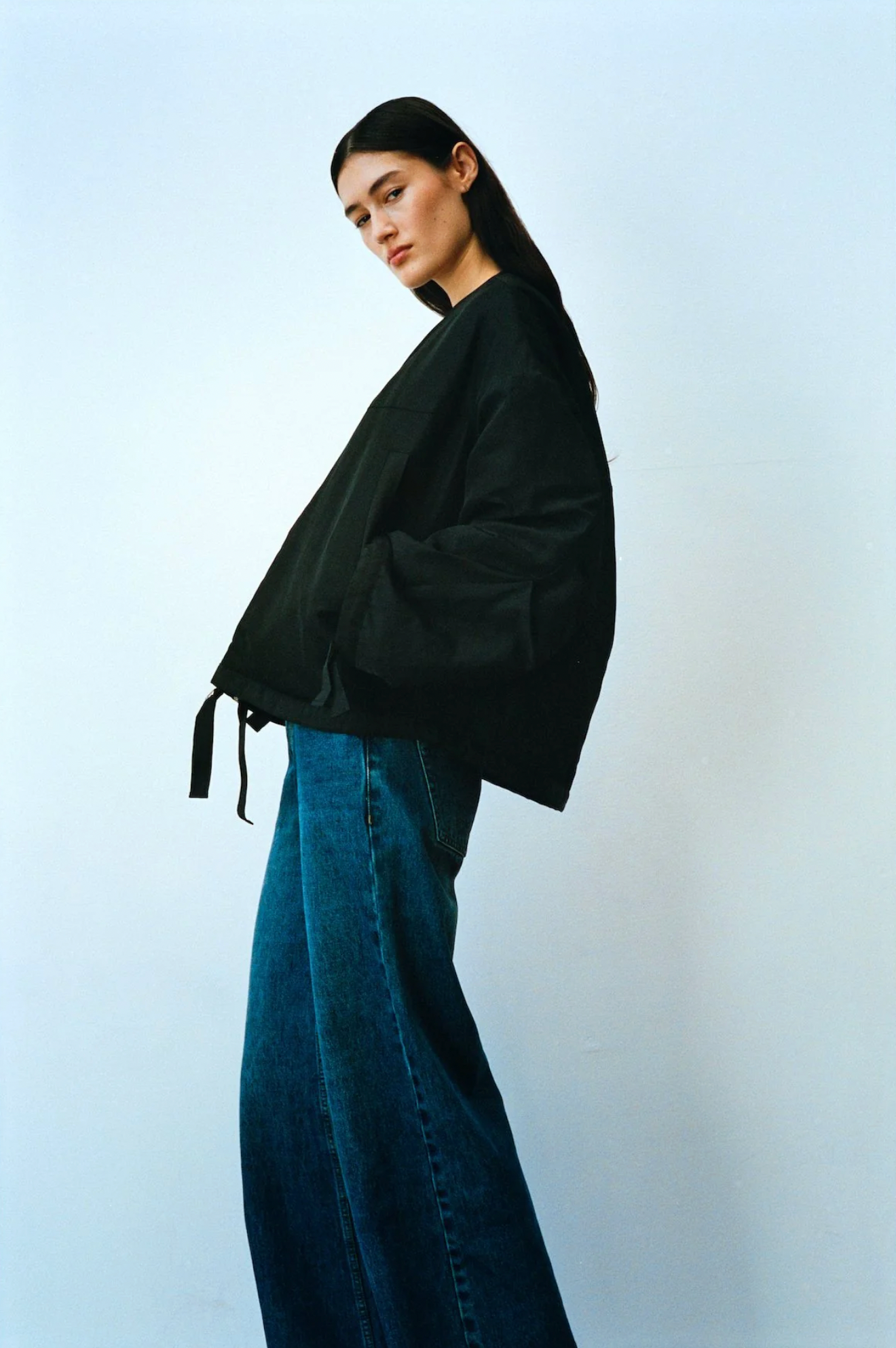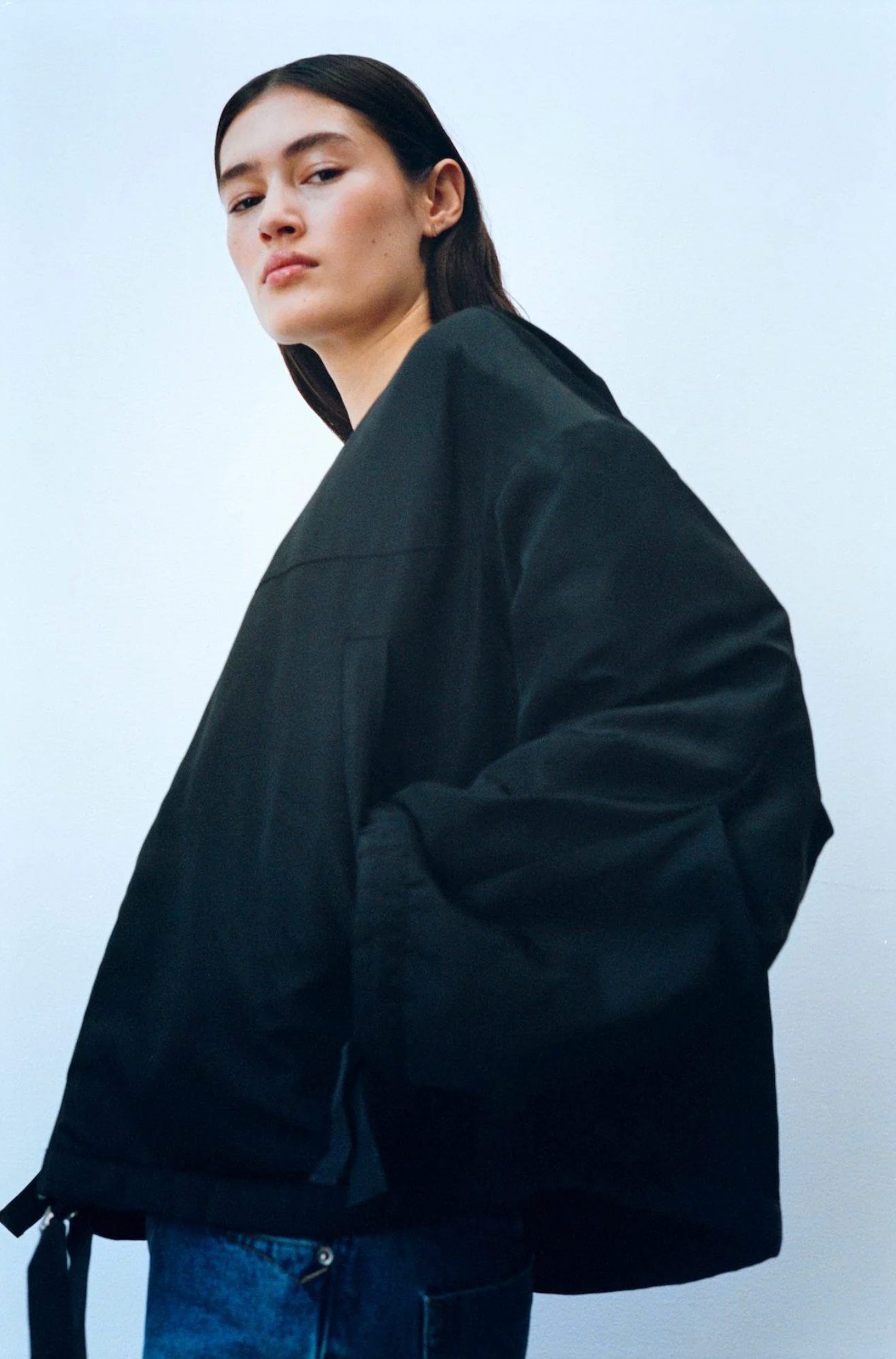 The jacket is designed with a short and boxy fit which gives it an edgy look and is detailed with side pockets, zipper closure and a lace gathering in the front.