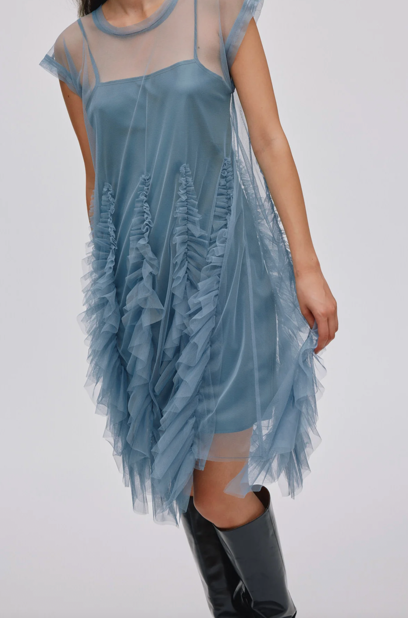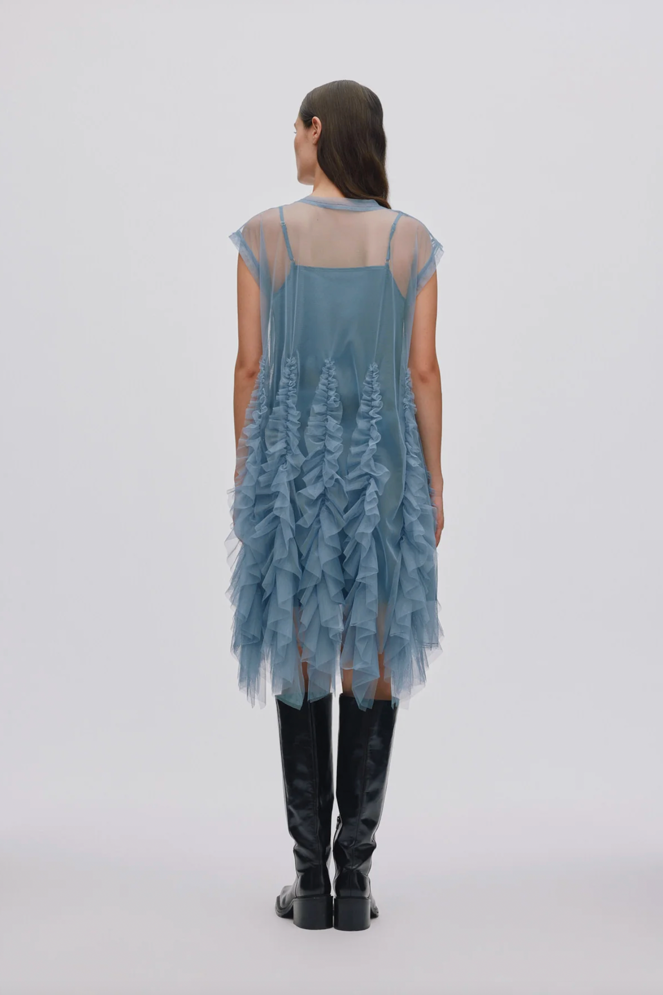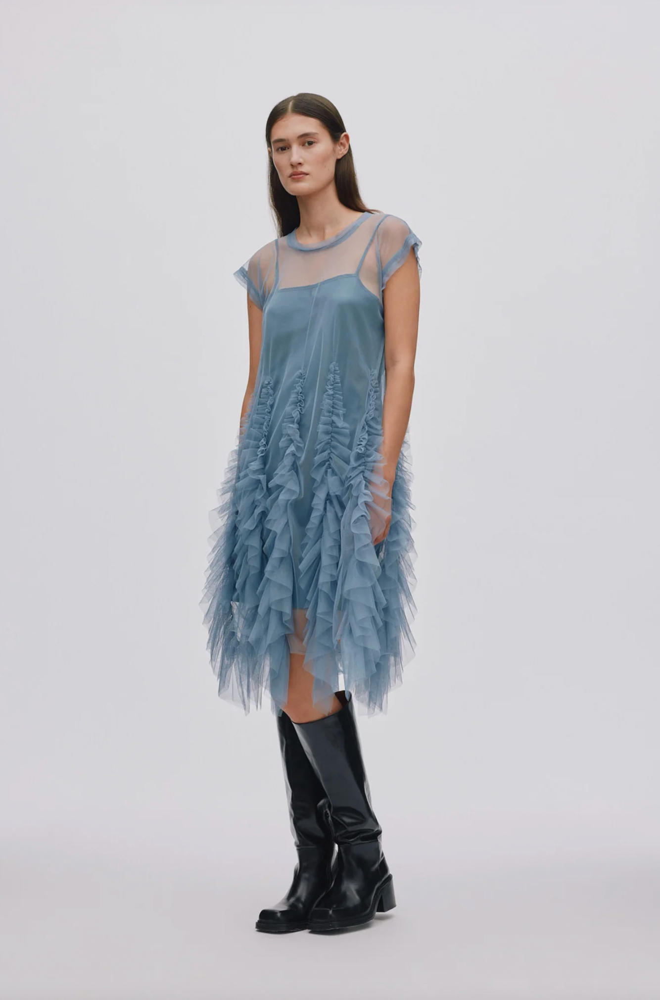 Crafted from a light see-through fabric, the tulle dress is perfect for layering. The relaxed silhouette is defined by small sleeves, a round neckline and a myriad of frills adding a refreshing playfulness to the piece.