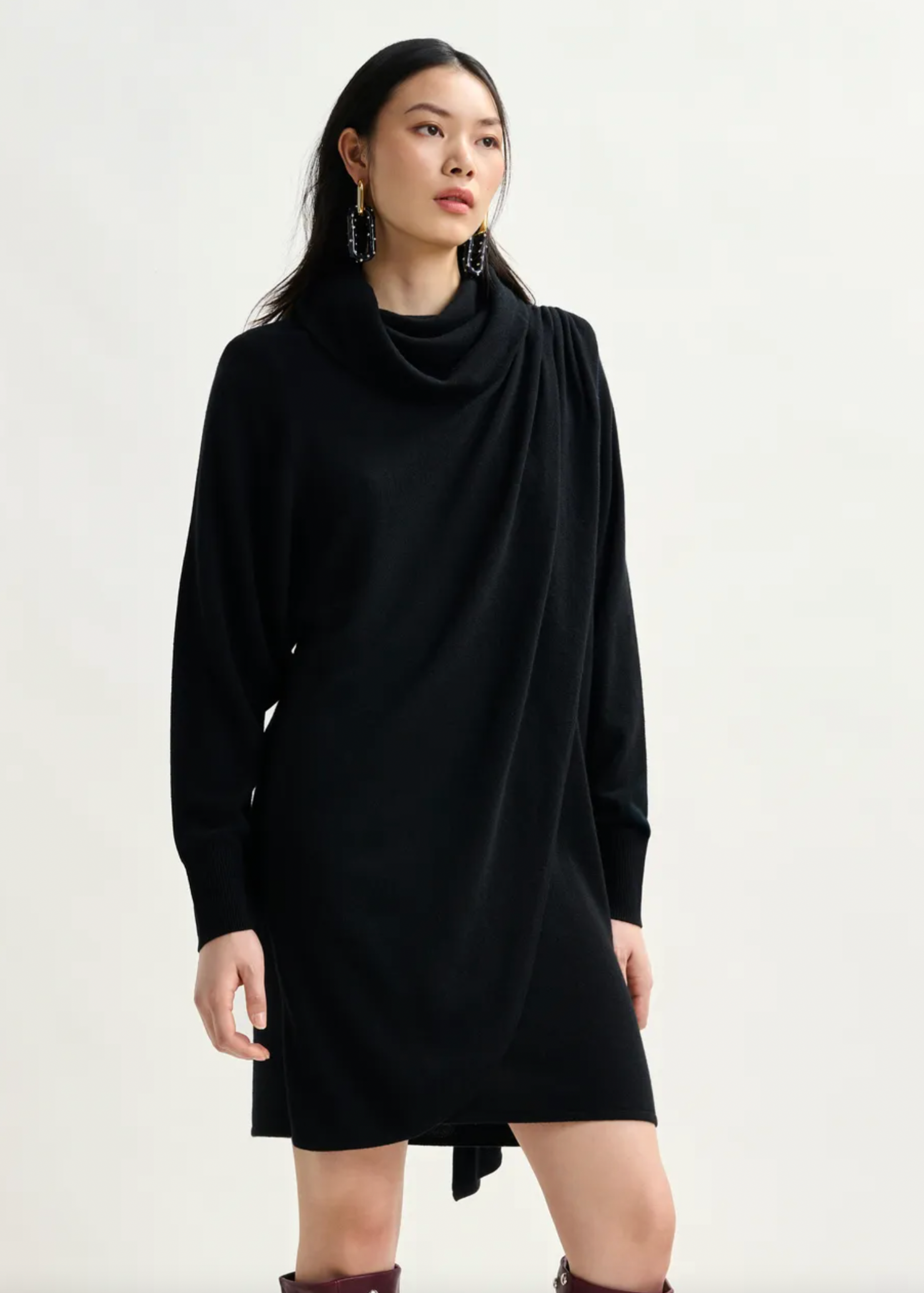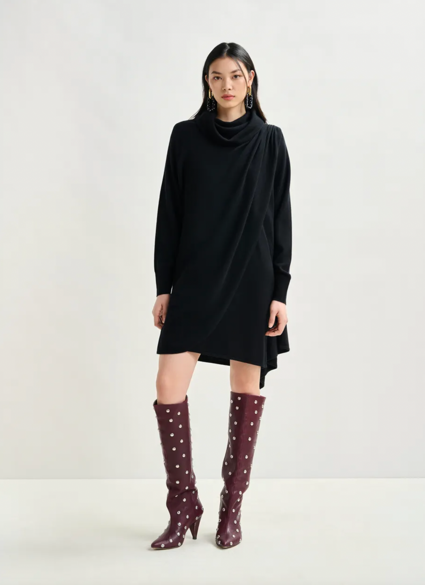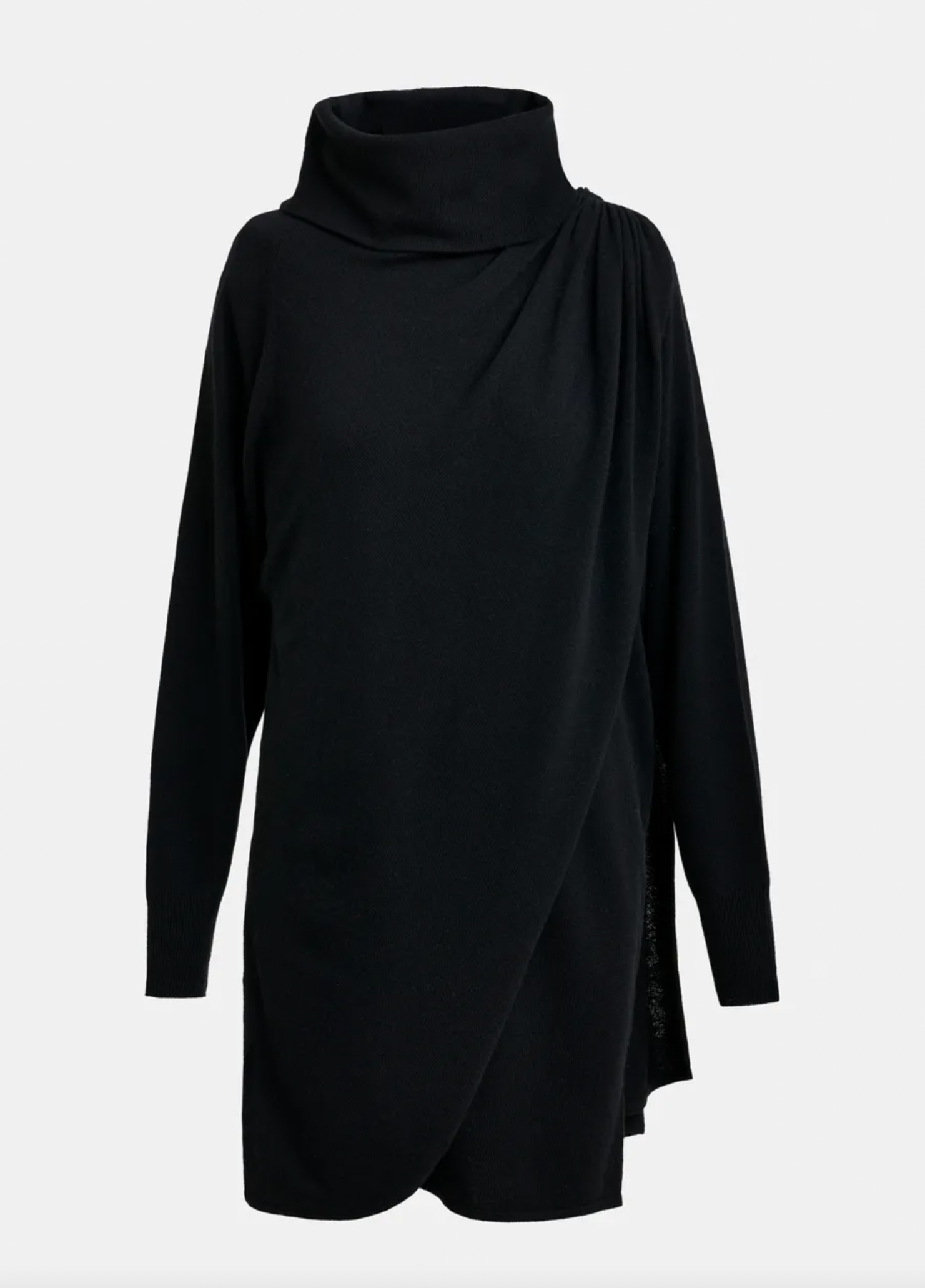 Draped wool-blend asymmetrical knit dress is crafted from a stretchy wool-blend fabric and offers a relaxed fit enhanced by structured removable shoulder pads and thoughtful tailoring. The turtleneck and ruched detailing at the shoulders and side seams of the waist create a sculptural silhouette, while the dramatic draping adds fluidity and movement.