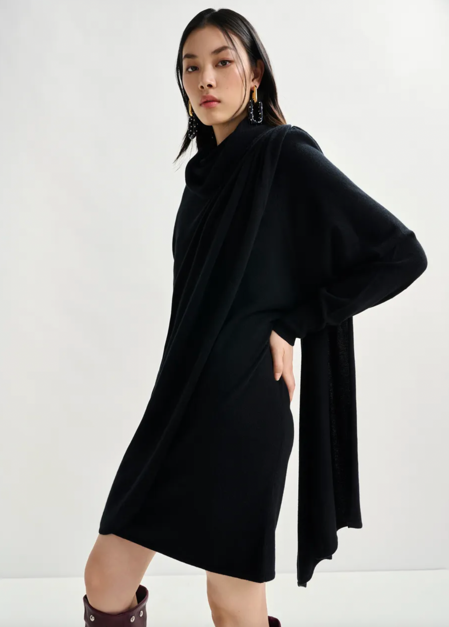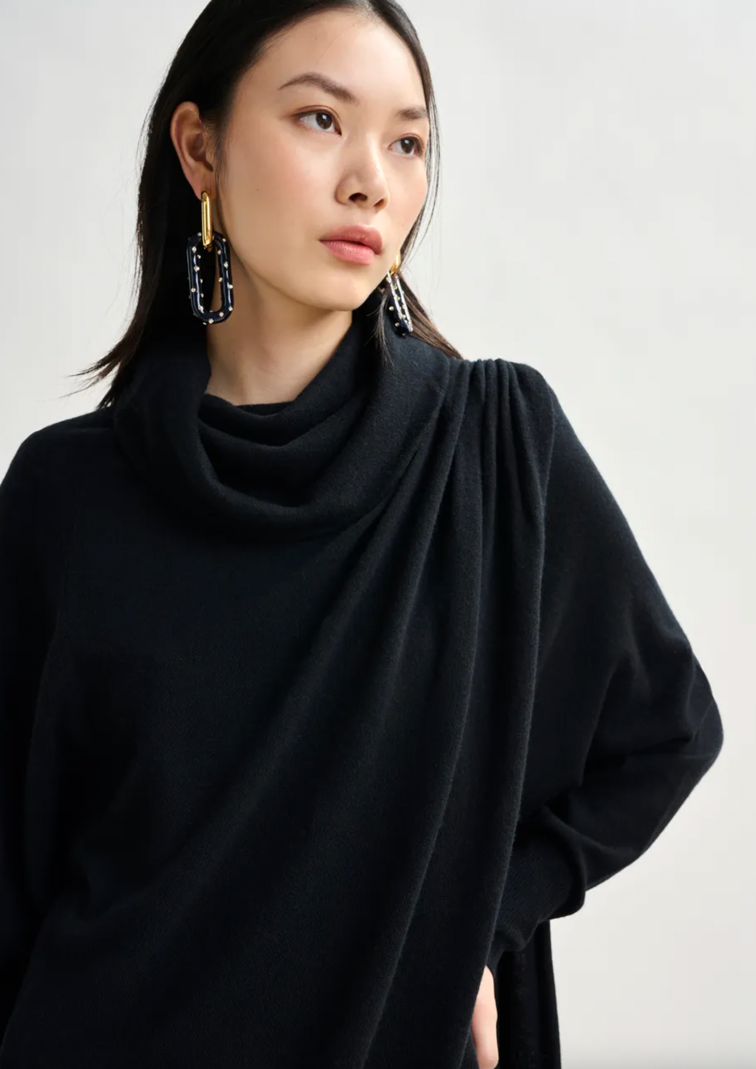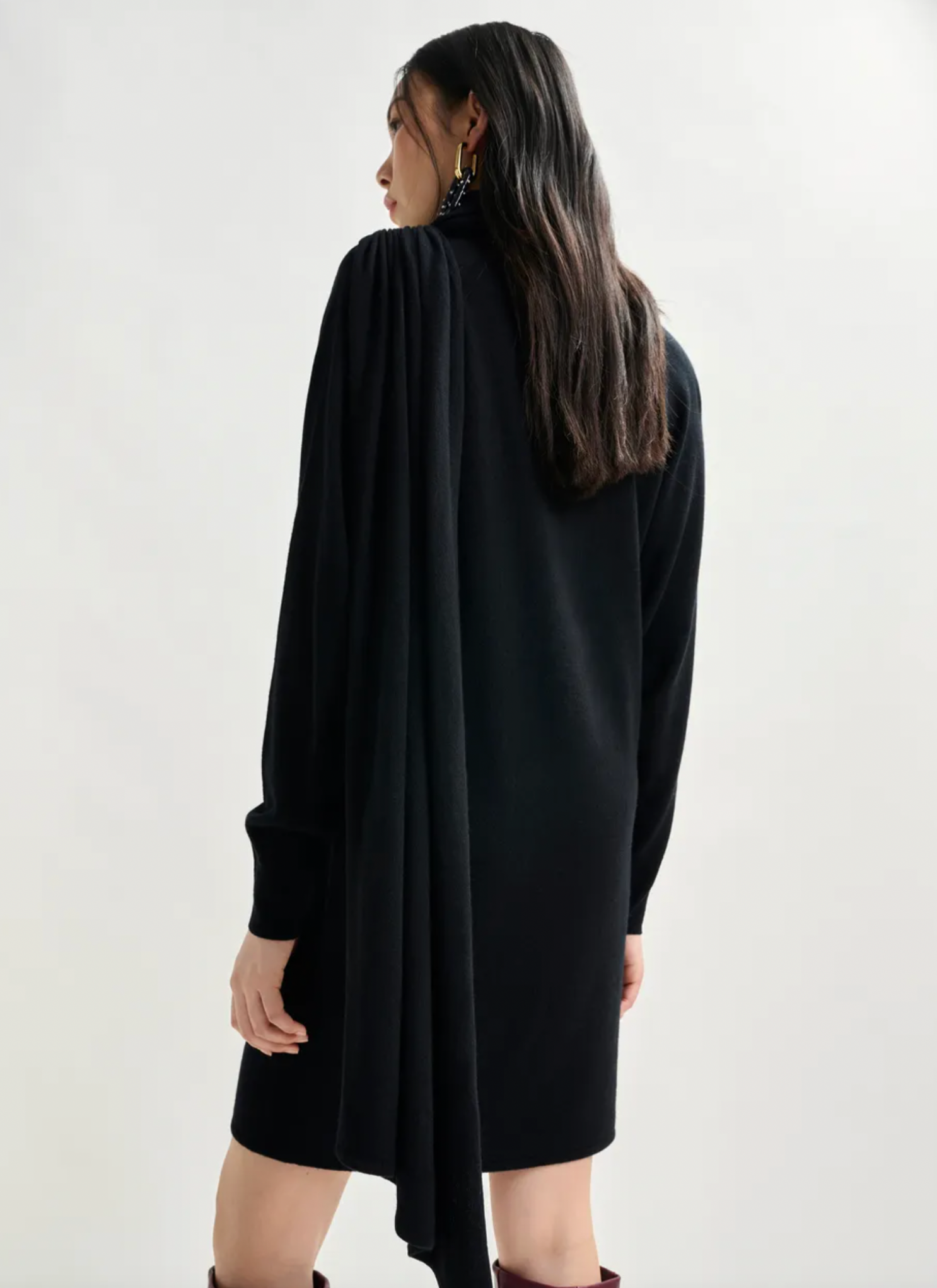 Draped wool-blend asymmetrical knit dress is crafted from a stretchy wool-blend fabric and offers a relaxed fit enhanced by structured removable shoulder pads and thoughtful tailoring. The turtleneck and ruched detailing at the shoulders and side seams of the waist create a sculptural silhouette, while the dramatic draping adds fluidity and movement.