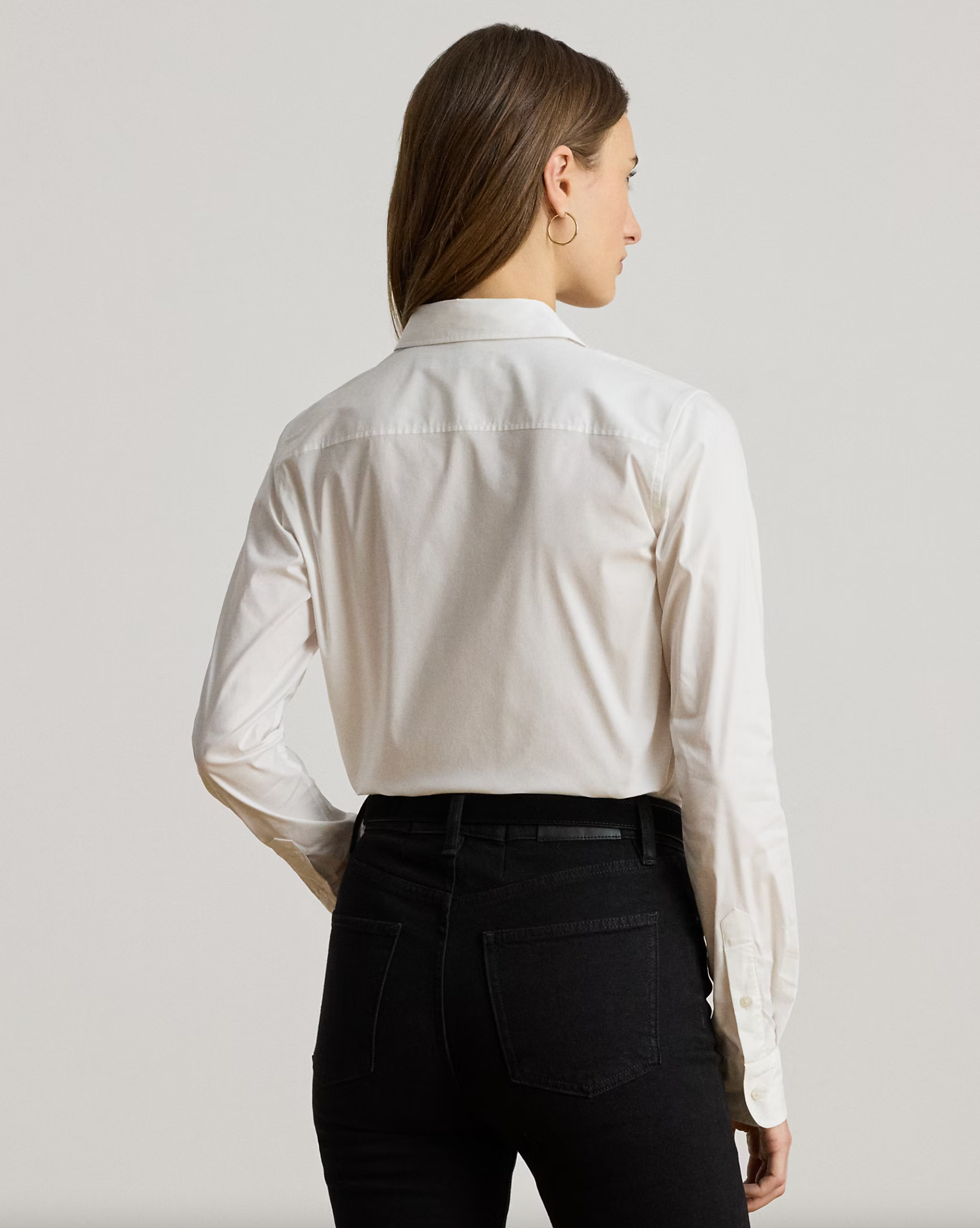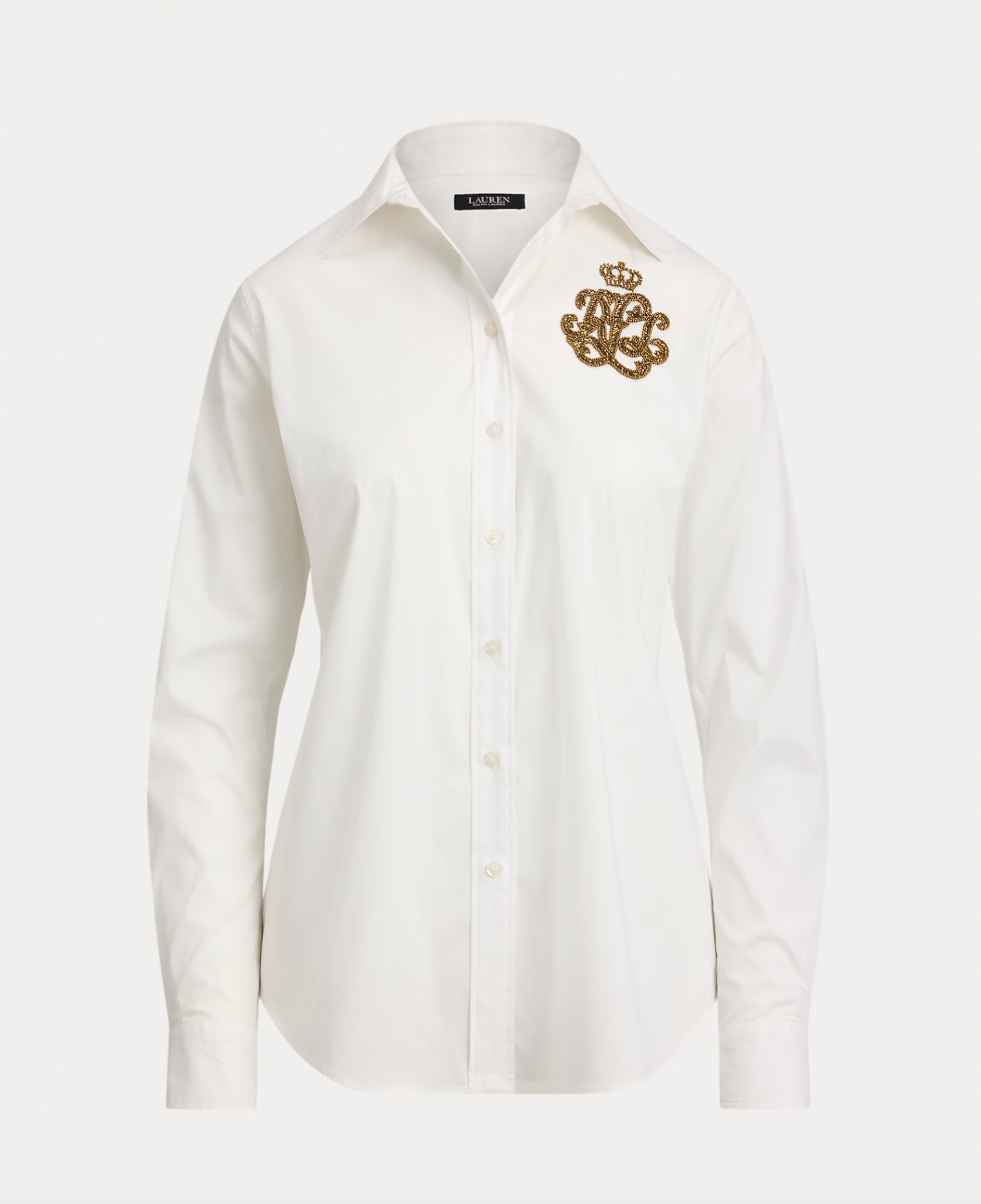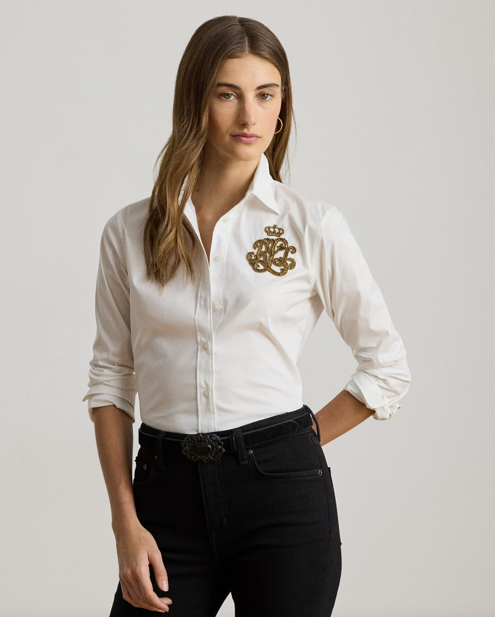 An enduring wardrobe staple, this button-up shirt is crafted with a stretch-cotton blend for a silky hand feel. A beaded “LRL” logo patch with a crown at the chest adds unmistakable Lauren Ralph Lauren style.