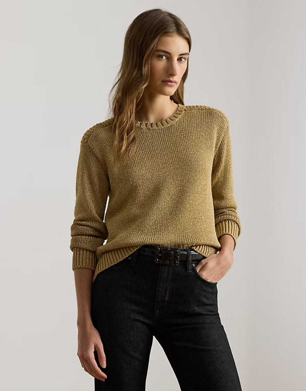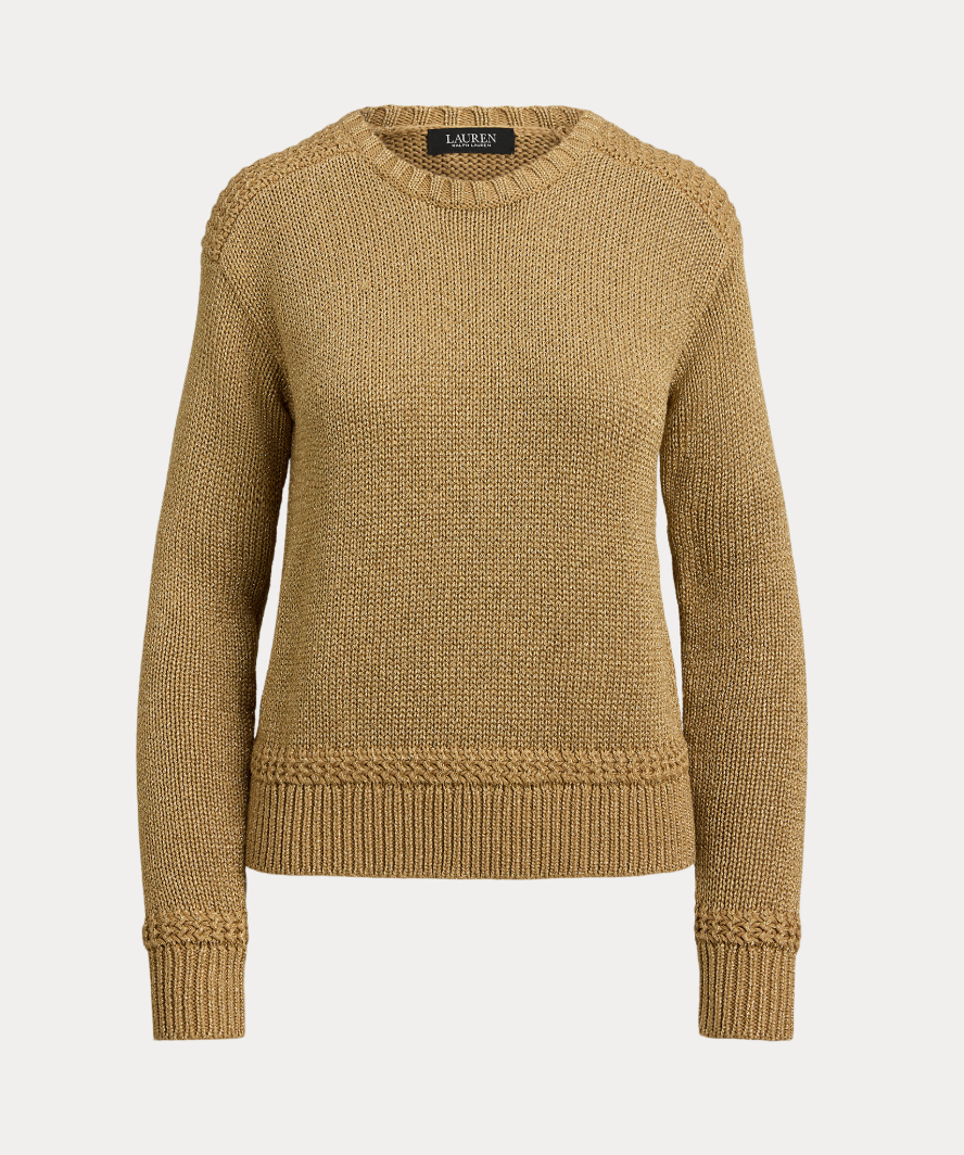 Rendered in a metallic cotton blend, this modern crewneck jumper is finished with rack stitching at the shoulders, cuffs and above the hem.