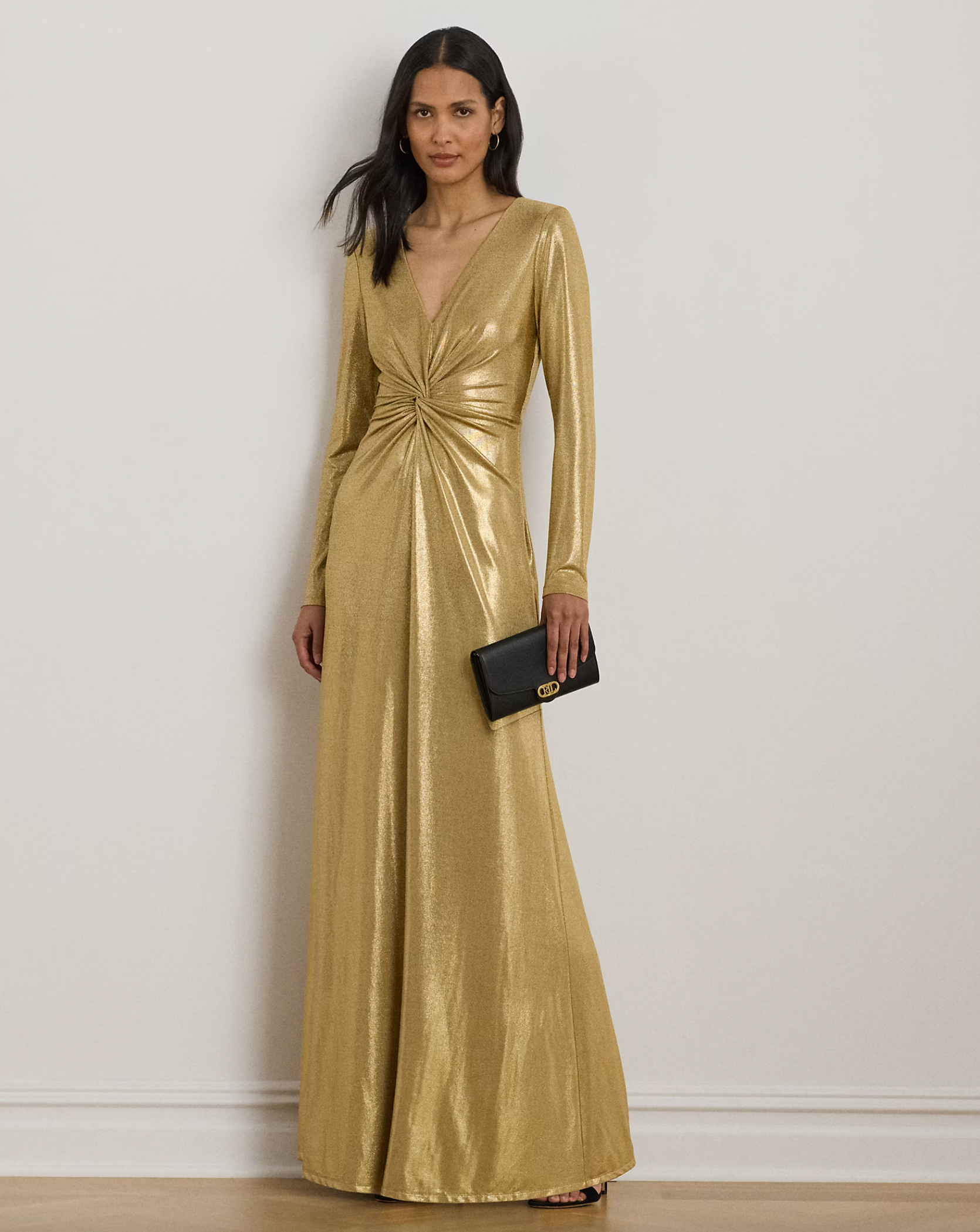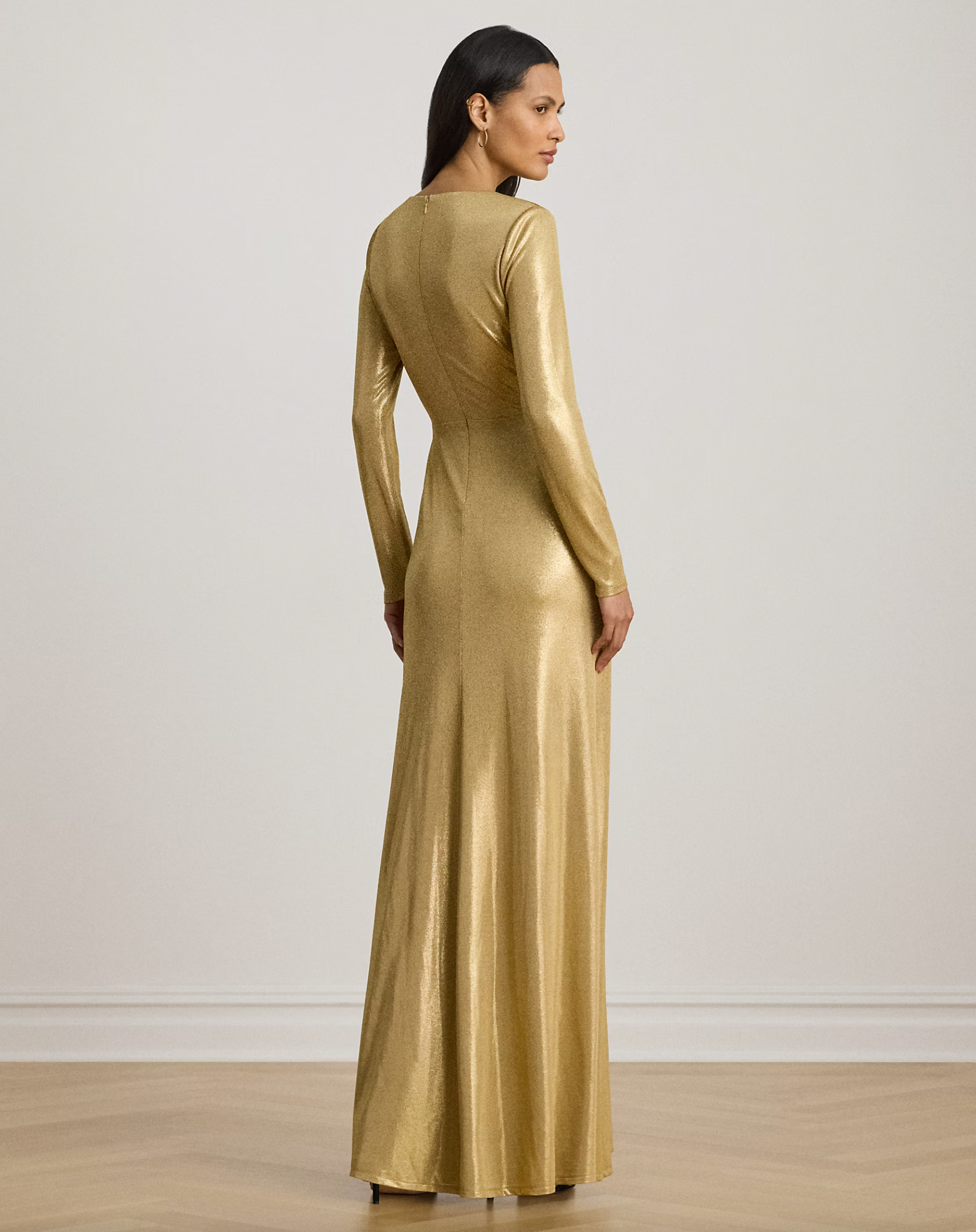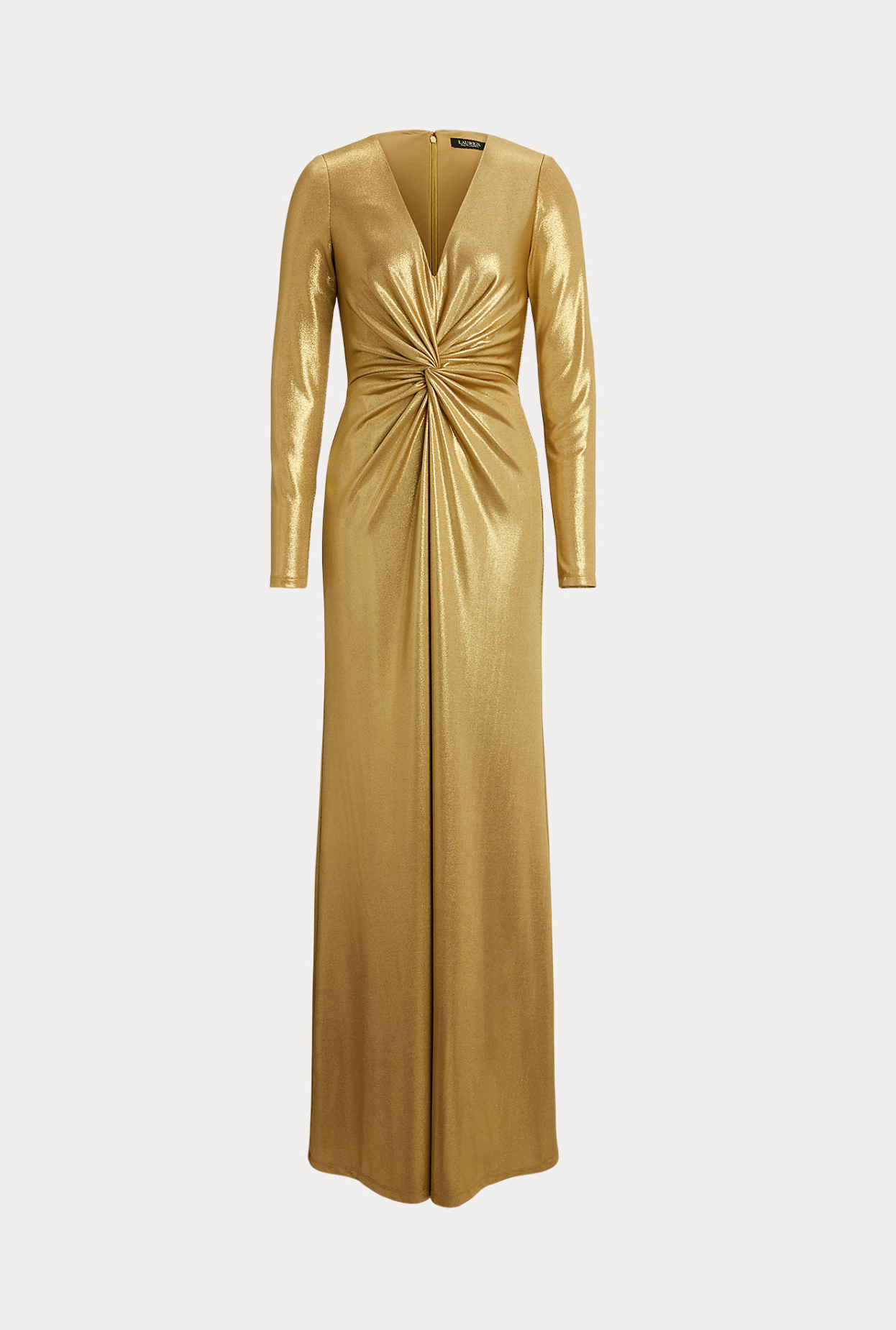 Cut from stretch jersey with a metallic finish, this evening gown is characterised by a twist-front accent and a statuesque column silhouette, making it a striking choice for your next occasion.