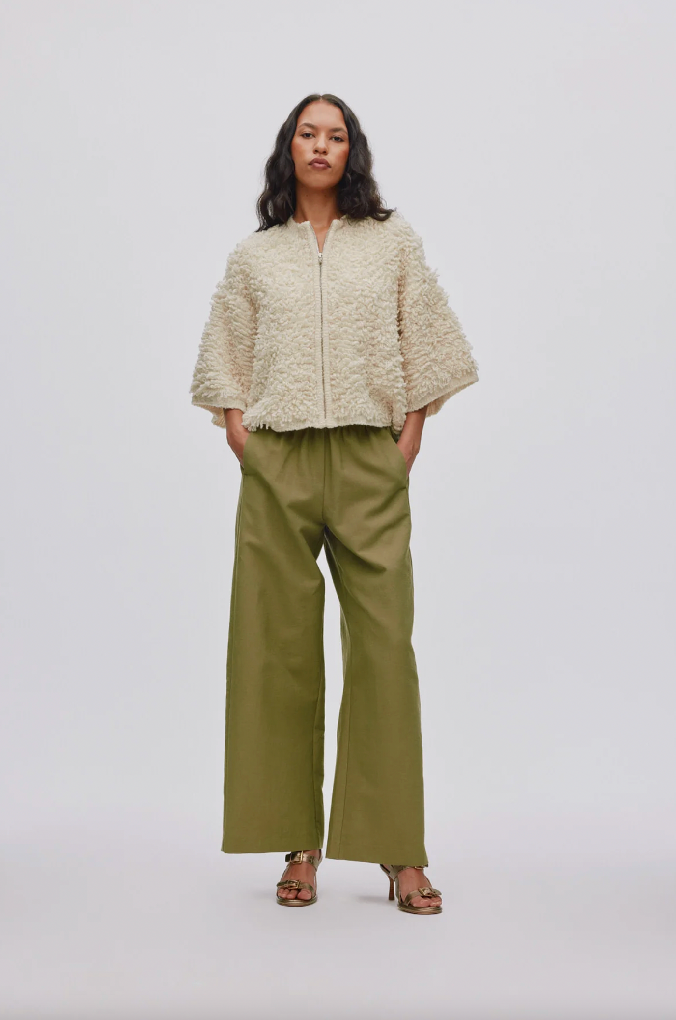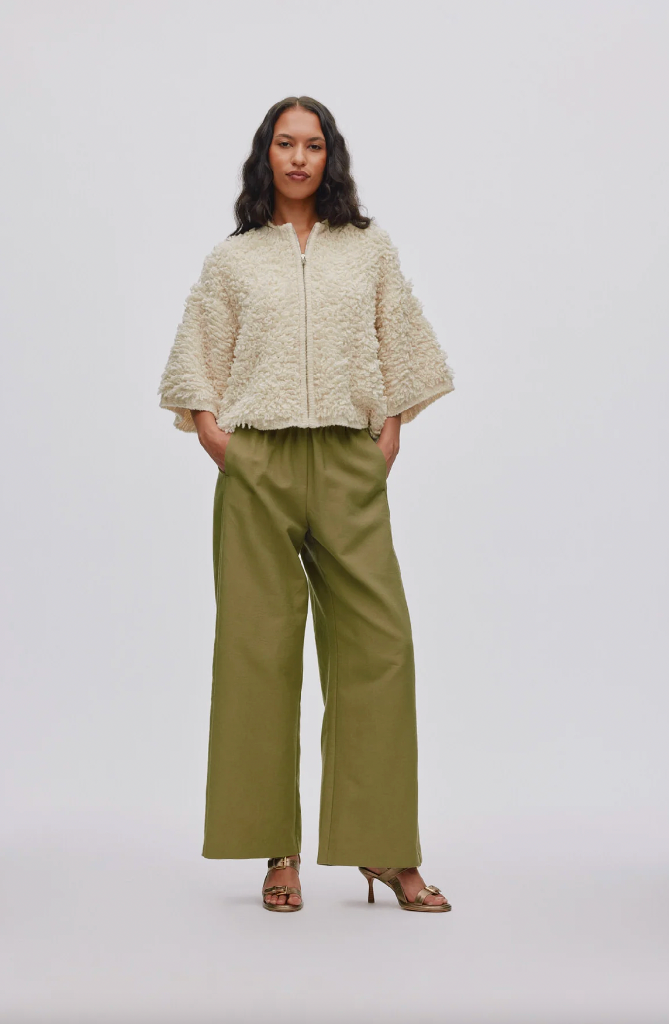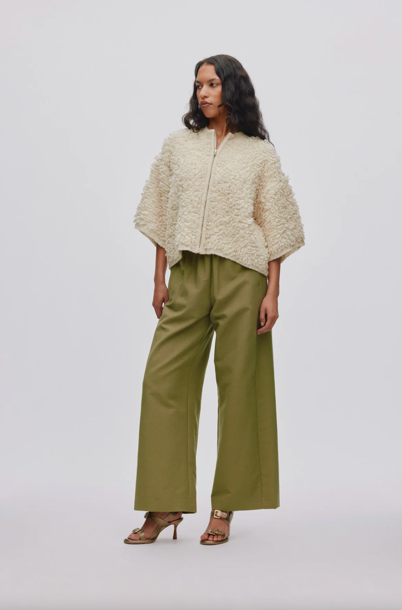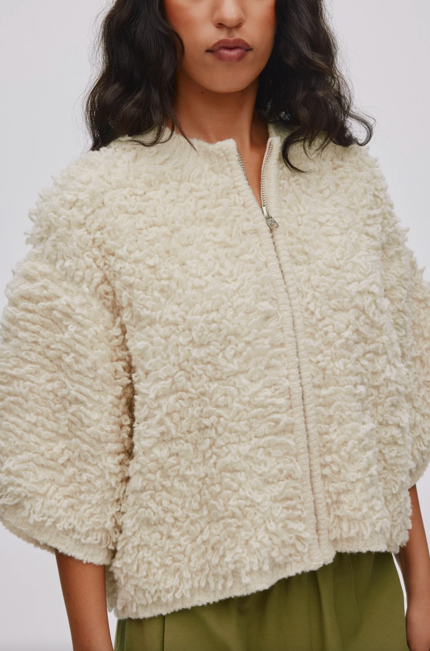 The cardigan features a short, oversized silhouette with cropped, oversized sleeves, a round neckline, a front zip closure and ribbed hems.
