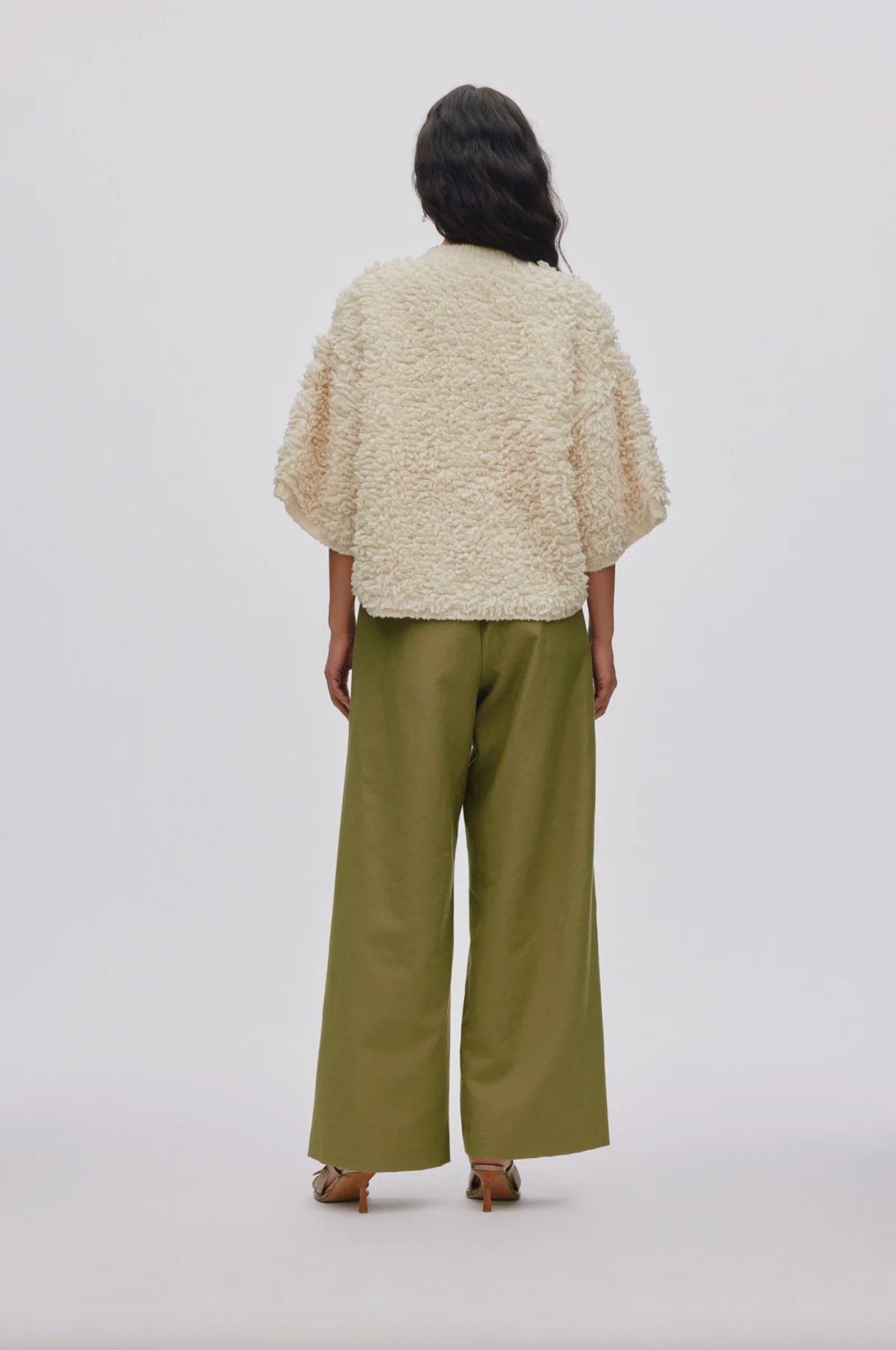 This knitted lambswool cardigan stands out with a distinctive fluffy texture that feels exceptionally soft and comfortable.