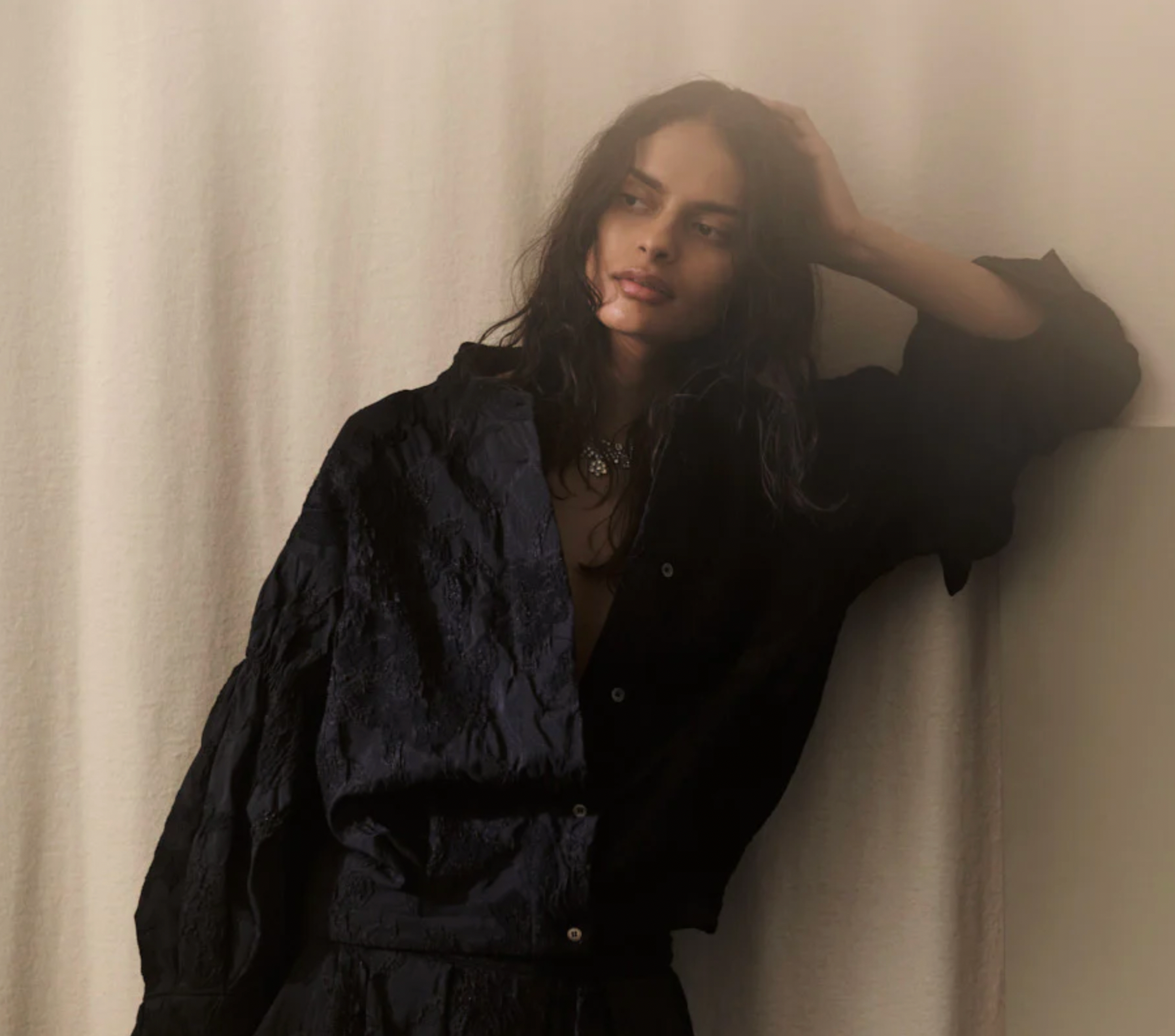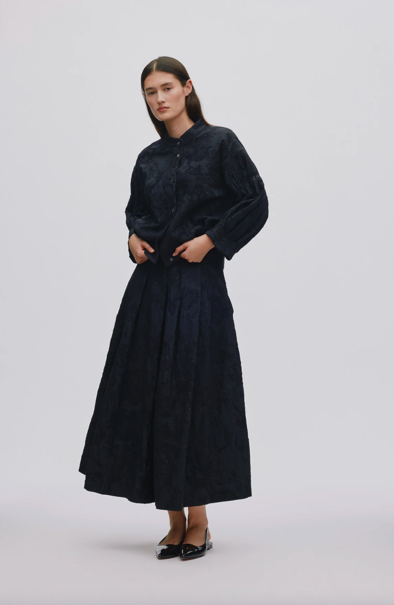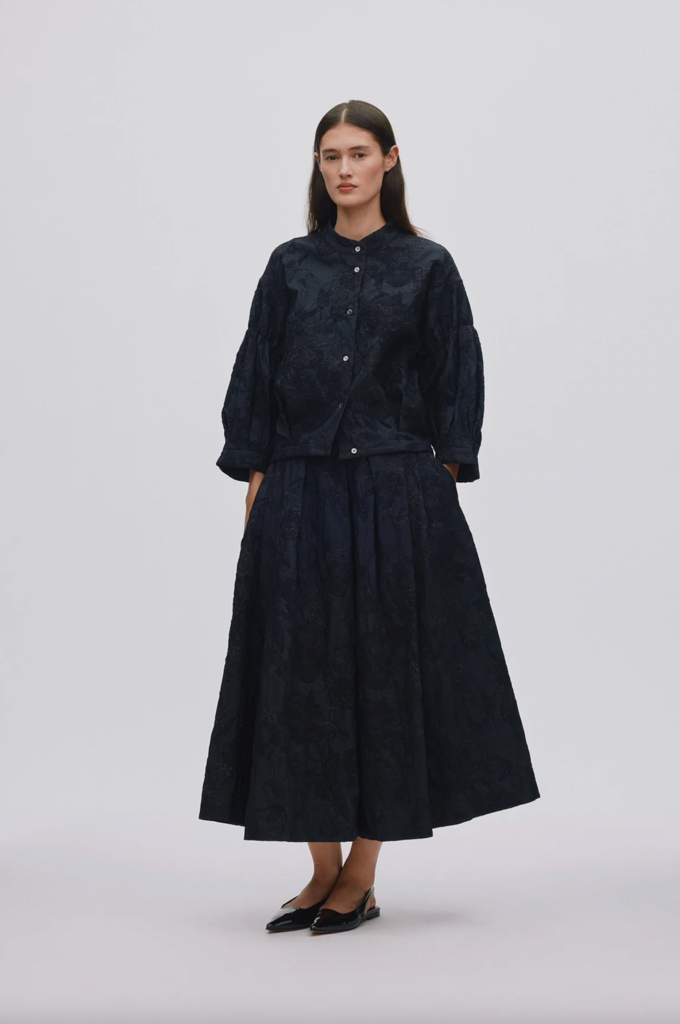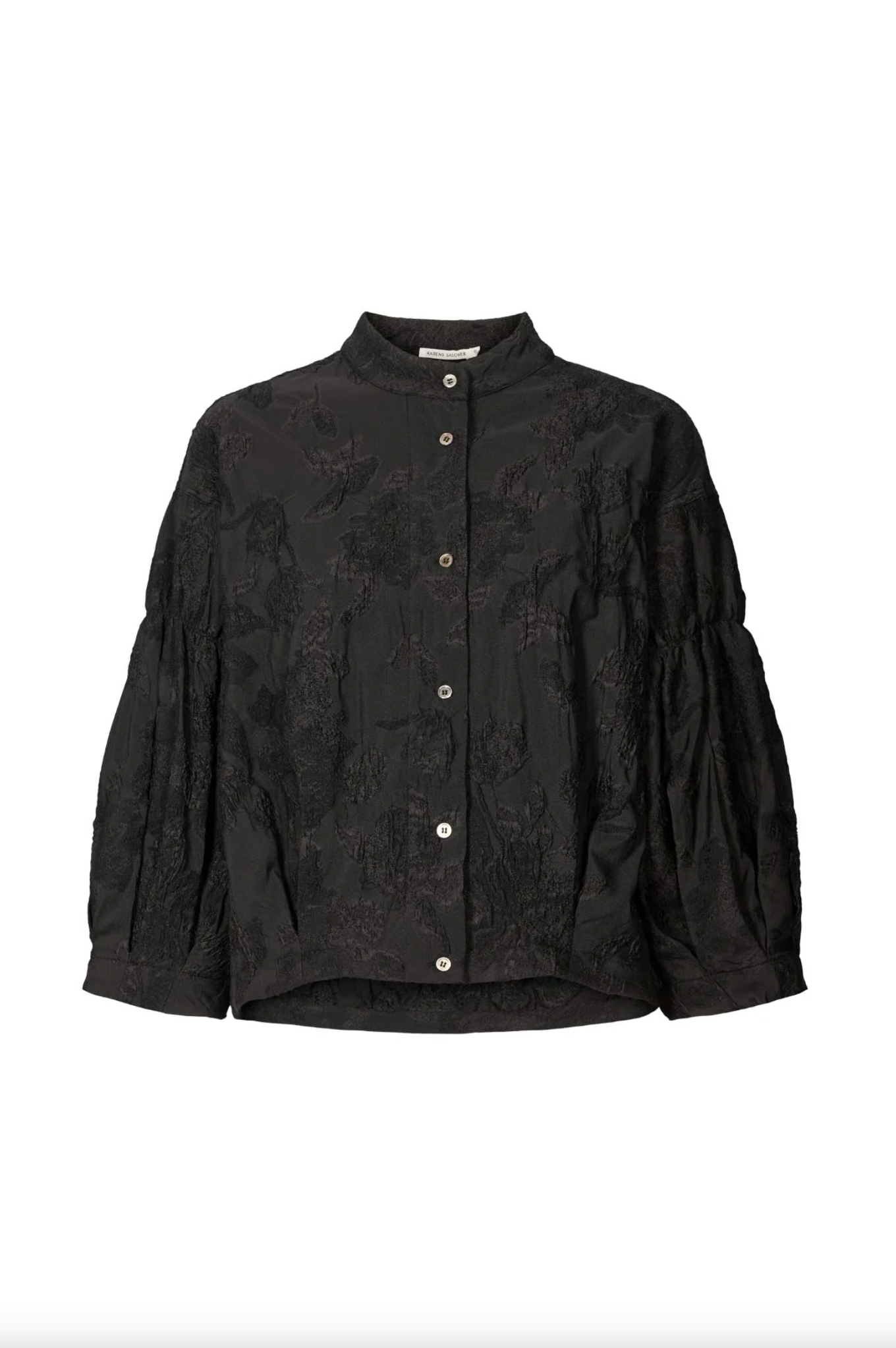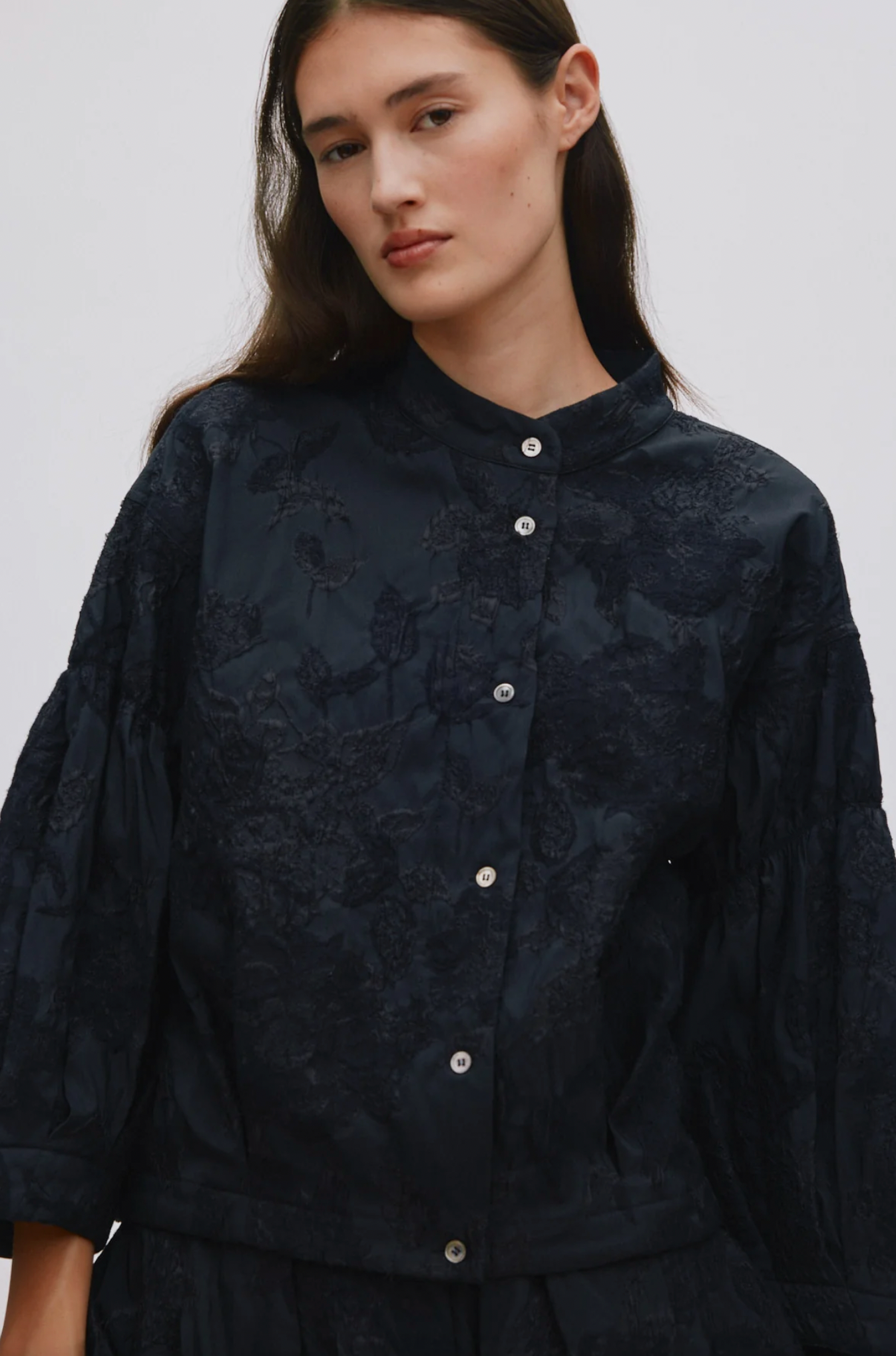 The shirt jacket is crafted from a delicate jacquard fabric with a stunning pattern. It is defined by a flattering cut with cropped sleeves standing out with volume and gathered details. It features a classic collar and a button-down front.