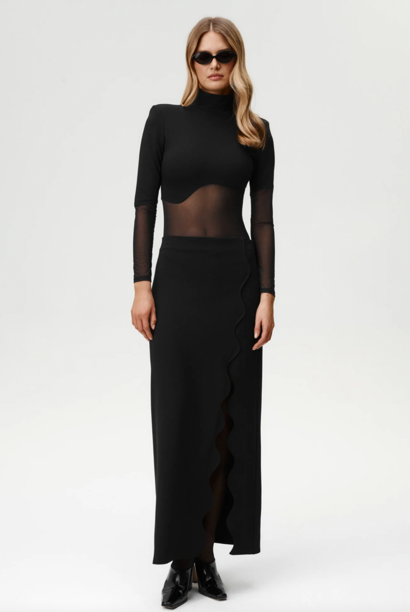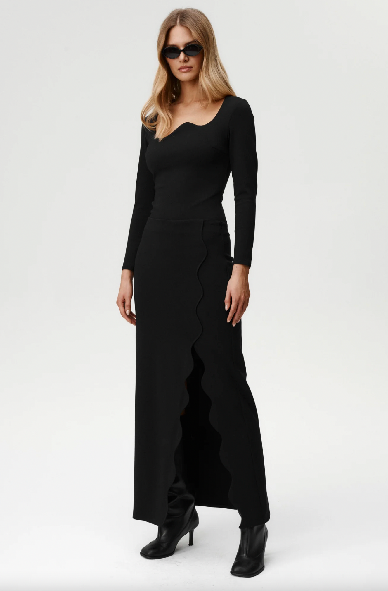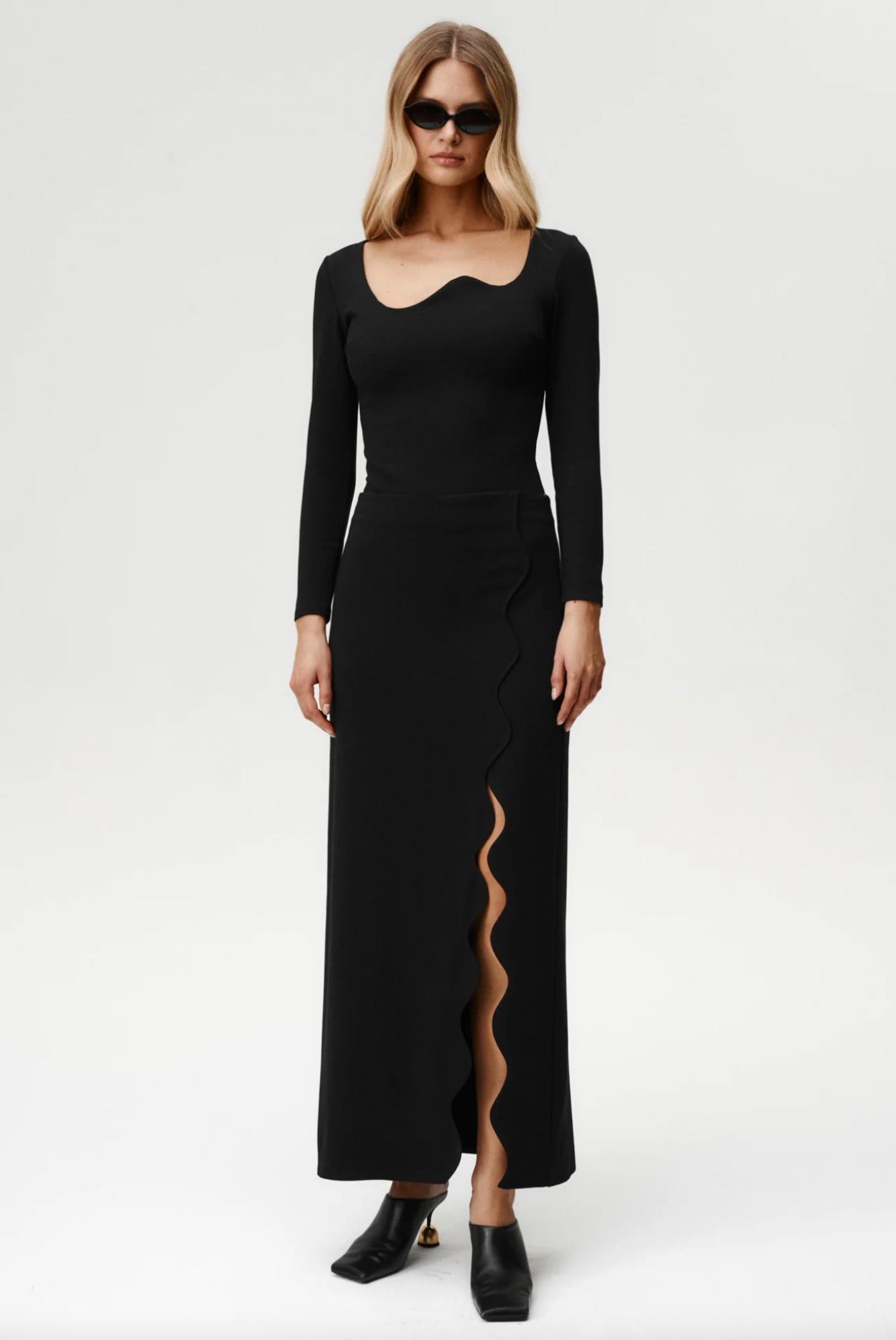 The Ariel Skirt brings a bold twist to a timeless silhouette. Its maxi length flows to the ankle, while the dramatic wave-shaped slit creates movement and showcases the leg in striking fashion. Made from classic punto fabric, it drapes smoothly over the body.The clean lines of the cut let the sculptural slit take center stage, making Ariel both refined and powerfully modern. Style it your way — pair with the Twin Flame Bodysuit, Mademoiselle Bodysuit, or My Element Bodysuit for a sleek evening look. And if you prefer a a slightly more statement look mix it with our signature swimsuit Chic Top or Bardot Top.