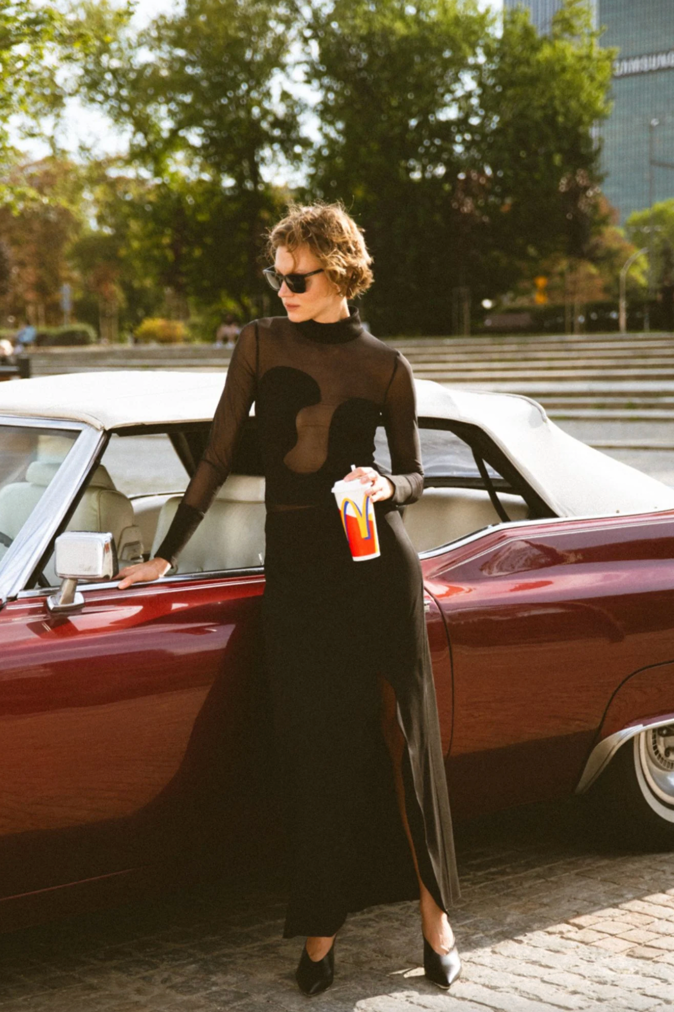 Dramatic wave-shaped slit for movement and leg reveal.