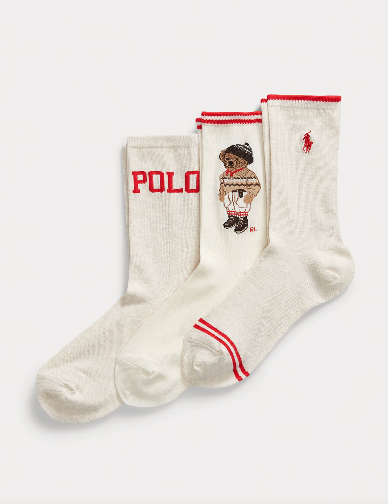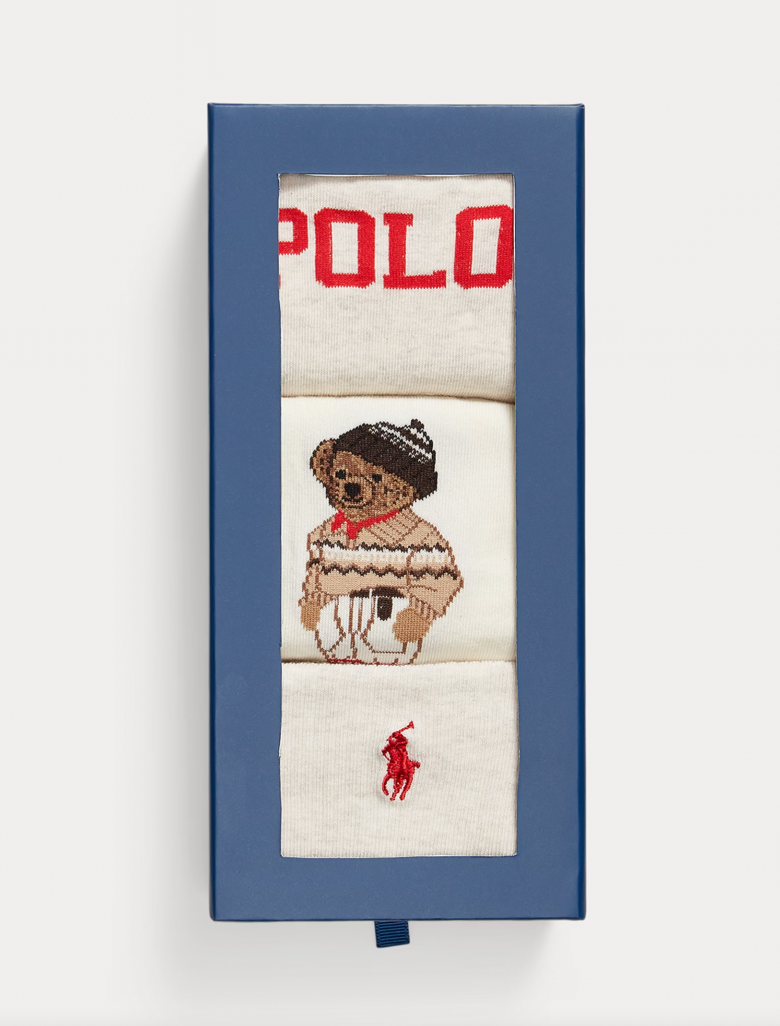 Presented in a signature gift box, this soft cotton-blend set includes three pairs of crew socks: one featuring the Polo Bear, one with a geometric motif and one with classic striped trim.