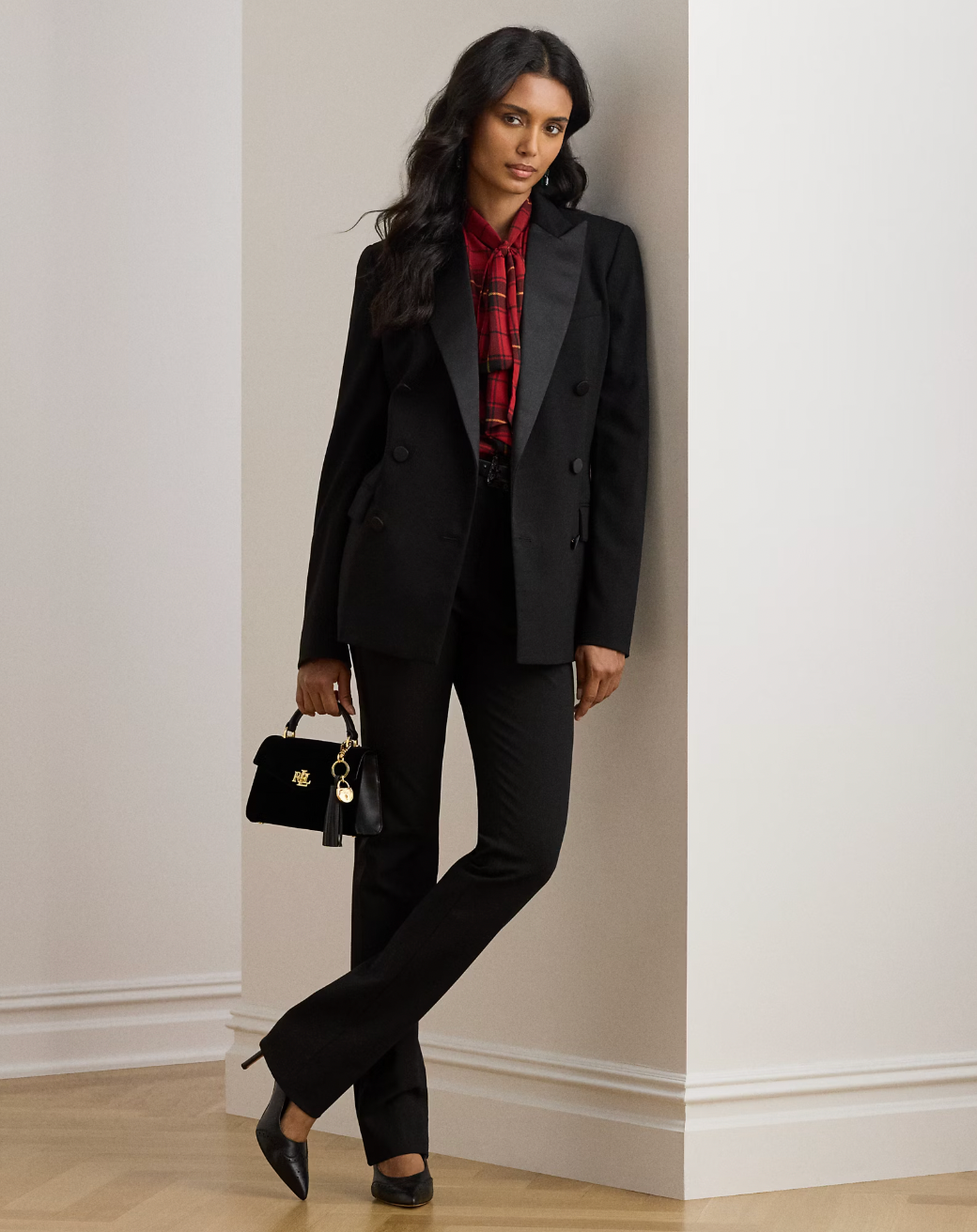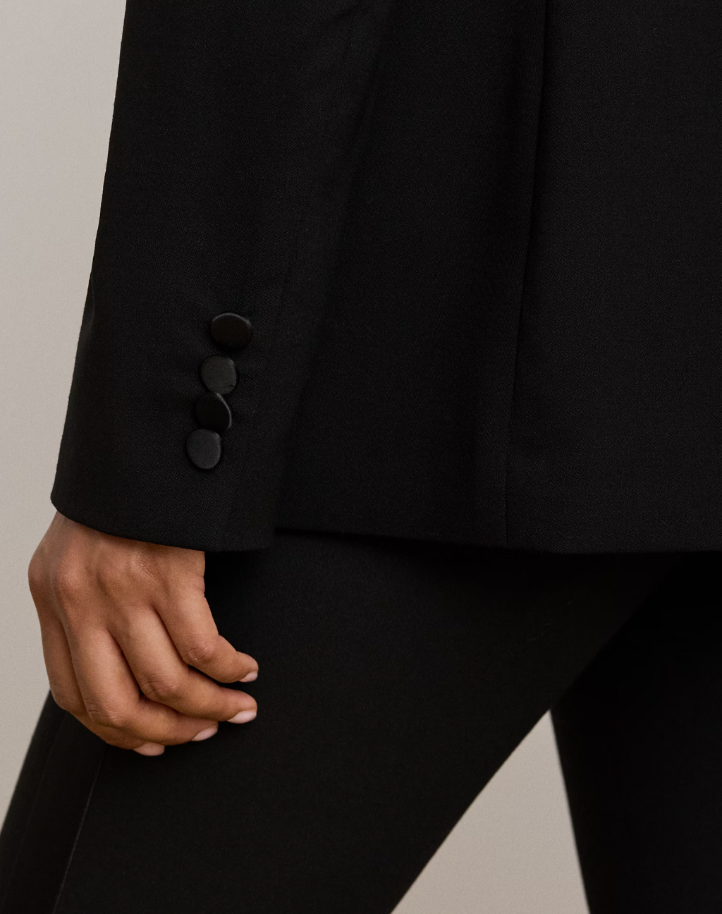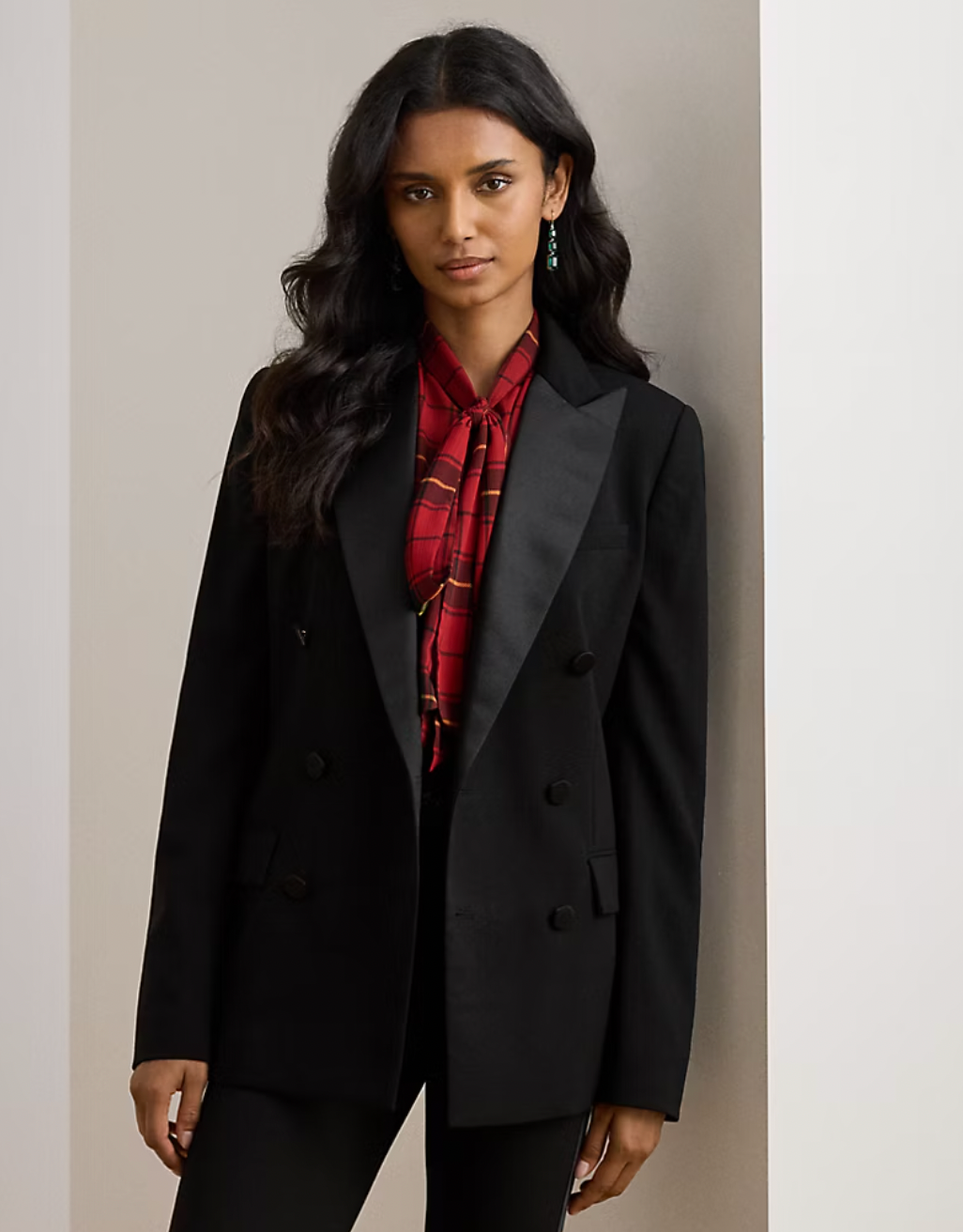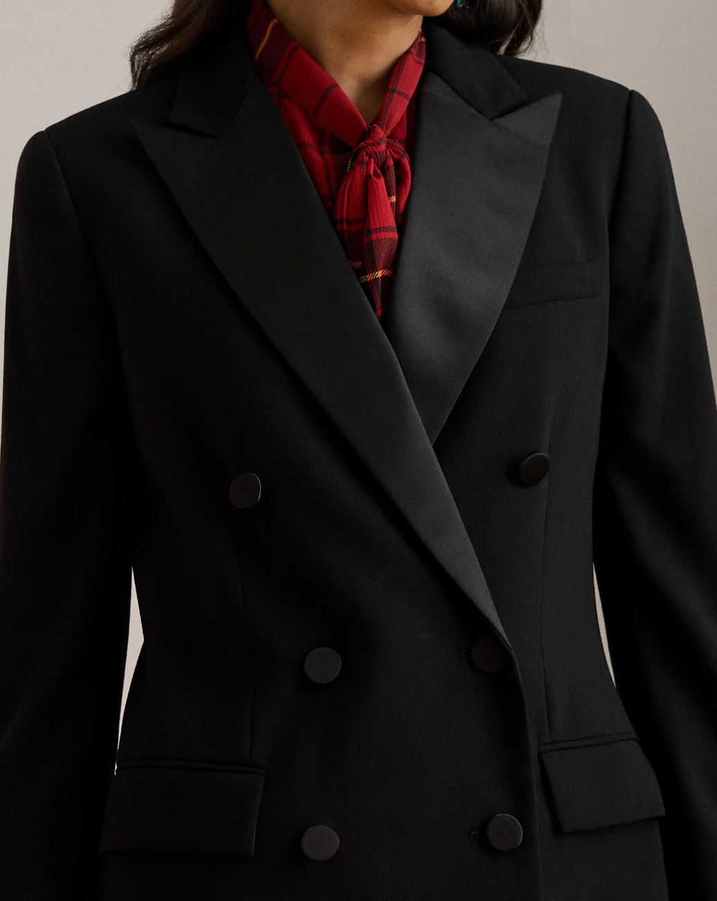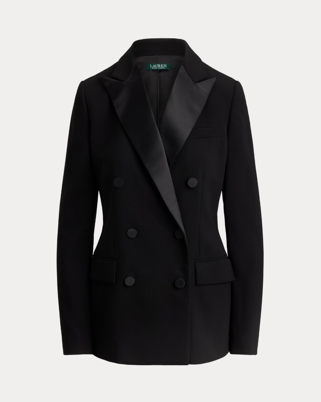 Drawing inspiration from traditional tuxedo jackets, this double-breasted blazer features a streamlined, double-faced crepe silhouette detailed with lustrous satin peak lapels.